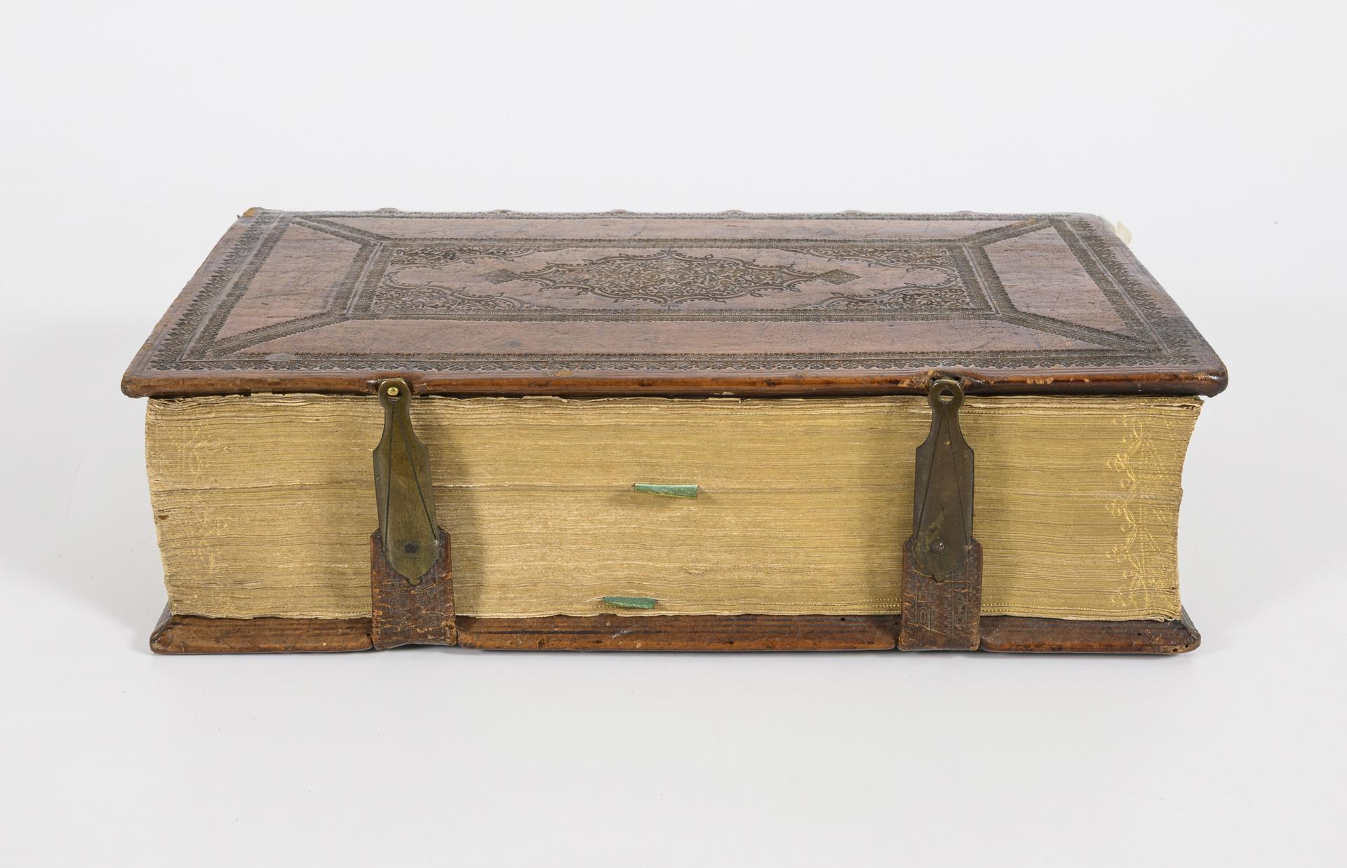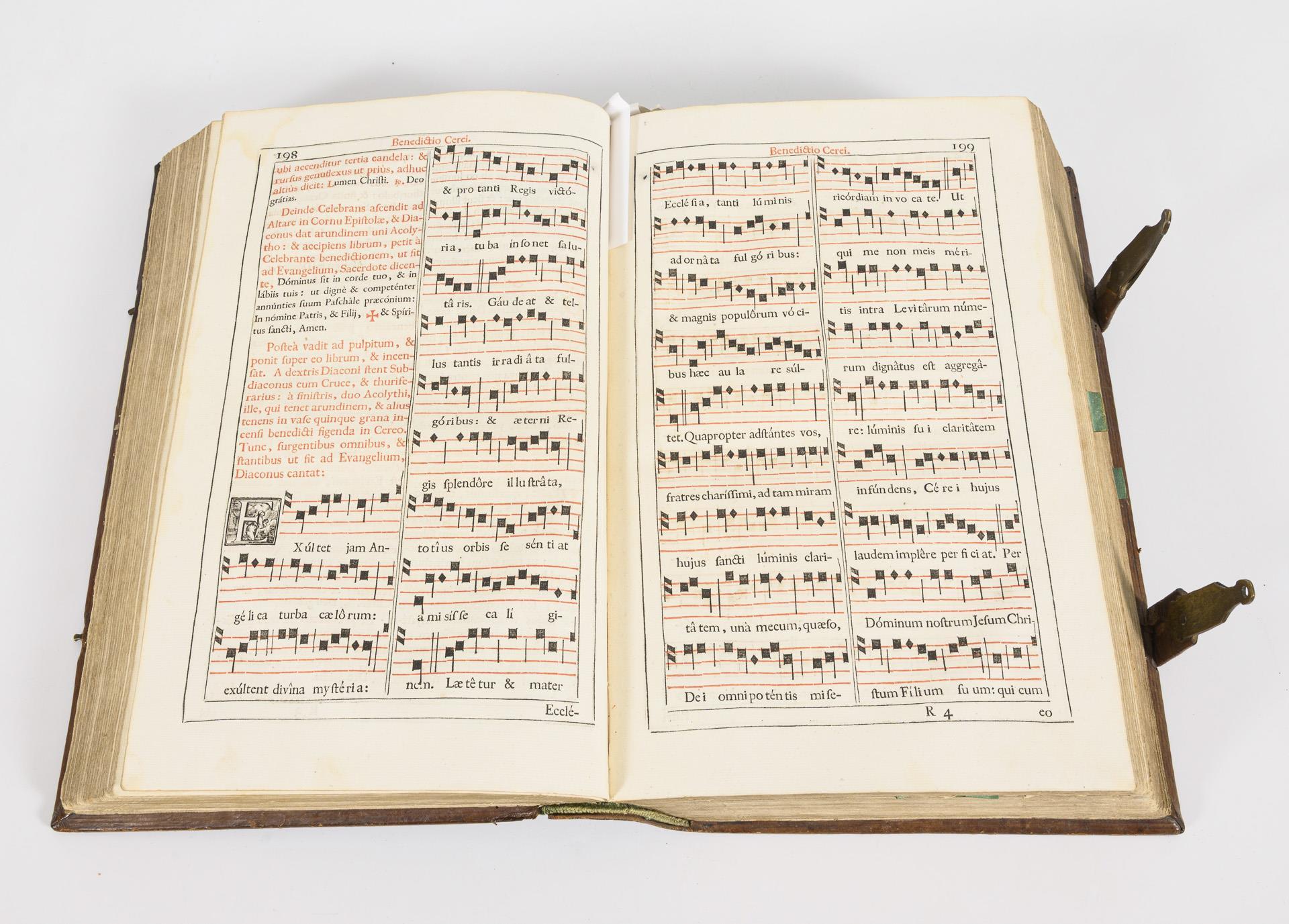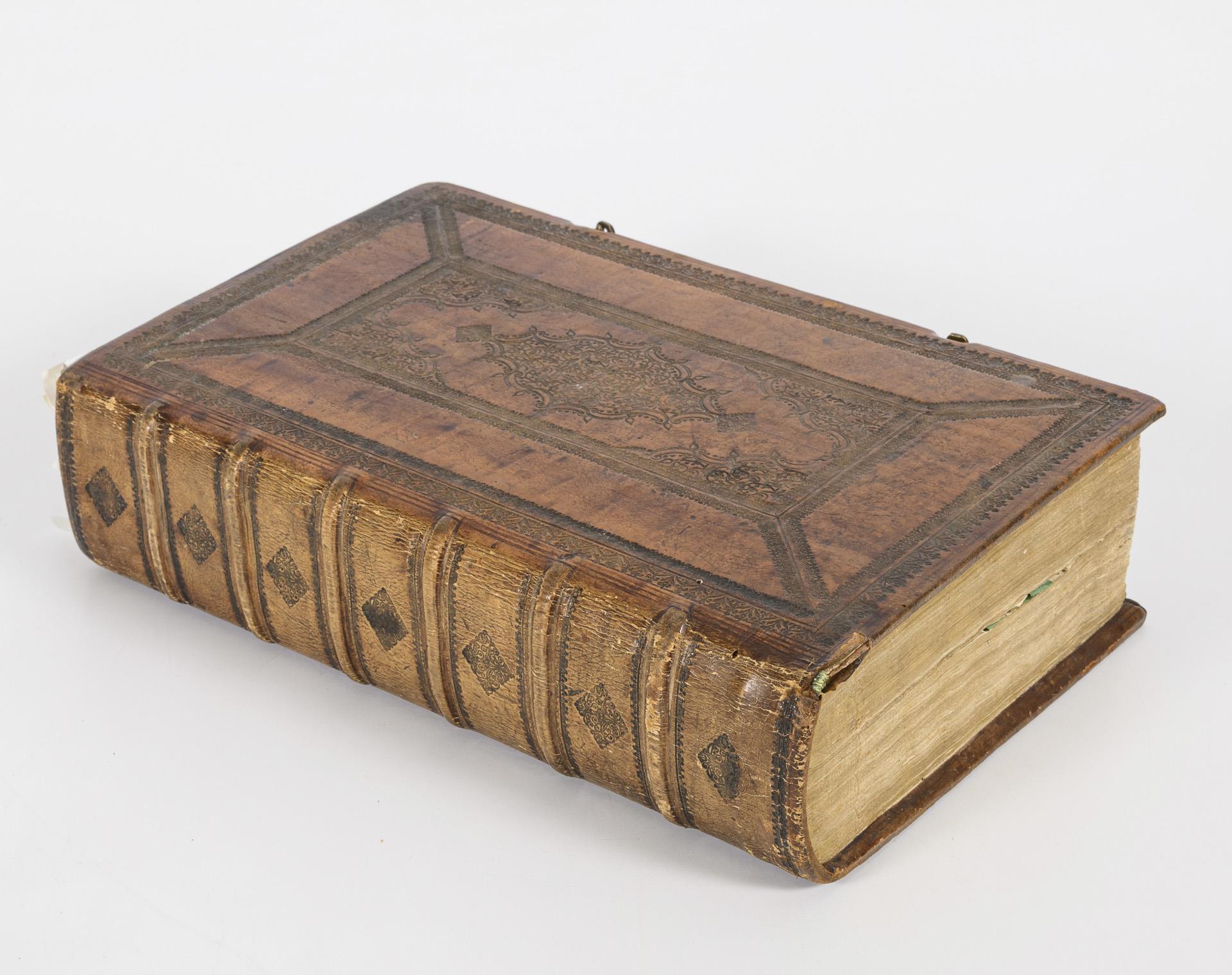 Vortitel, Titelkupfer, Titel, (68), 632, 125, (9), 45, (2) Seiten. Zweispaltig in roter und schwarzer Schrift, mit Noten und bildlichen Initialen. Zahlreiche ganzseitige Kupferstiche, Im Innendeckel farbig gezeichnetes Wappen. Im schön geprägten Ledereinband mit Schließen. Nicht kollationiert. Altersgemäß sehr schöner Zustand, sogar noch mit Resten des Goldschnitts. Blätter an den Reitern eingerissen.