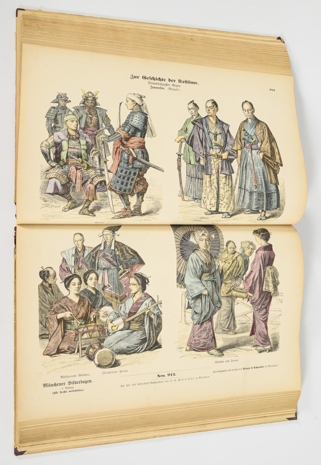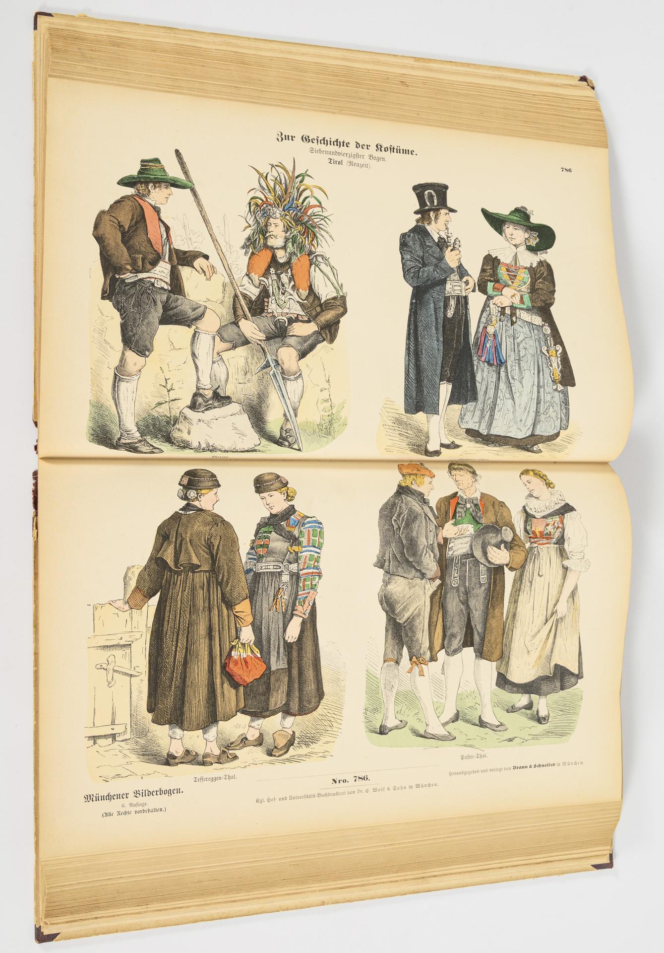 Vielzahl kolorierter Holzschnitttafeln, jeweils zweiseitig mit Kostümdarstellungen aller Zeiten. Münchner Bilderbogen. Im Halbleineneinband. Altersgemäße Gebrauchsspuren.