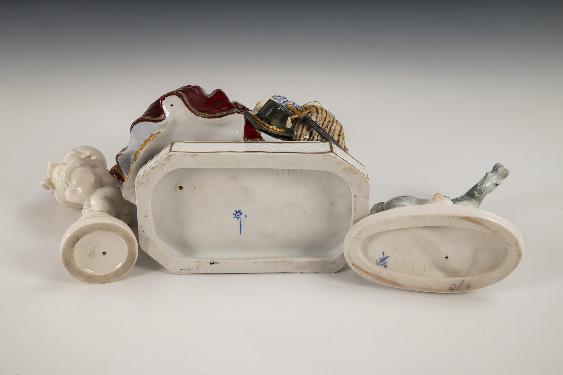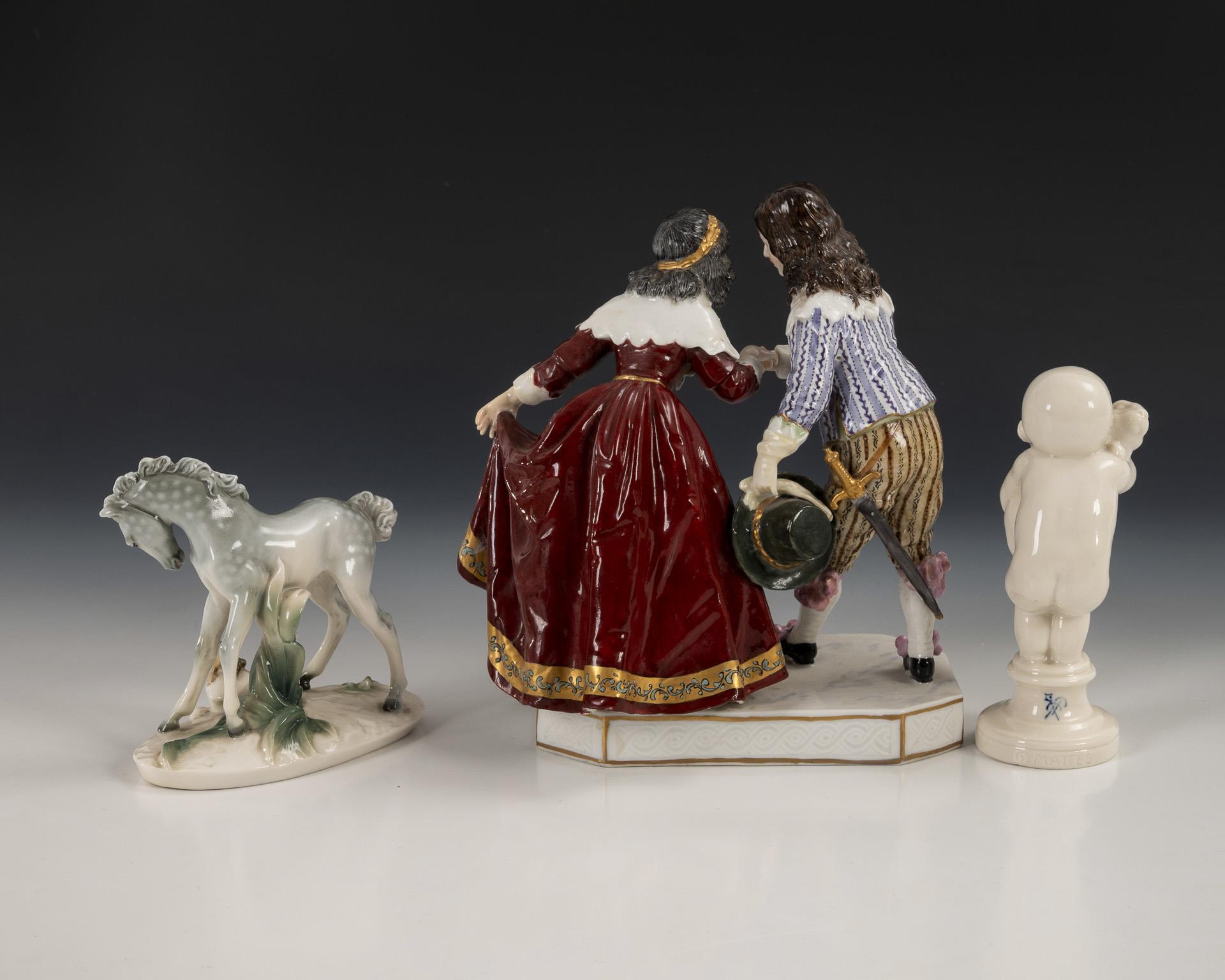 1x junges Paar in barocker Kleidung (H 19 cm). / 1x bezeichnet "G. Mattes": auf einem Rundsockel stehender, einen Hasen tragender Putto (H 13 cm). / 1x auf einen Frosch schauendes Schimmelfohlen (H 10,5 cm). Linke Hand der Dame restauriert.