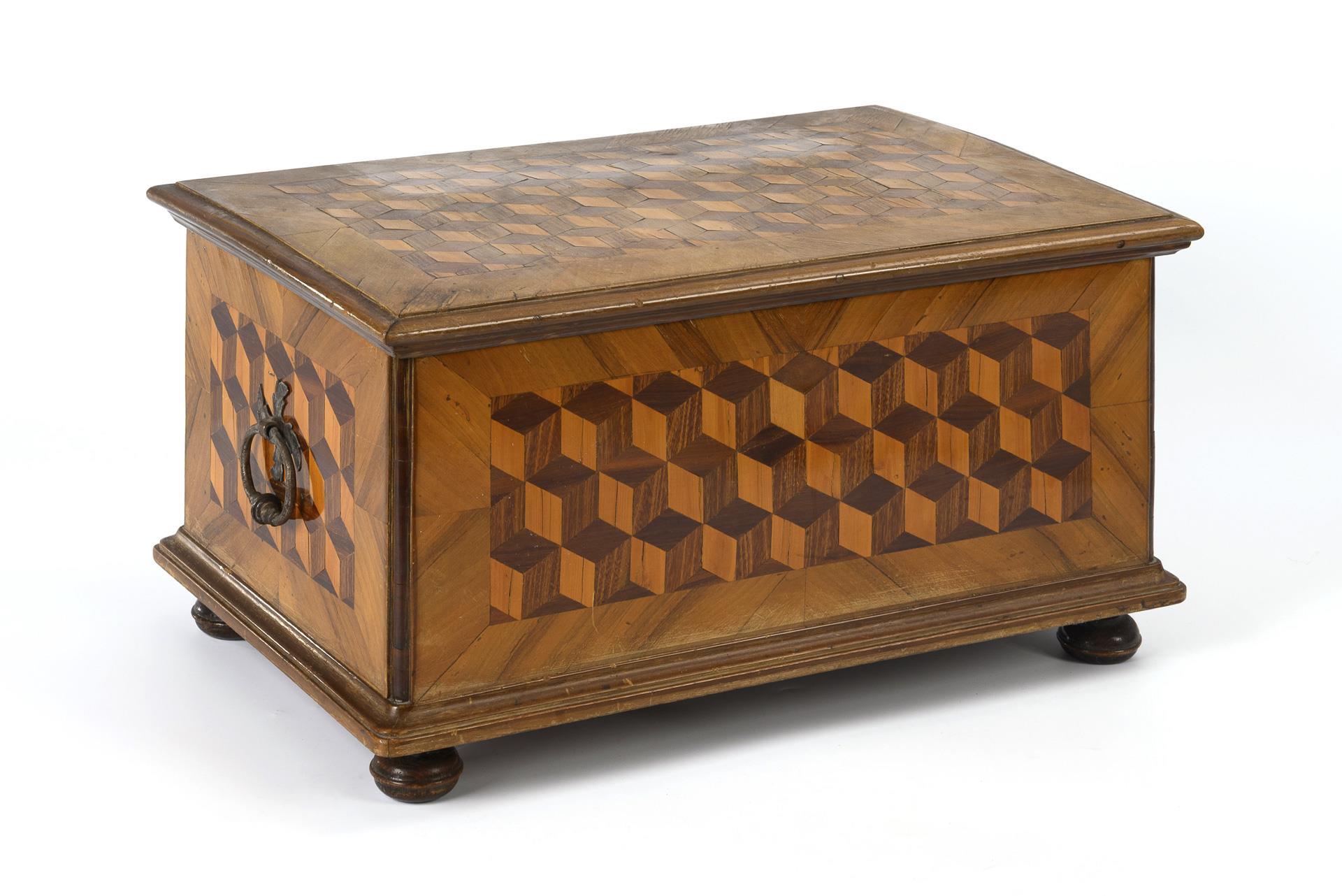 Kleine barocke Truhe mit optischer Würfelmarketerie.