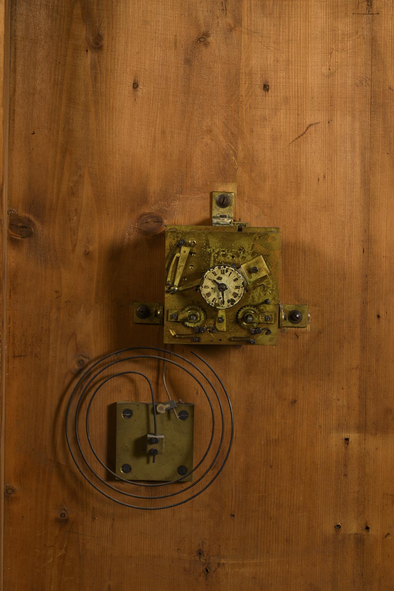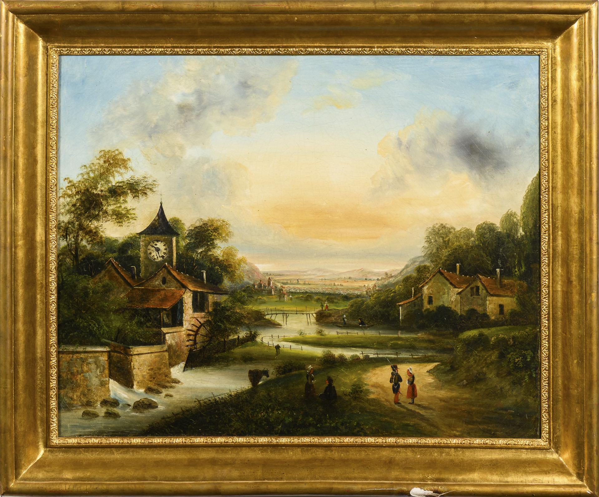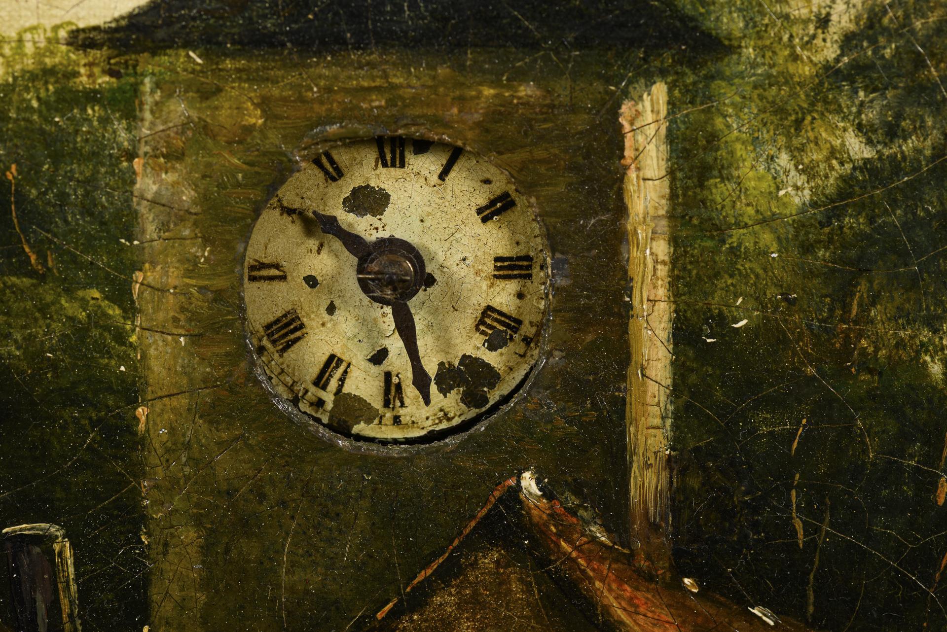 Bergige Gegend mit Dorflandschaft an einem Fluss. Uhr mit hellem Zifferblatt und römischen Ziffern in den Kirchturm eingelassen. Pendel anbei. Altersspuren, Uhrwerk läuft an, Dauerfunktion nicht getestet, ein Verschlusshaken fehlt.