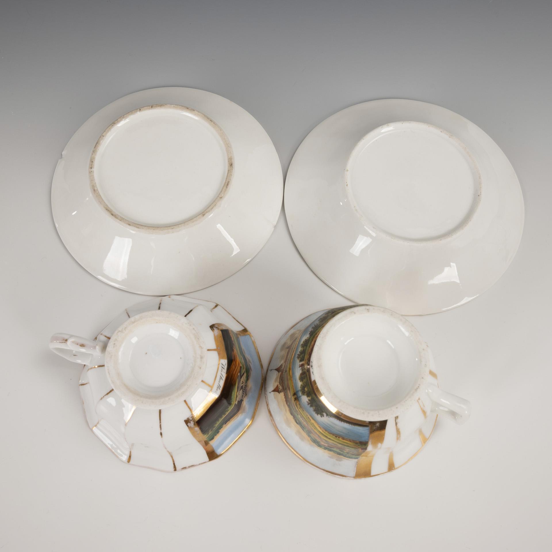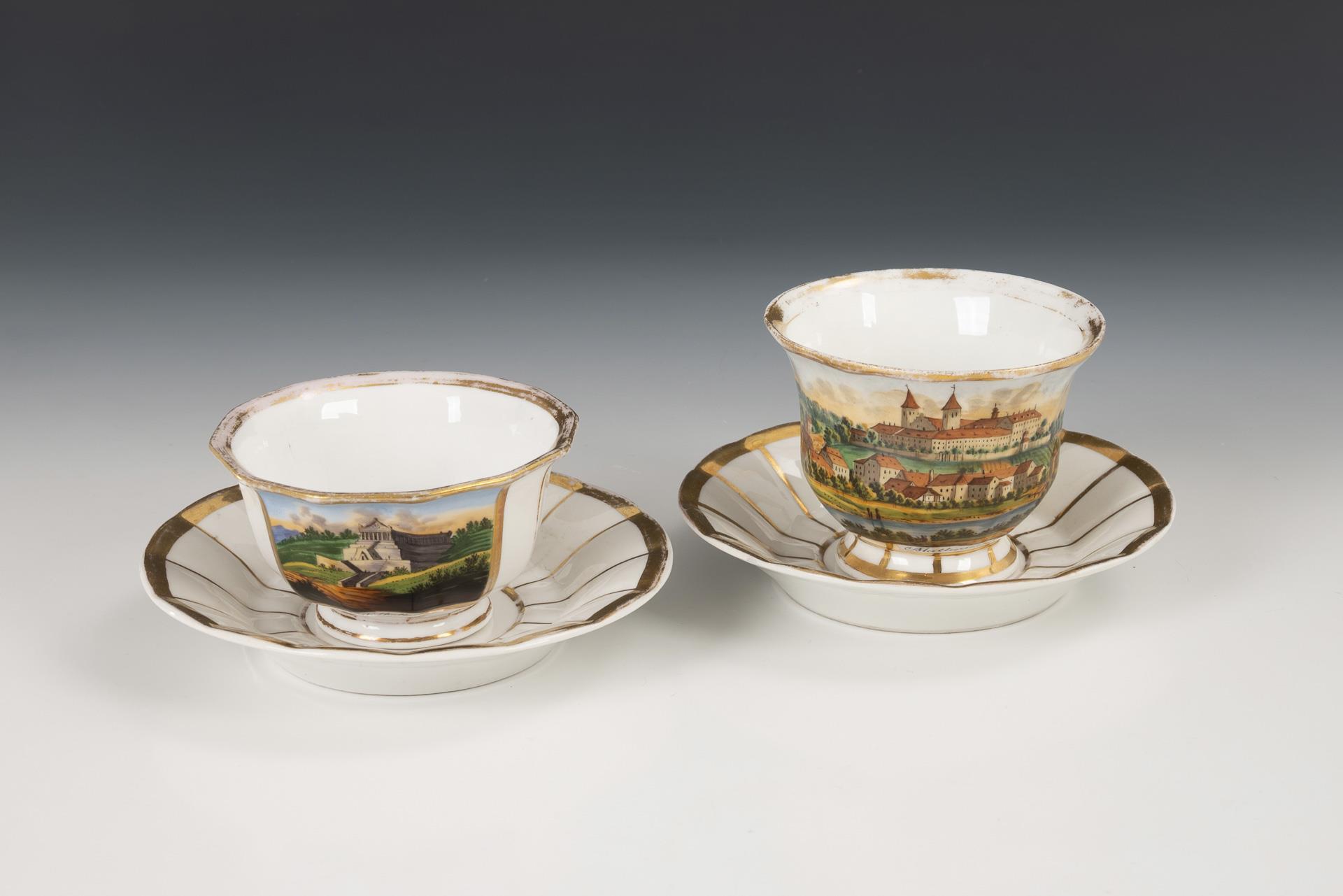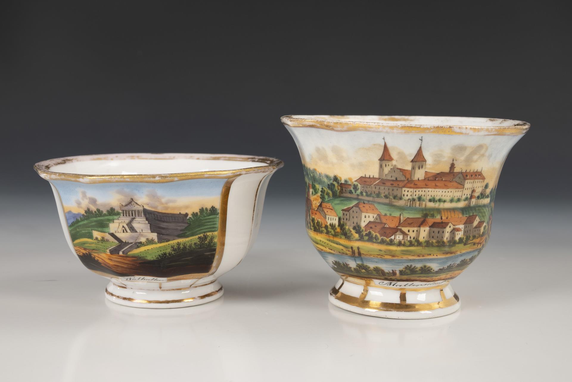 2 verschiedene, gefußte Glockentassen. Schauseitig jeweils eine goldgerahmte Rechteckkartusche mit einer bezeichneten Ansicht (1x die "Walhalla" bei Regensburg, 1x "Mallersdorf" im Landkreis Straubing, mit Blick auf das Franziskannerinnenkloster). Gold berieben, Chip an 1 Untertassenrand.