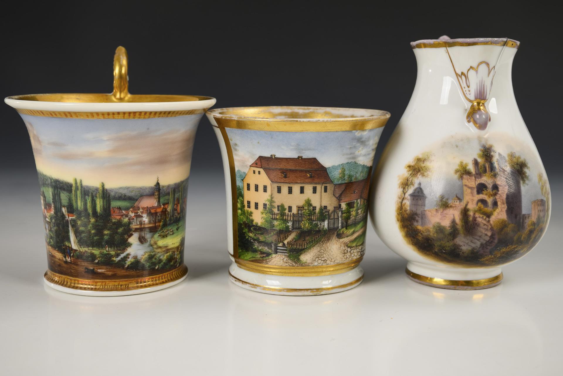 1x Kratertasse mit Palmettenhenkel und der schauseitigen, unterseitig bezeichneten Ansicht der Superintendentur Eckardsberga. / 1x Kratertasse mit einer Ansicht von Münden. /1x Kännchen mit der Ansicht der Pulverturmruine des Schlosses Heidelberg. Partieller Goldabrieb, 1 Tasse mit Haarriss.