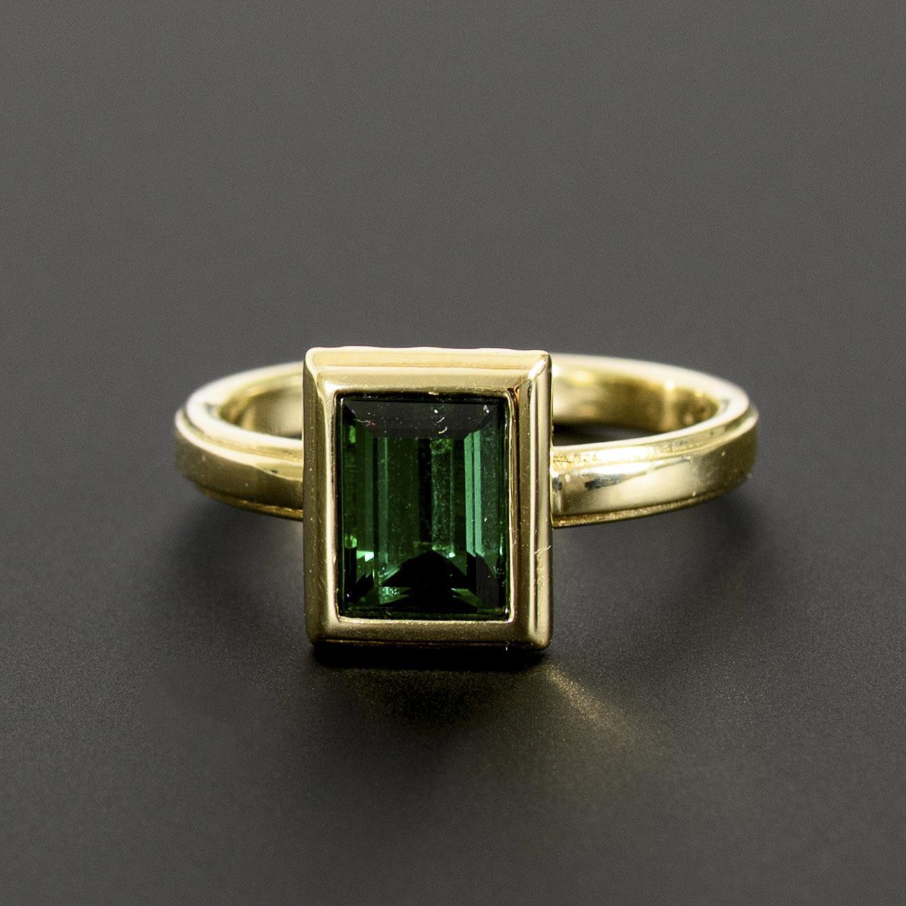 Elegant zurückgenommener Ring mit solitärem grünen Farbstein, wohl Turmalin, in Zargenfassung. Minimale Tragespuren am Ringkopf.