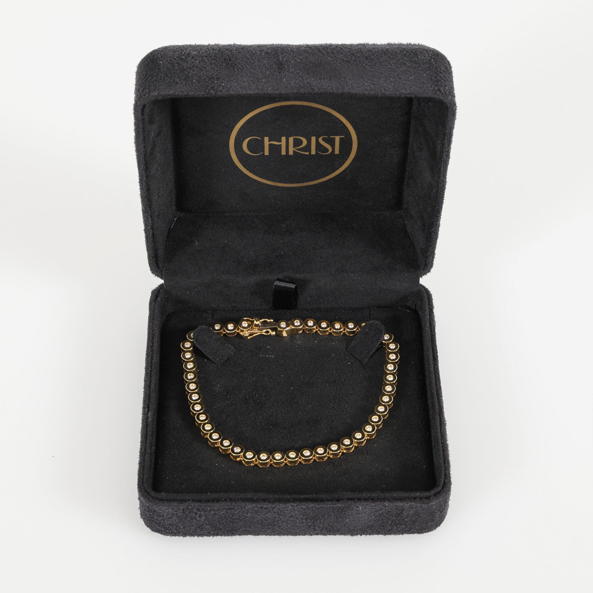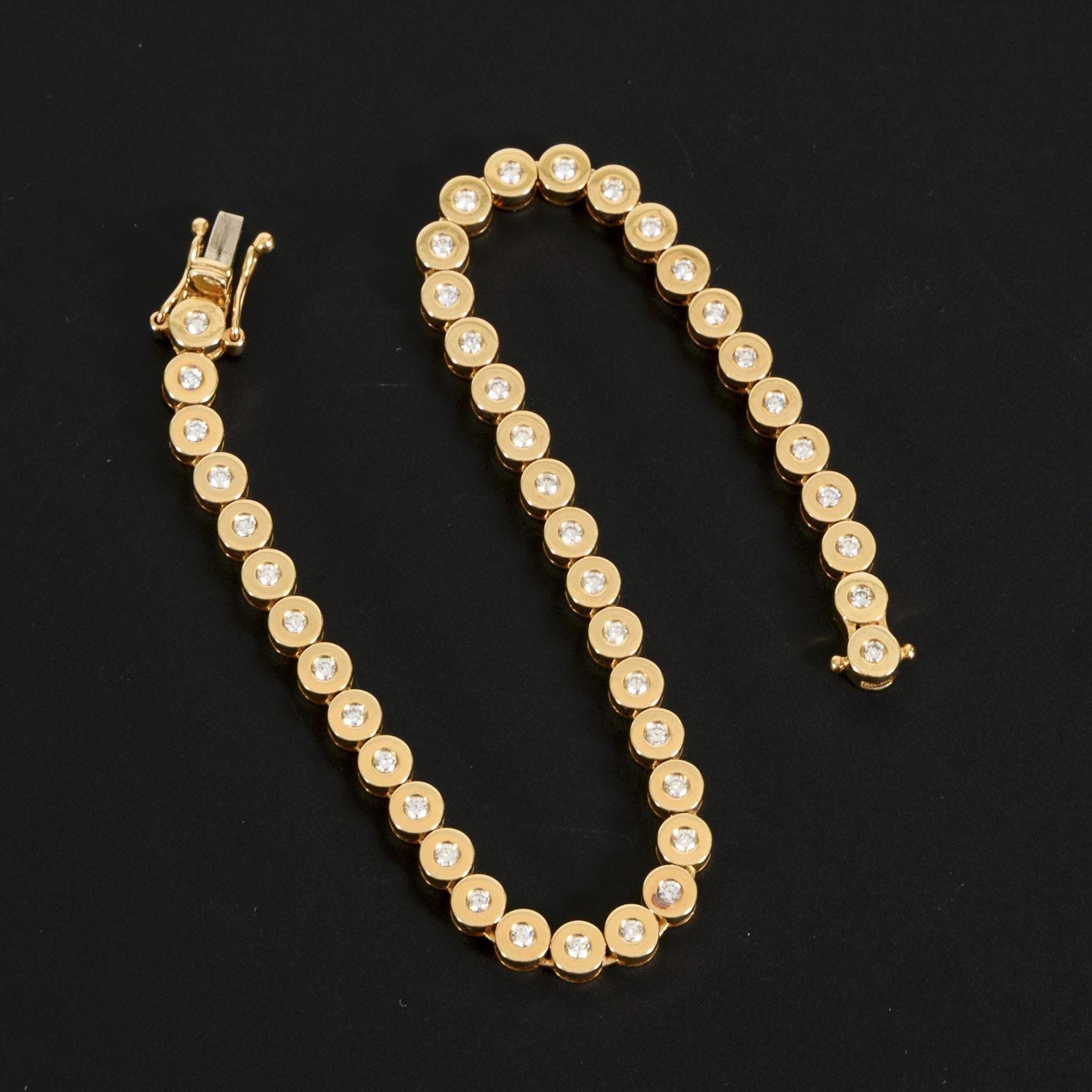 Klassisches Armband mit runden Gliedern, je mit einem kleinen, zargengefassten Brillanten besetzt. Verschluss: Kastenschloss mit doppelten Achterhaken zur Sicherung.