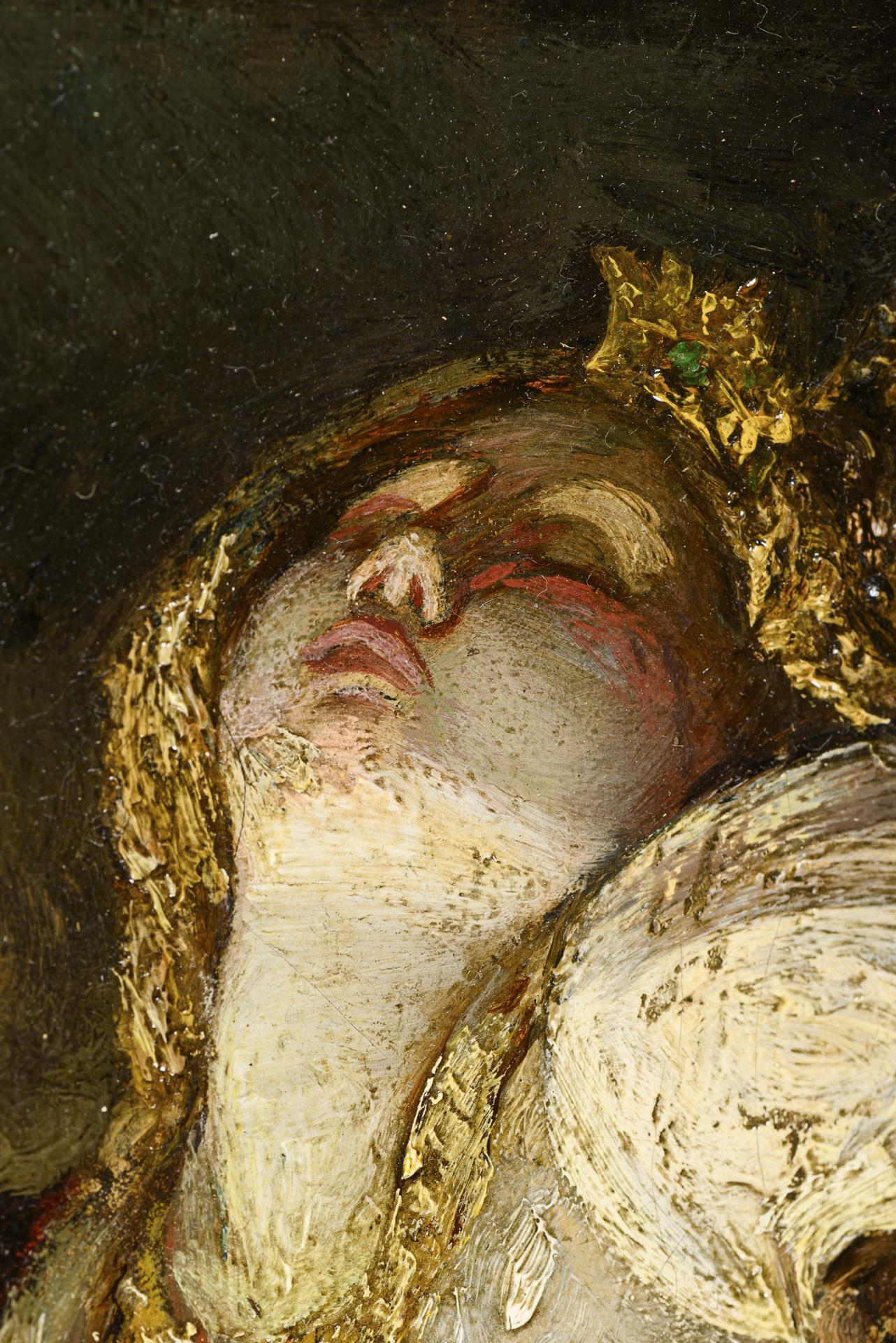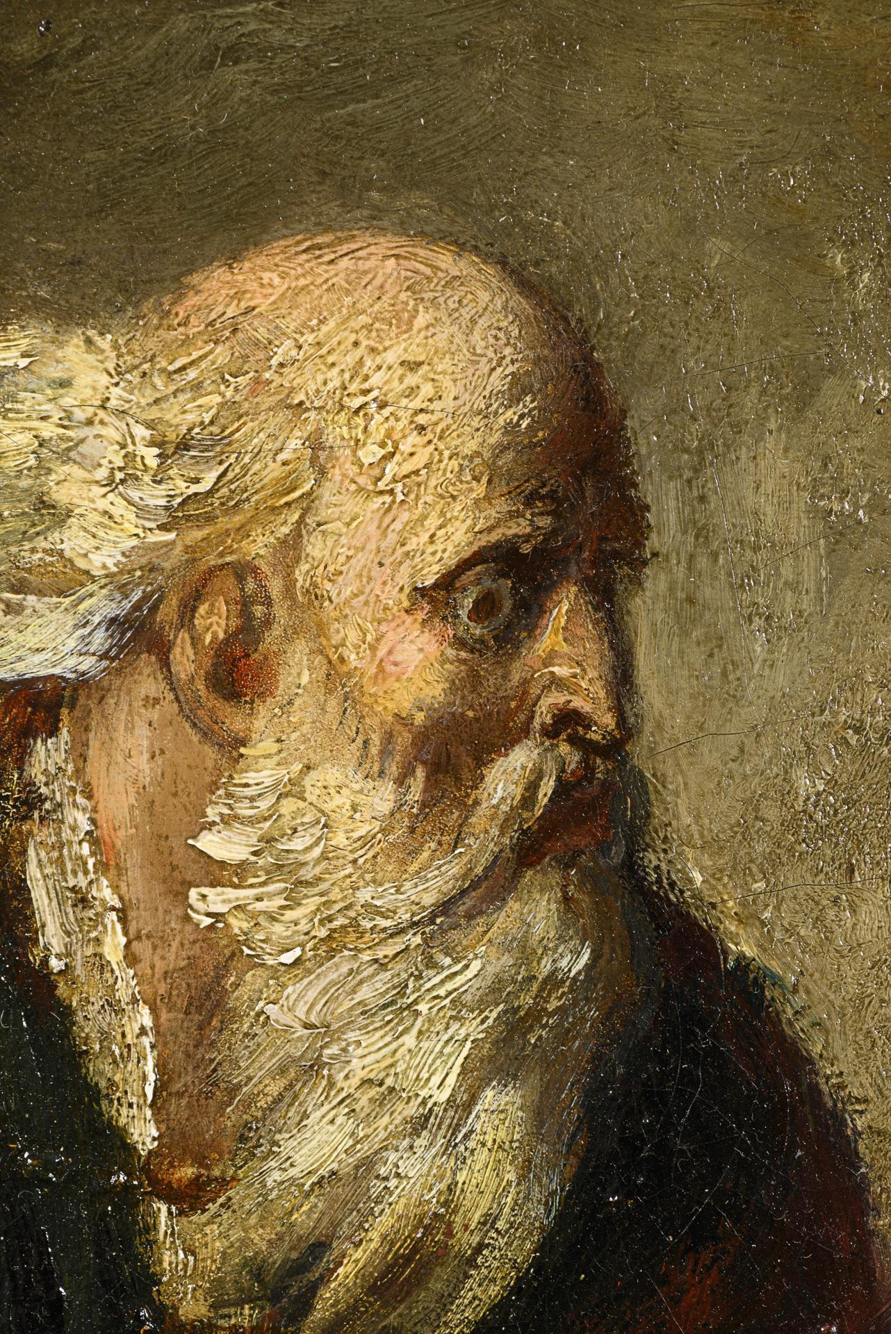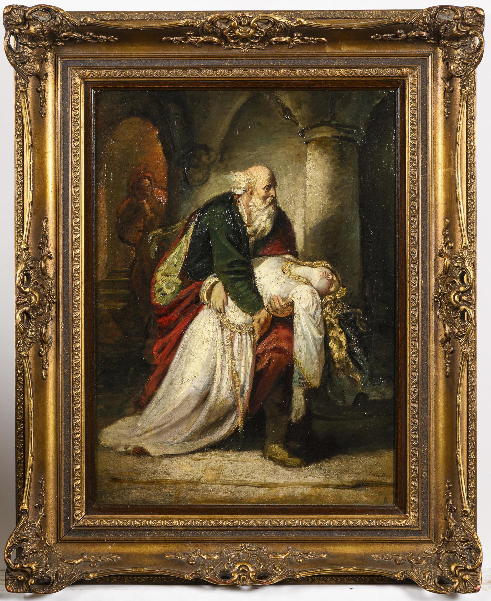 Entsetzt den toten Körper der jungen Frau haltender, alter Mann in einem Gewölbe. Eine kleine restaurierte Stelle.