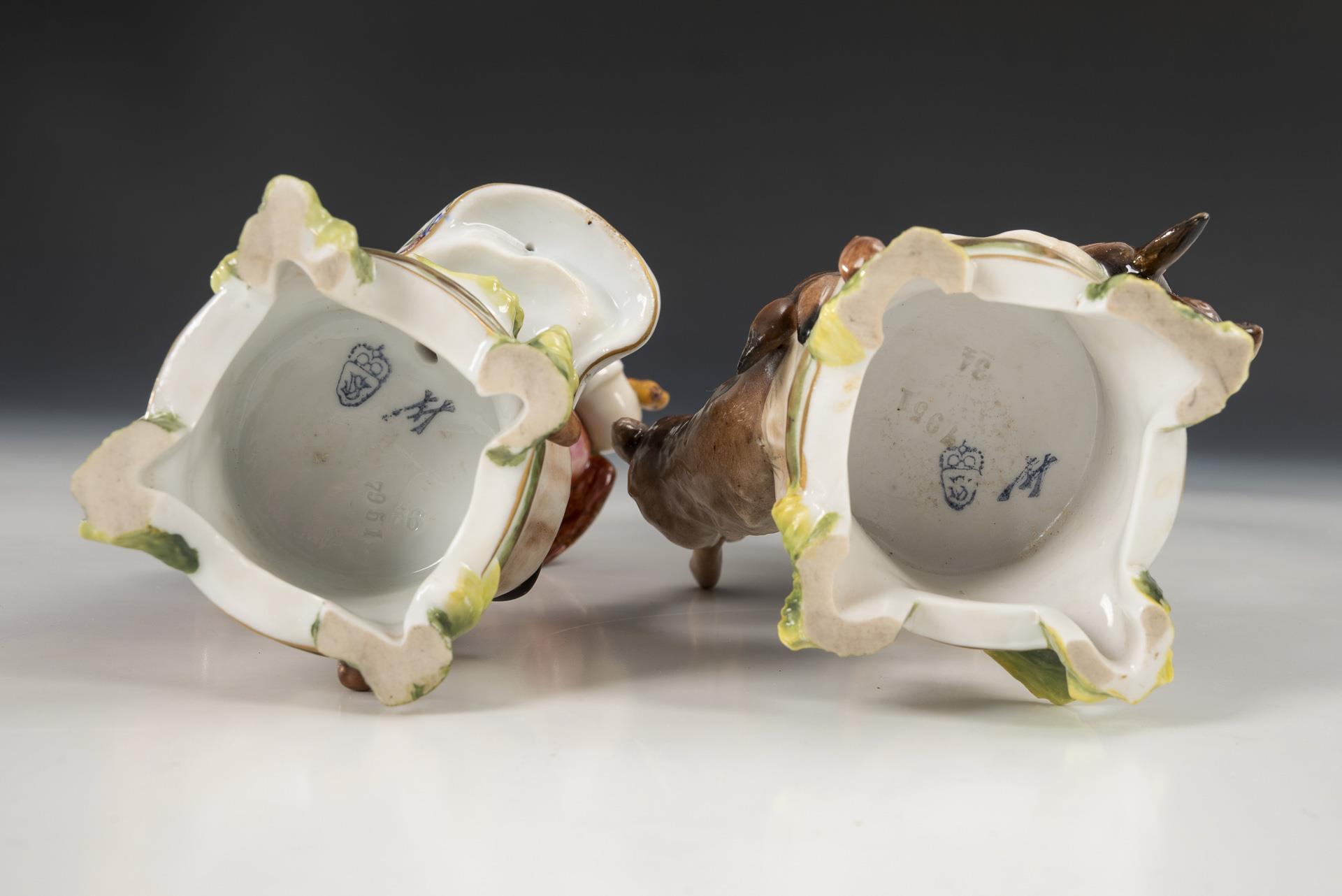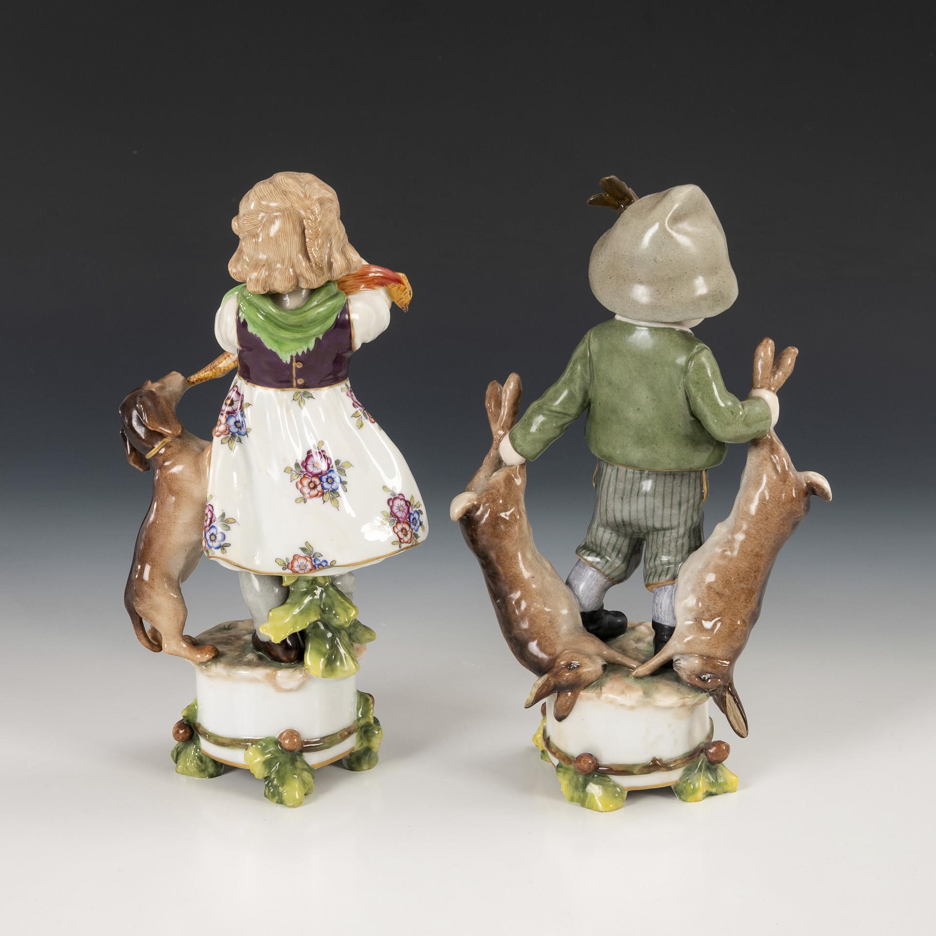Mädchen mit Fasan und Dackel sowie Knabe mit zwei Hasen. Fasan und Halstuch des Mädchens, Hasenohren, partiell Jacke und Hutfeder des Knaben restauriert.