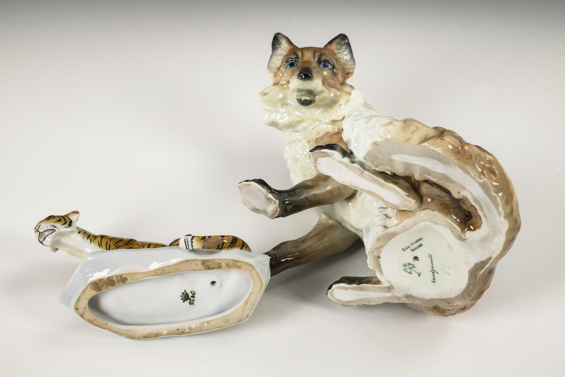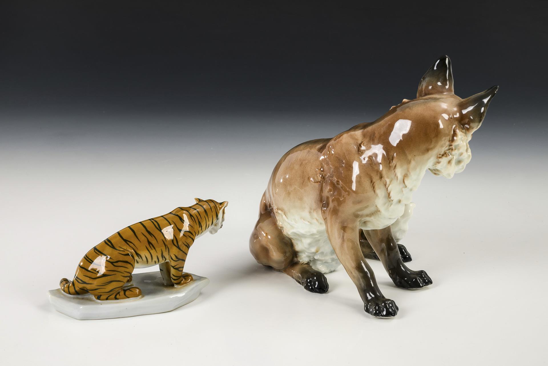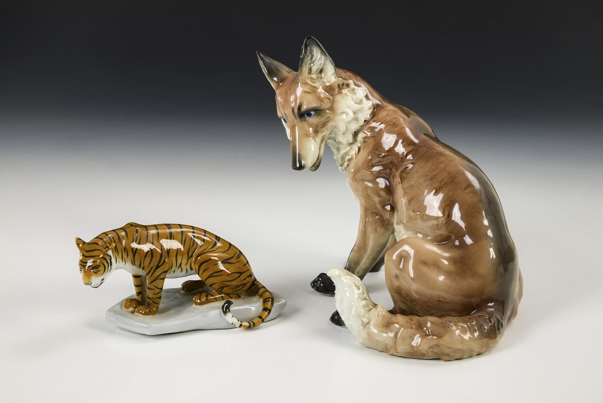 1x ENS, Modell-Nr. 786: sitzender Fuchs. / 1x METZLER & ORTLOFF: sitzender Tiger.