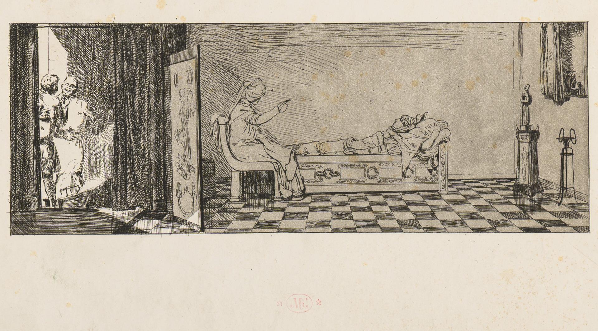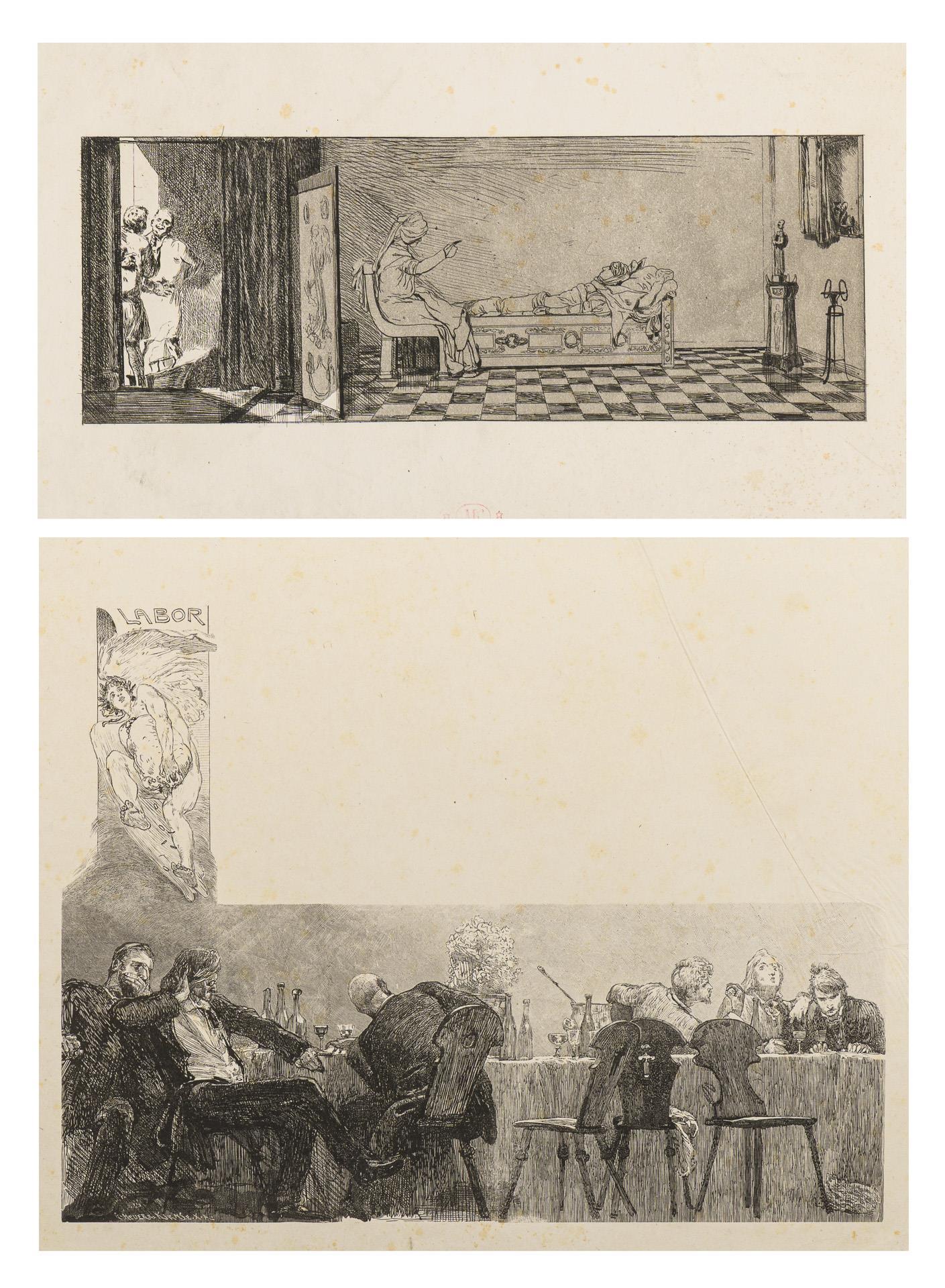 Festkarte und Menzelfeier von 1884 sowie Szene mit im Bett liegender Person. Falze, leicht stockfleckig.