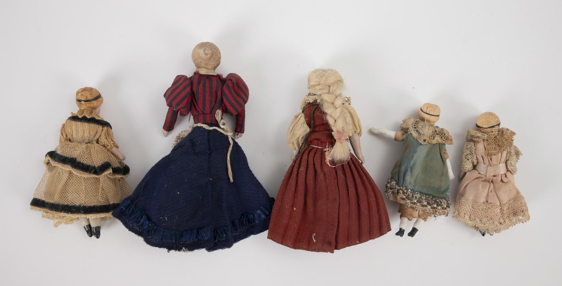 Alle mit Brustkopf, gemalten blauen Augen, Stoffkörper, Porzellangliedern und alter Kleidung. Kleine Defekte.