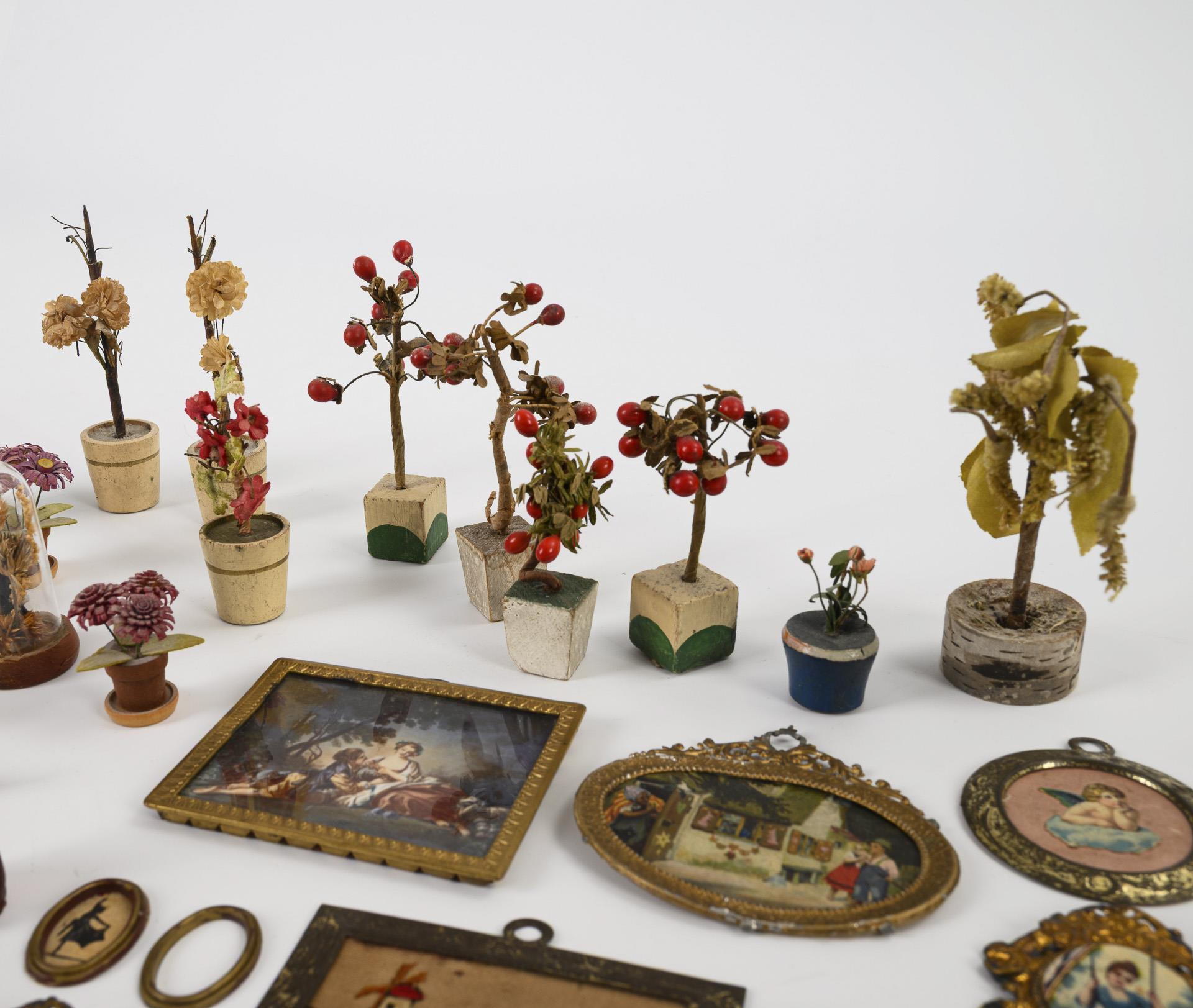 Konvolut Puppenstuben-Zubehör mit Bilderrahmen und Pflanzen.