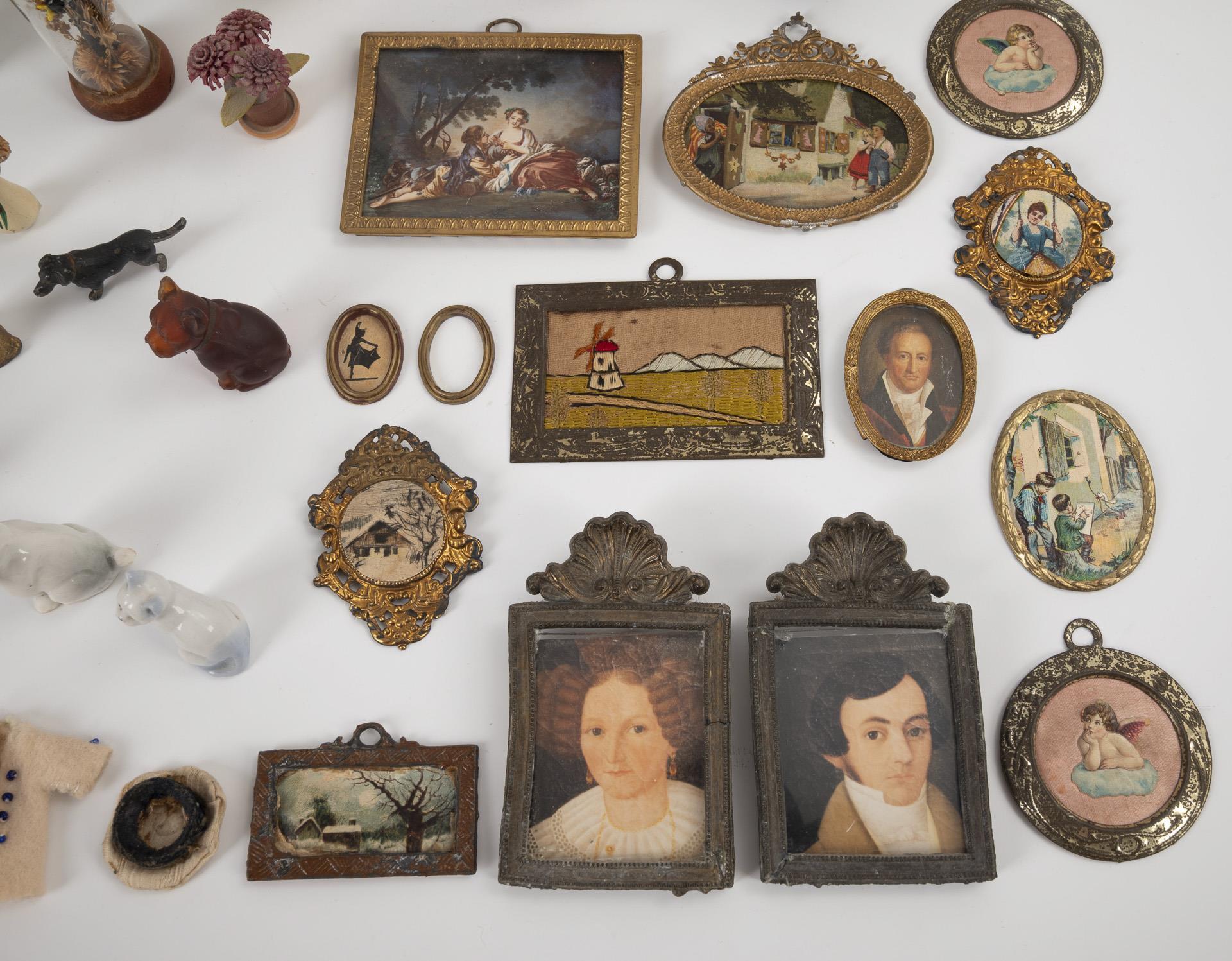 Ca. 13 Bilderrahmen aus Zinn und Blech (H 3 - 9 cm), ca. 15 Topfpflanzen sowie einige Kleinteile Porzellannippes für die Puppenstube. Teils mit Altersspuren und Defekten.
