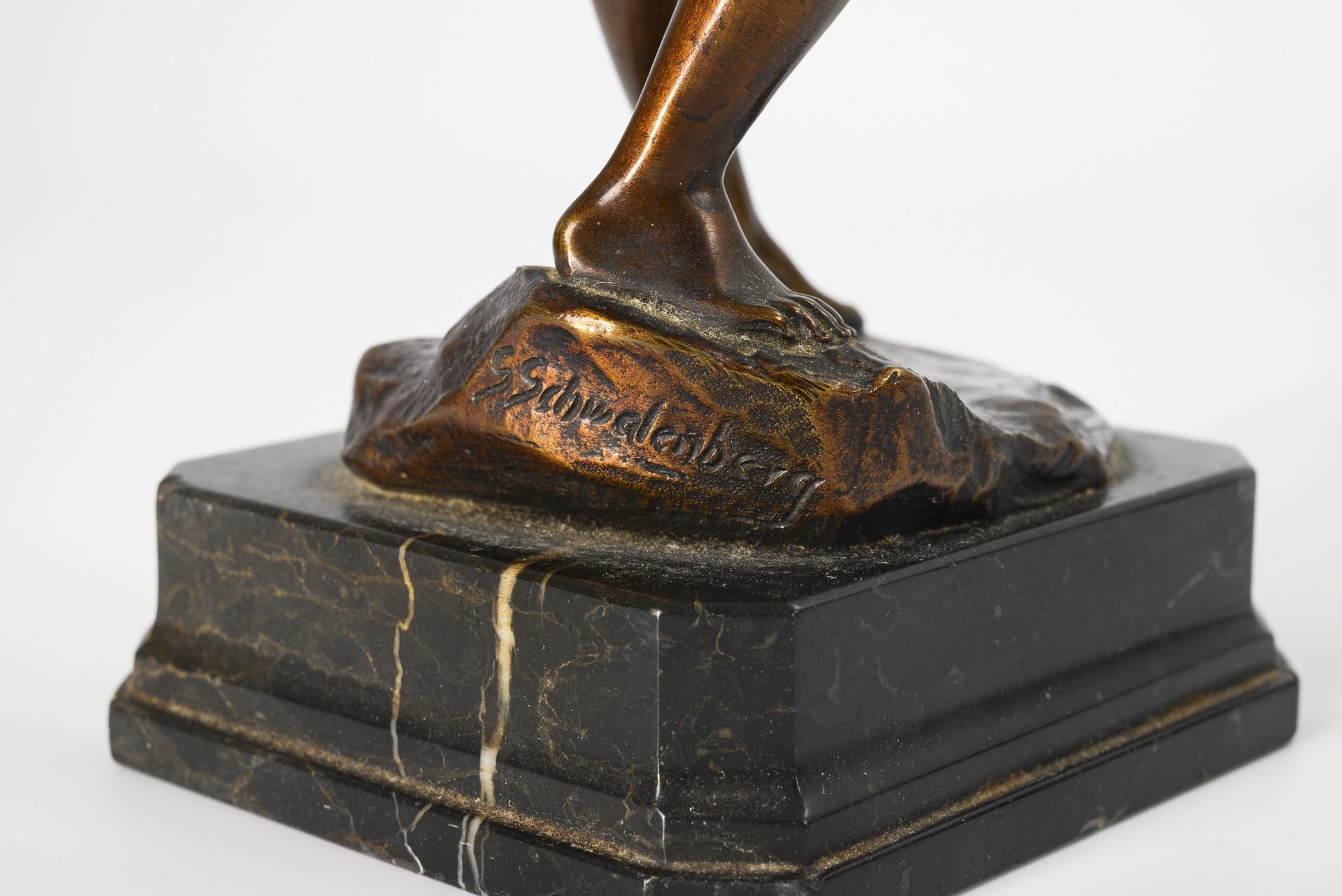 Bronze oder Kupfer, rotbraun patiniert, schwarze Marmor-Plinthe. Bezeichnet. H 22 / 25 cm (ohne Speer). 2,6 kg.