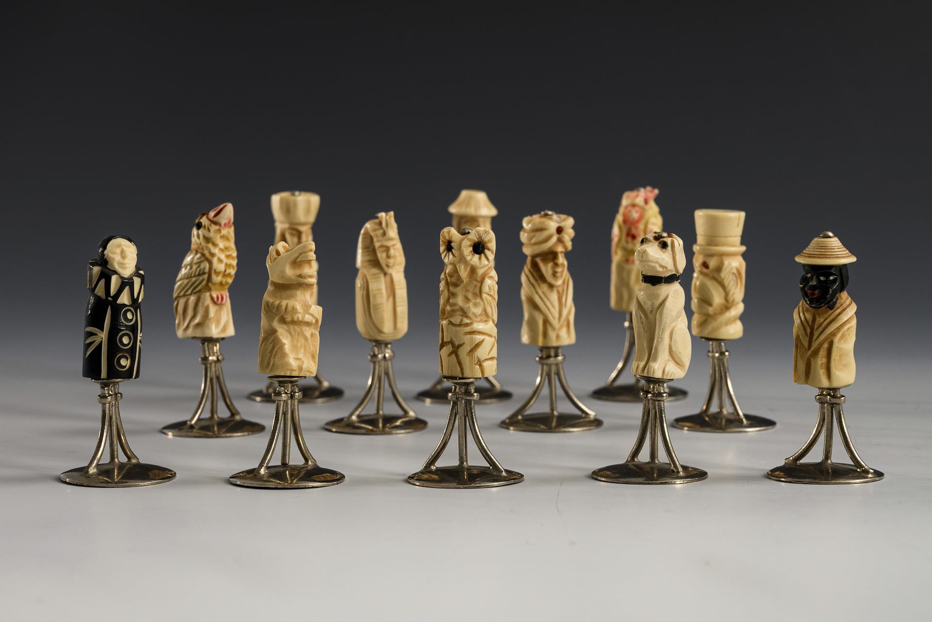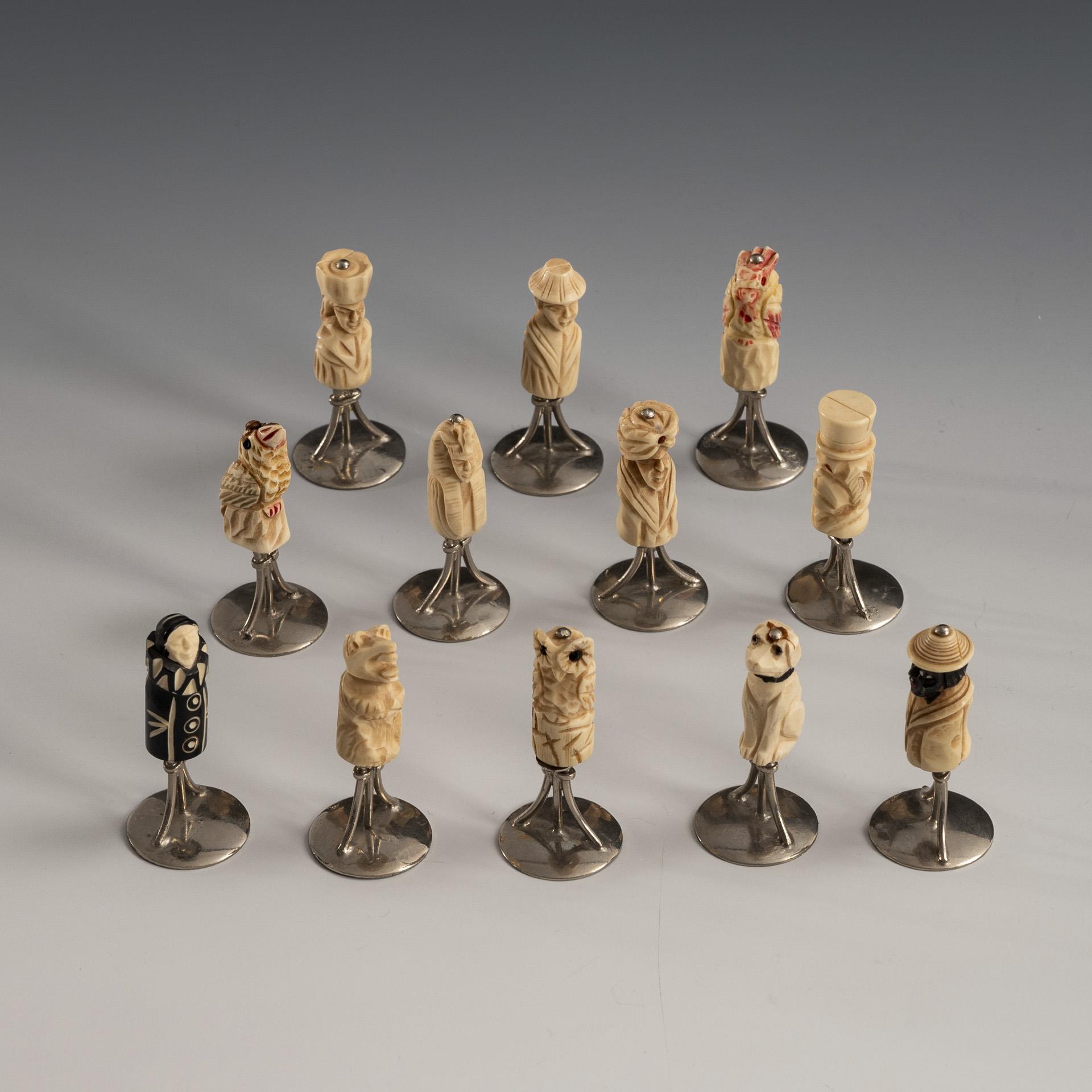 Silberfarbenes Metall, Elfenbeinimitat (Steinnuss und Kunststoff) teils farbig gefasst, teils mit Glasaugen. H Figuren 5 cm. 0,1 kg.