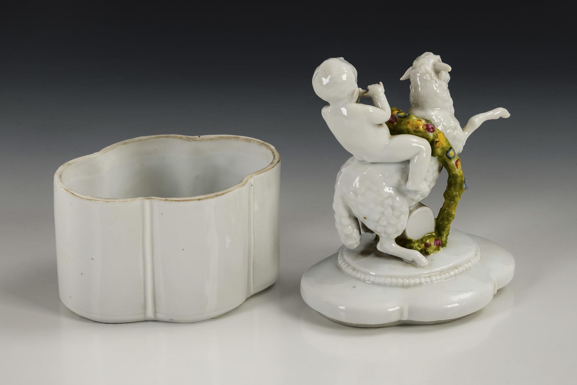 Vierpassige Dose mit dem plastischen Deckelknauf eines flötespielenden Puttos, auf einem Schaf reitend.