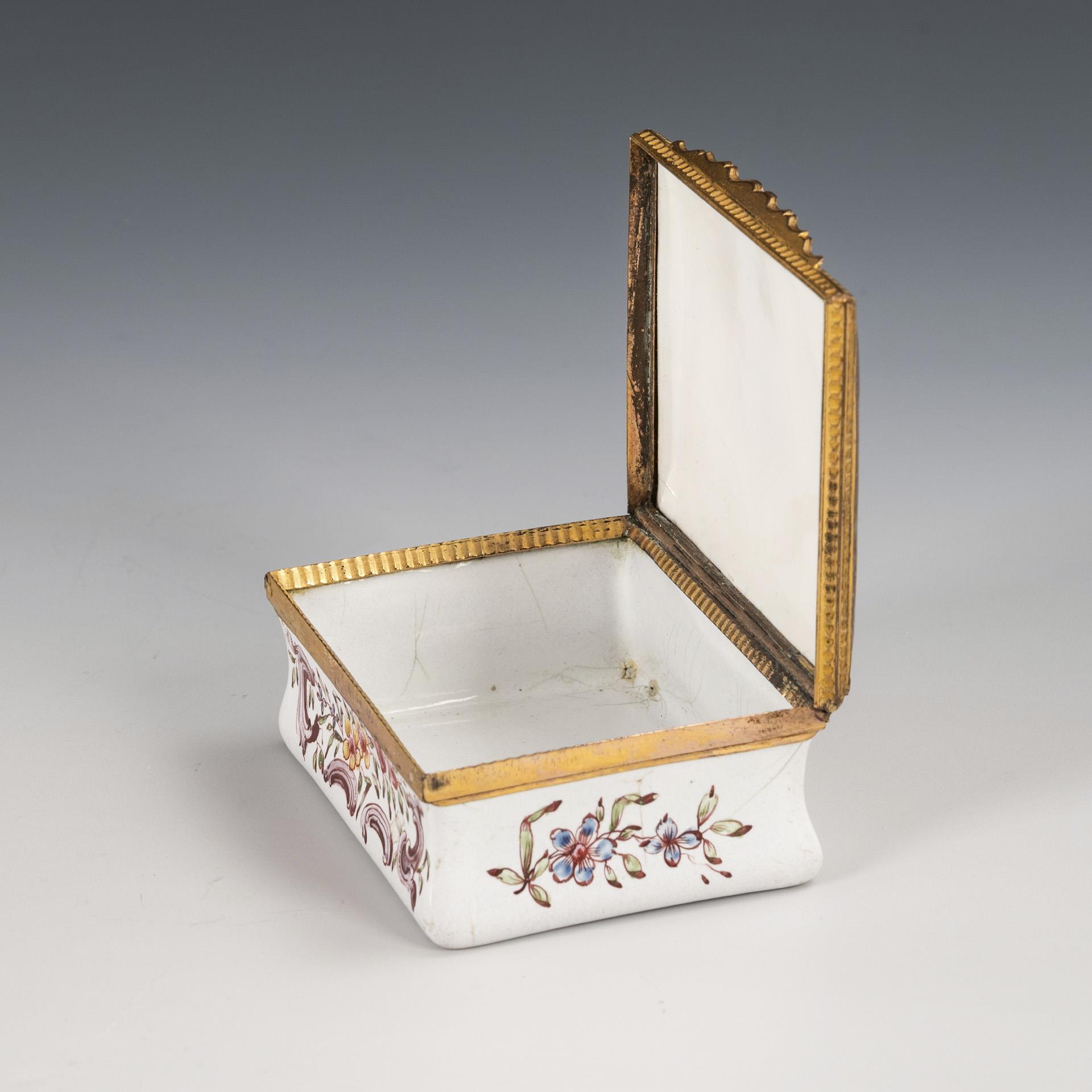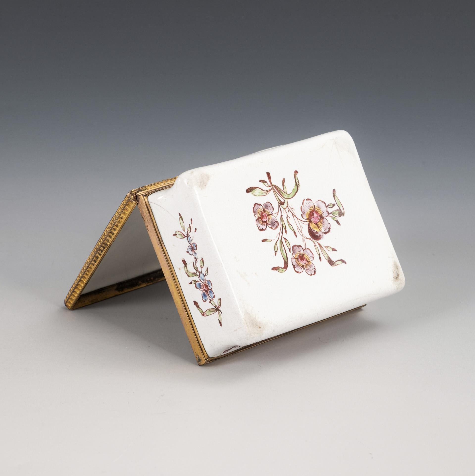 Kupfer, weißes Email, Emailmalerei, vergoldete Messingmontierung. 3 x 8 x 6 cm. 0,1 kg.