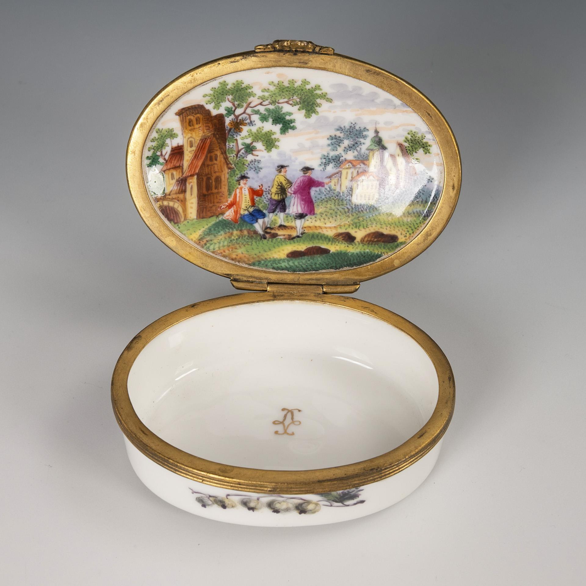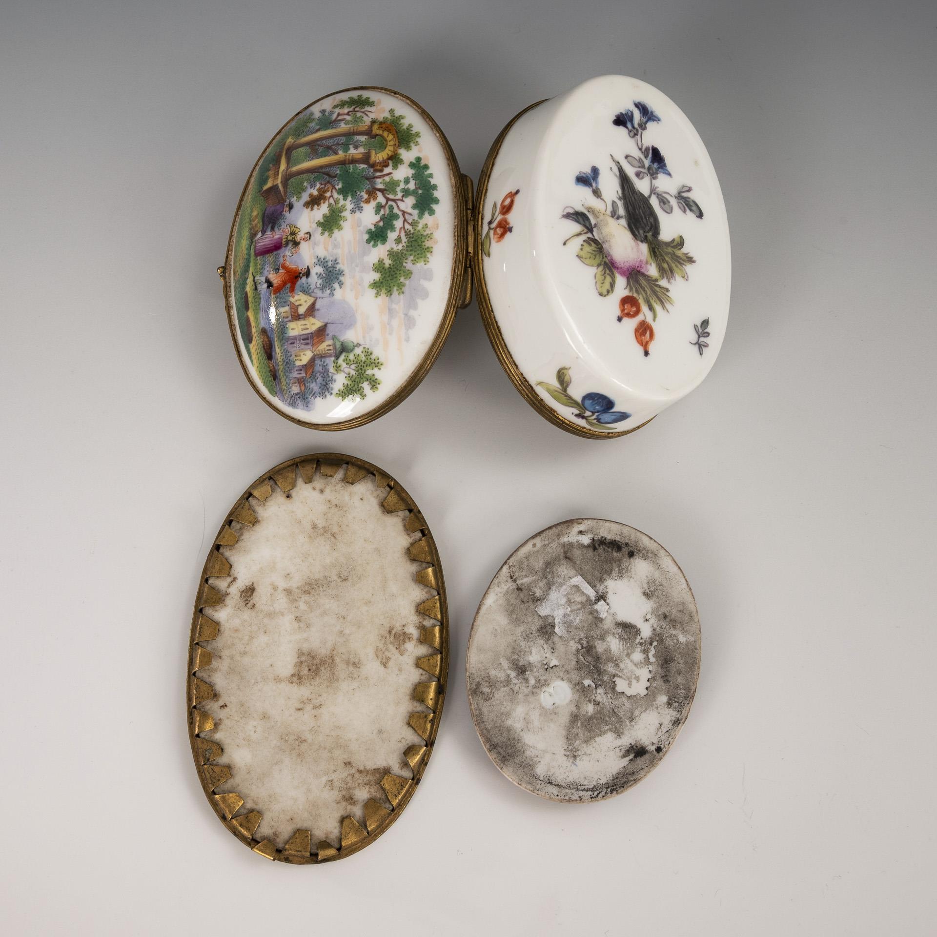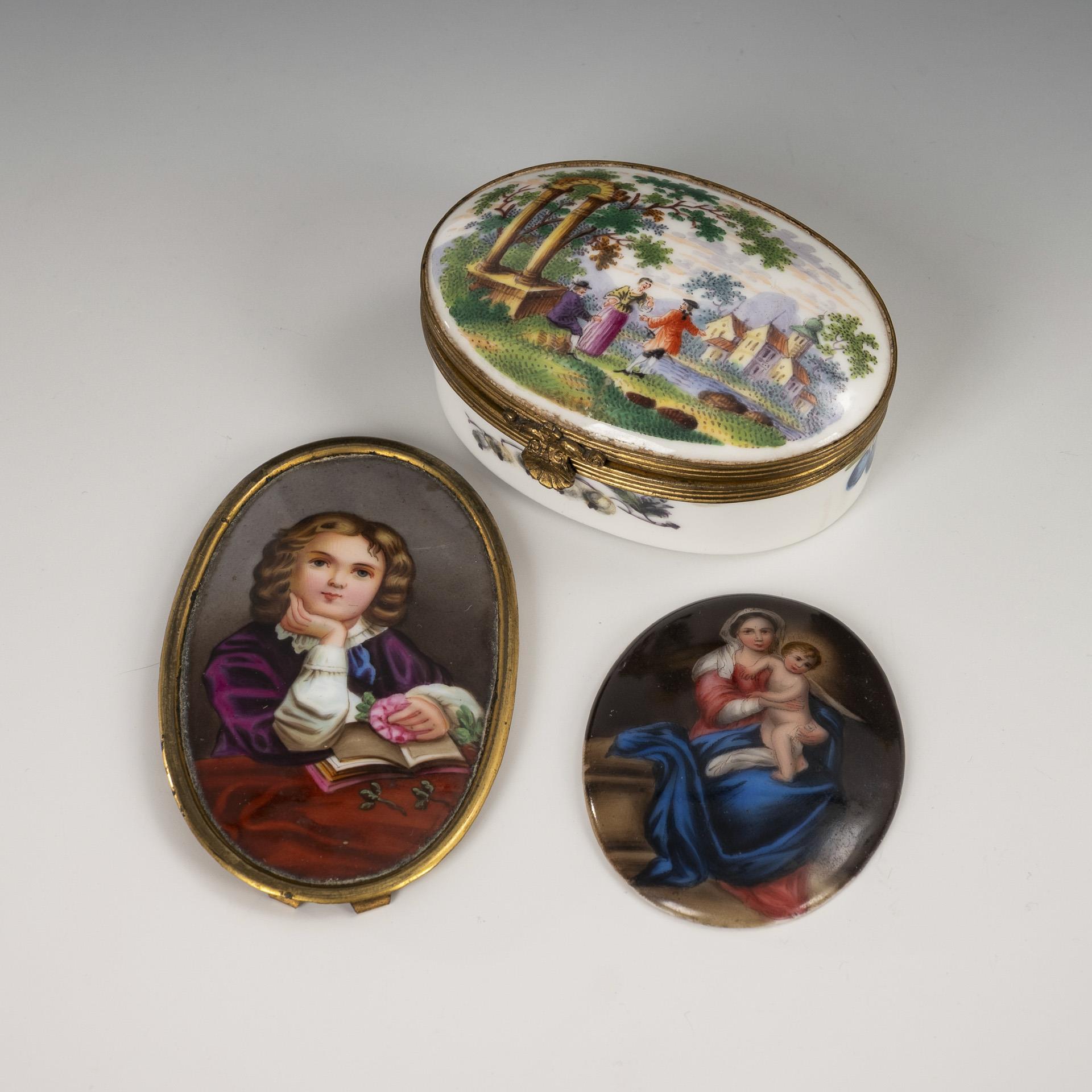 1x wohl Frankreich: ovale Tabatiere mit metallmontiertem Scharnierdeckel: Deckel beidseitig mit der Darstellung einer Landschaft mit Figuren, auf dem Korpus Frucht- und Blumenmalerei (L 8 cm). / 1x ovale Plakette mit der gemalten Darstellung eines lesenden Knaben mit Rose (L 9 cm). / 1x ovale Plakette mit der über Vordruck gemalten Darstellung der Madonna mit Jesuskind (L 6 cm).