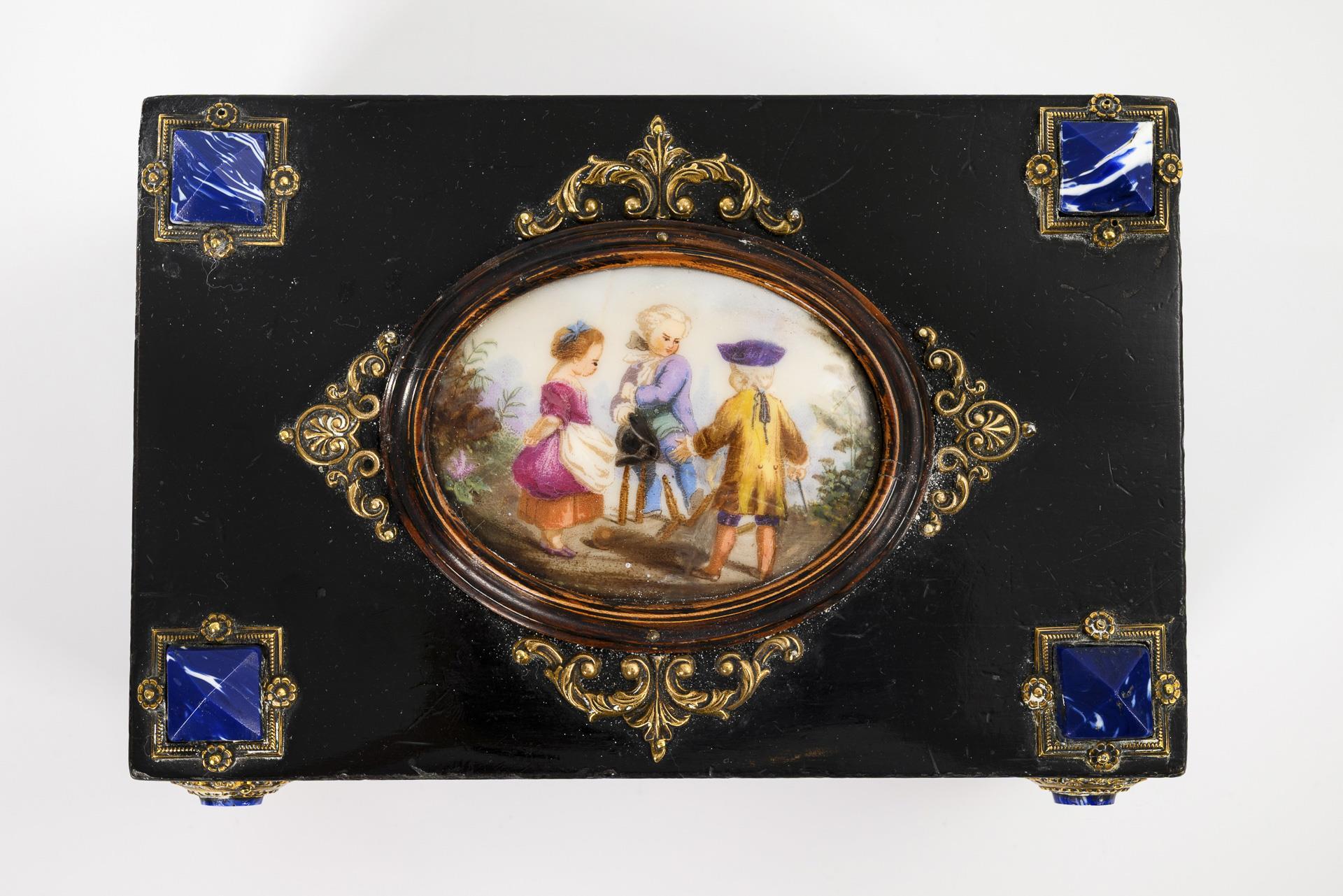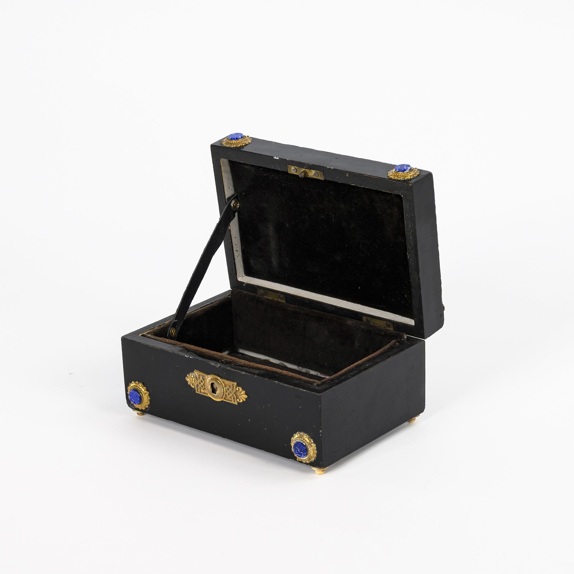 Ebonisiertes Holz, Messingbeschläge, blaue Glassteine, Kunststoff(?)-Plakette mit Dekorbild, innen schwarzer Samt. 9 x 18 x 12 cm. 0,5 kg.