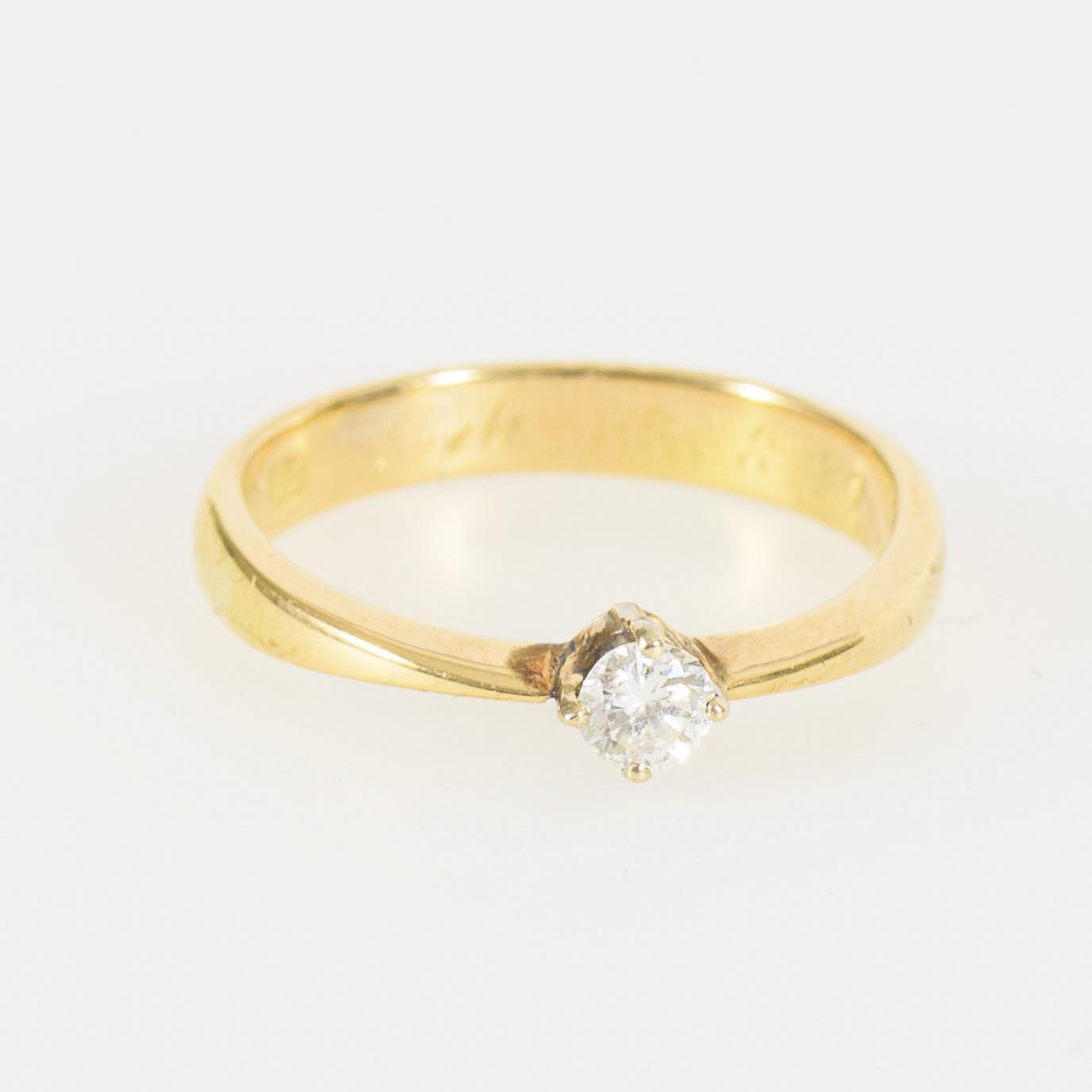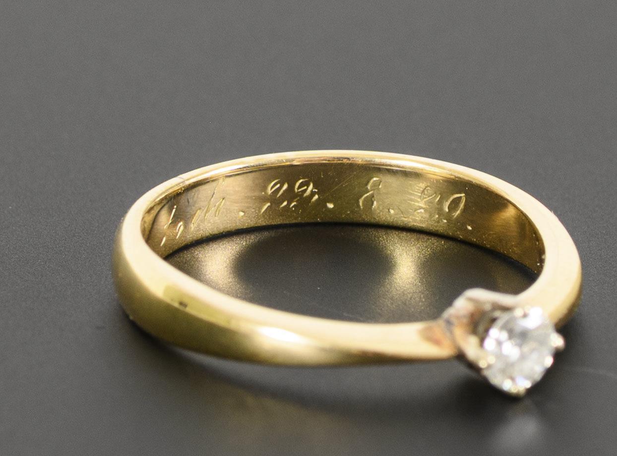 Klassischer Brillantsolitär zwischen sich mittig verjüngender Gelbgold-Schiene mit Krappenfassung in Weißgold. Unterseitig frühere Ringschienenverkleinerung sichtbar.