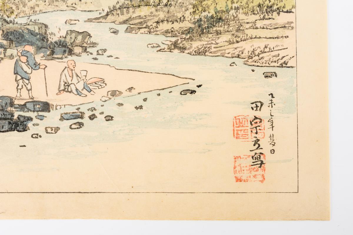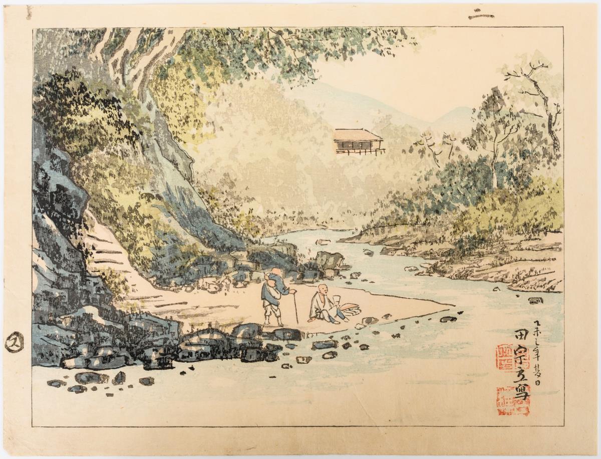 Farbholzschnitt - Mönche am Fluß.