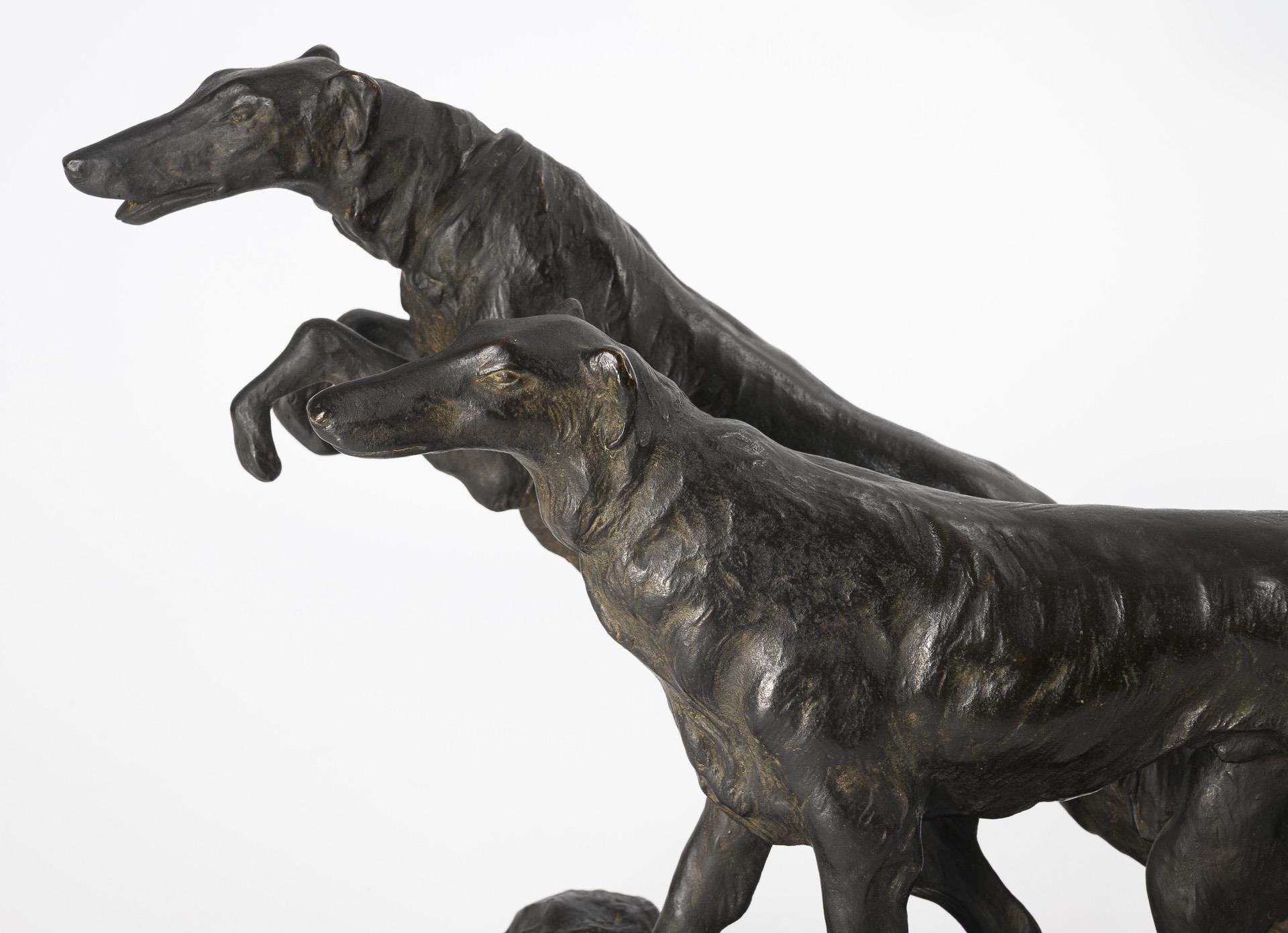Ruhig stehender und dynamisch vorwärts springender Windhund auf naturalistischer Plinthe. Wenige Farbflecken auf der Patina, Ausbrüche am Marmor.