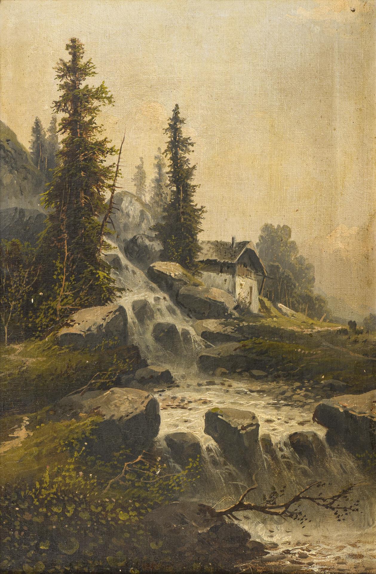 Je Darstellung eines Wasserfalls zwischen großen Felsen mit angrenzender Hütte. Je leichte Altersspuren.