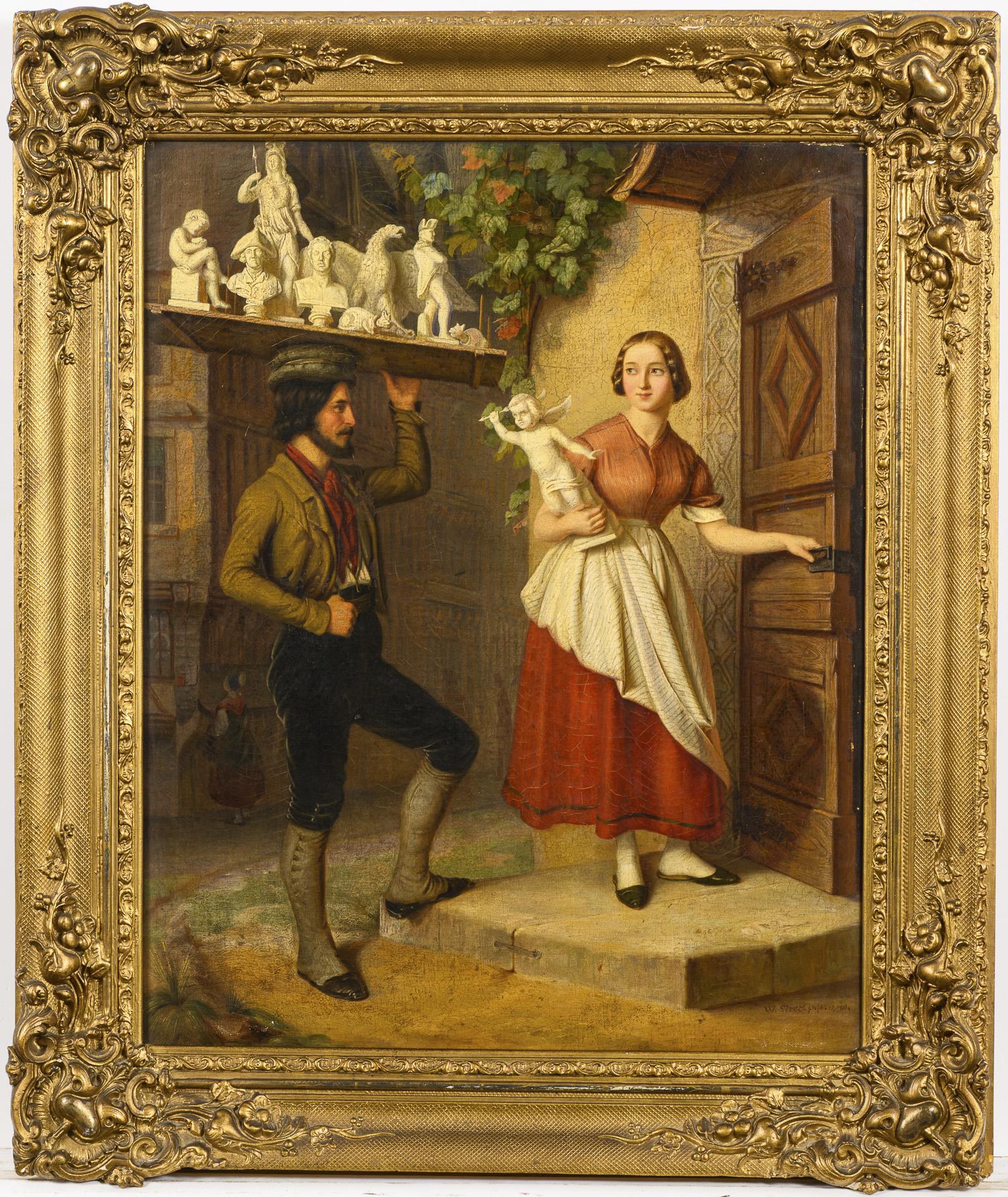 Italienischer Figurenhändler mit junger Frau am Haustürenverkauf. Altersspuren.
