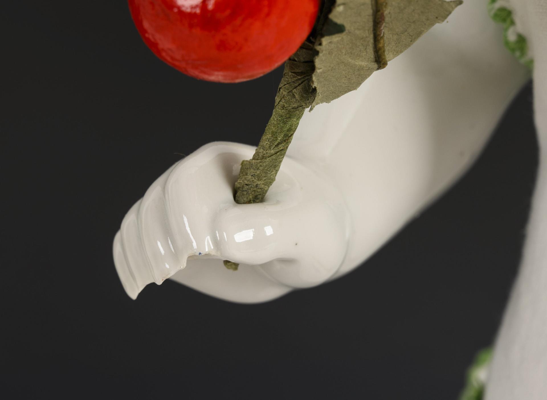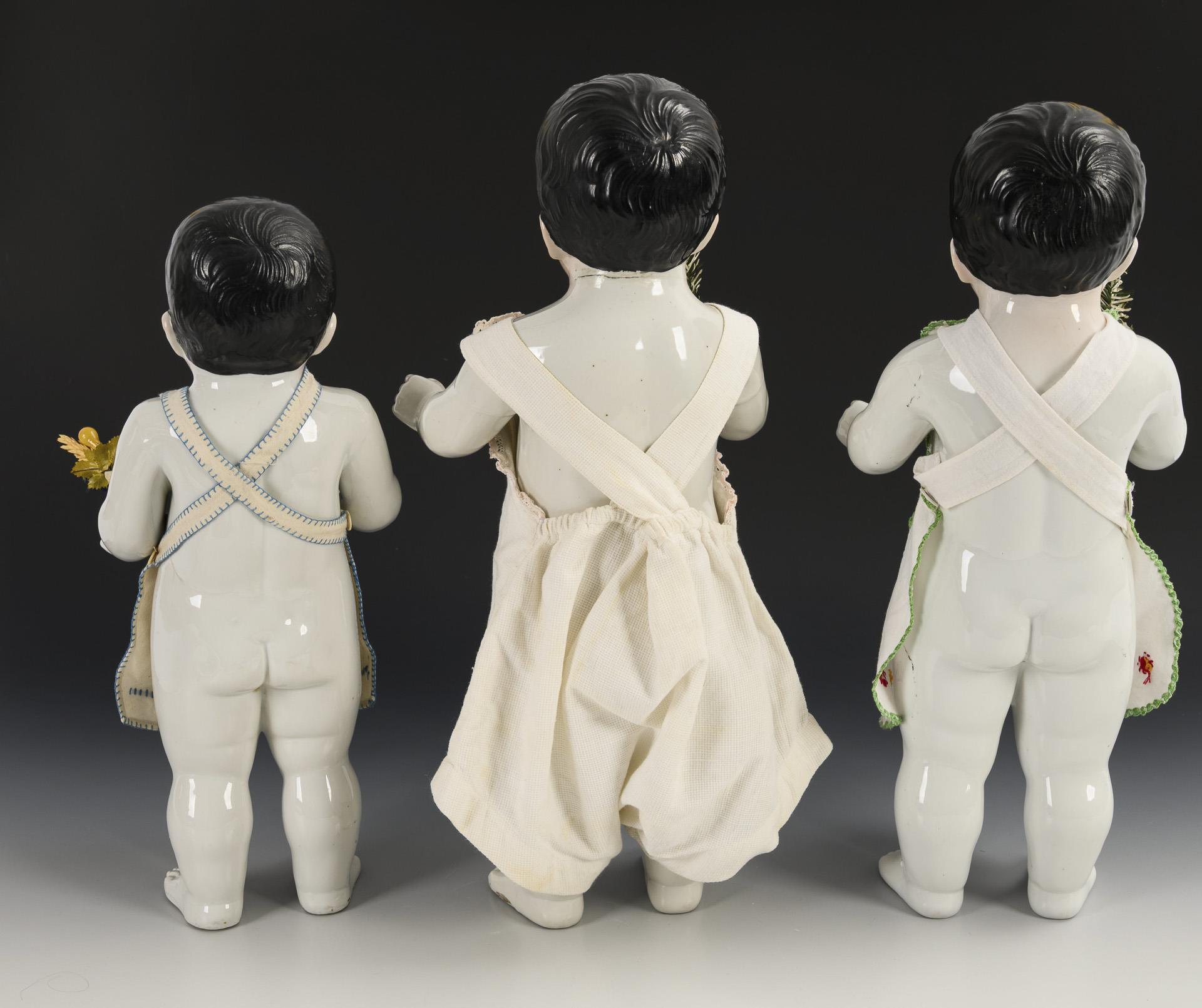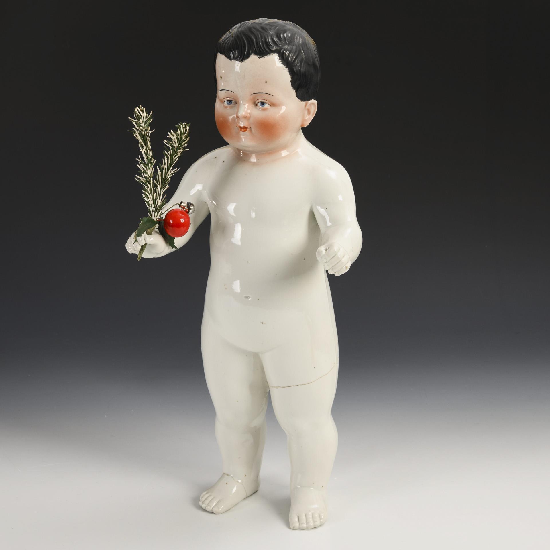 Sogenannter Nacktfrosch oder Frozen Charlotte. Jeweils mit blauen Augen und modellierten schwarzen Haaren. Alle mit weißer Schürze bekleidet, dazu rote Studentenmütze und dunkelblaue Matrosenhose. Jeweils mit Klebestellen, eine Hand bestoßen.