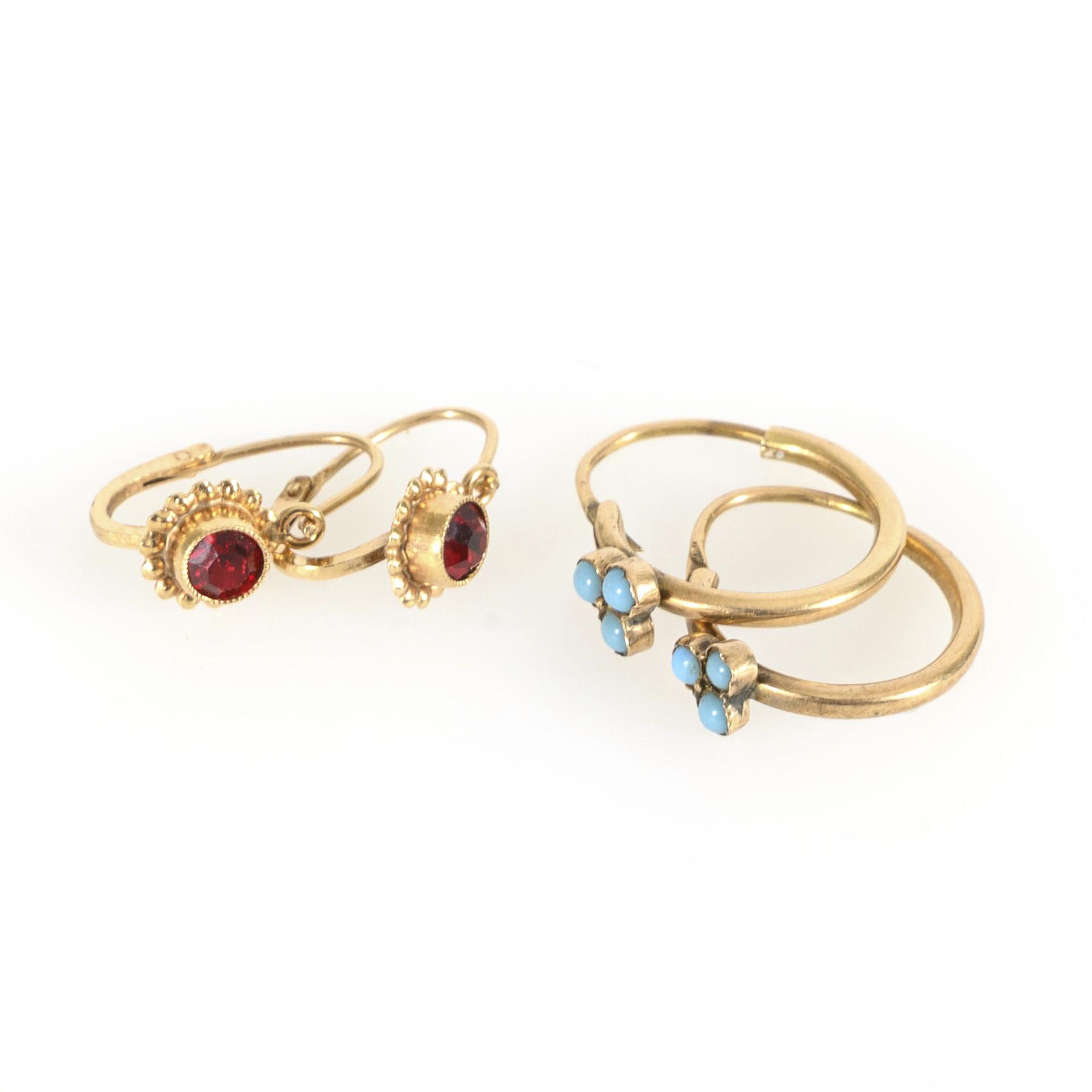 2 Paar zarte, kleine Ohrringe wohl um 1900, wahrscheinlich ursprünglich für Kinder gedacht. 1x Ohrhänger mit rotem Glas, rund-facettiert, 1x Creolen mit milchig-blauen Glas-Cabochons. Das Paar mit den roten Glassteinen schließt zeittypisch nach vorn, das Paar mit den blauen Glas-Cabochons über einen Steckmechanismus hinten.