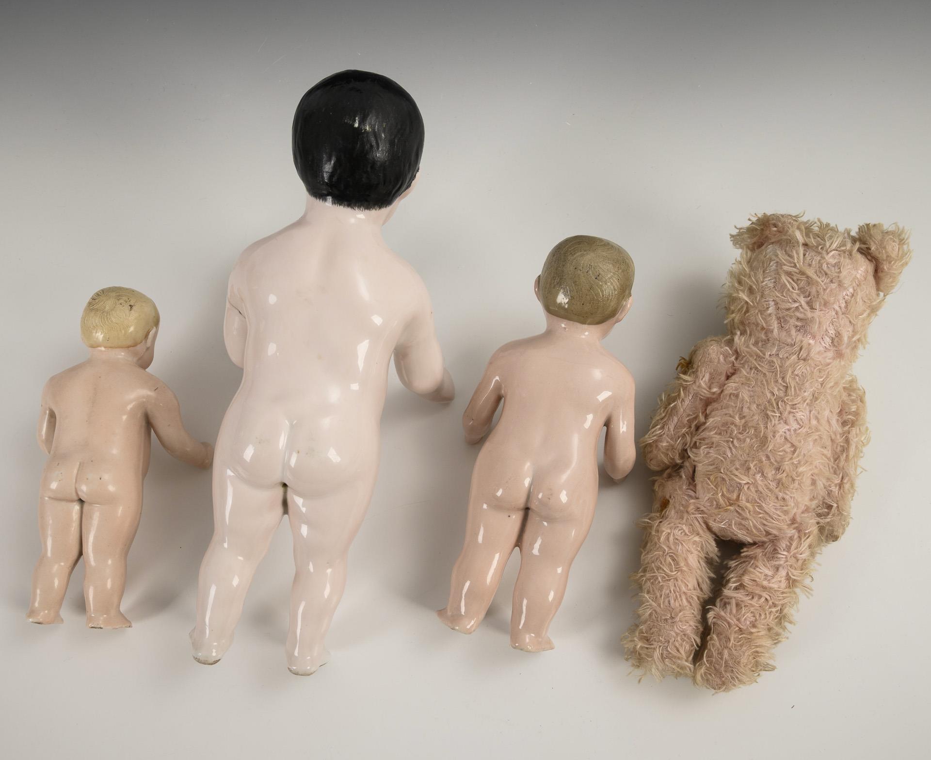 Sogenannter Nacktfrosch oder Frozen Charlotte. Badepuppen in 3 verschiedenen Größen: 1x schwarzhaarig (L 29,5 cm), 2x blond (L18/21,5 cm). Dazu Teddy, 2 Eimerchen, Rassel und Steckkissen mit Miniaturteddy. 1 Arm geklebt, 1x Spalt zwischen den Beinen (wohl herstellungsbedingt?).