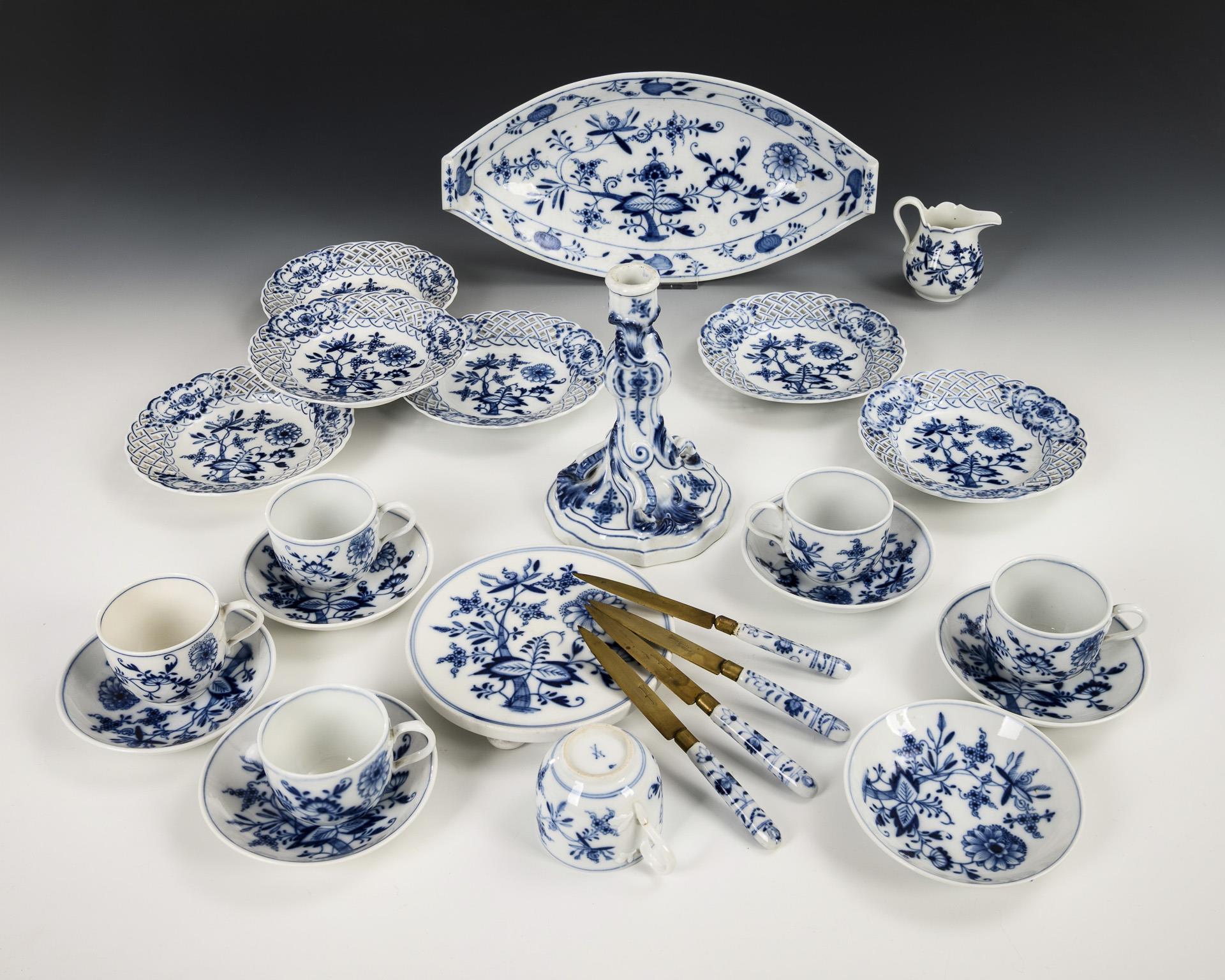 Kerzenleuchter (H 16,5 cm), 6 Tassen (H 5,5 cm), 6 Untertassen (Ø 11,5 cm), 6 Durchbruchteller (Ø 15 cm), 1 runder Untersetzer (Ø 15 cm), 1 Schale in Schiffchenform (L 33 cm) und 4 Obstmesser (L 16,3 cm). Haarriss in 1 Tassenhenkel, 1 Tassenhenkel geklebt.