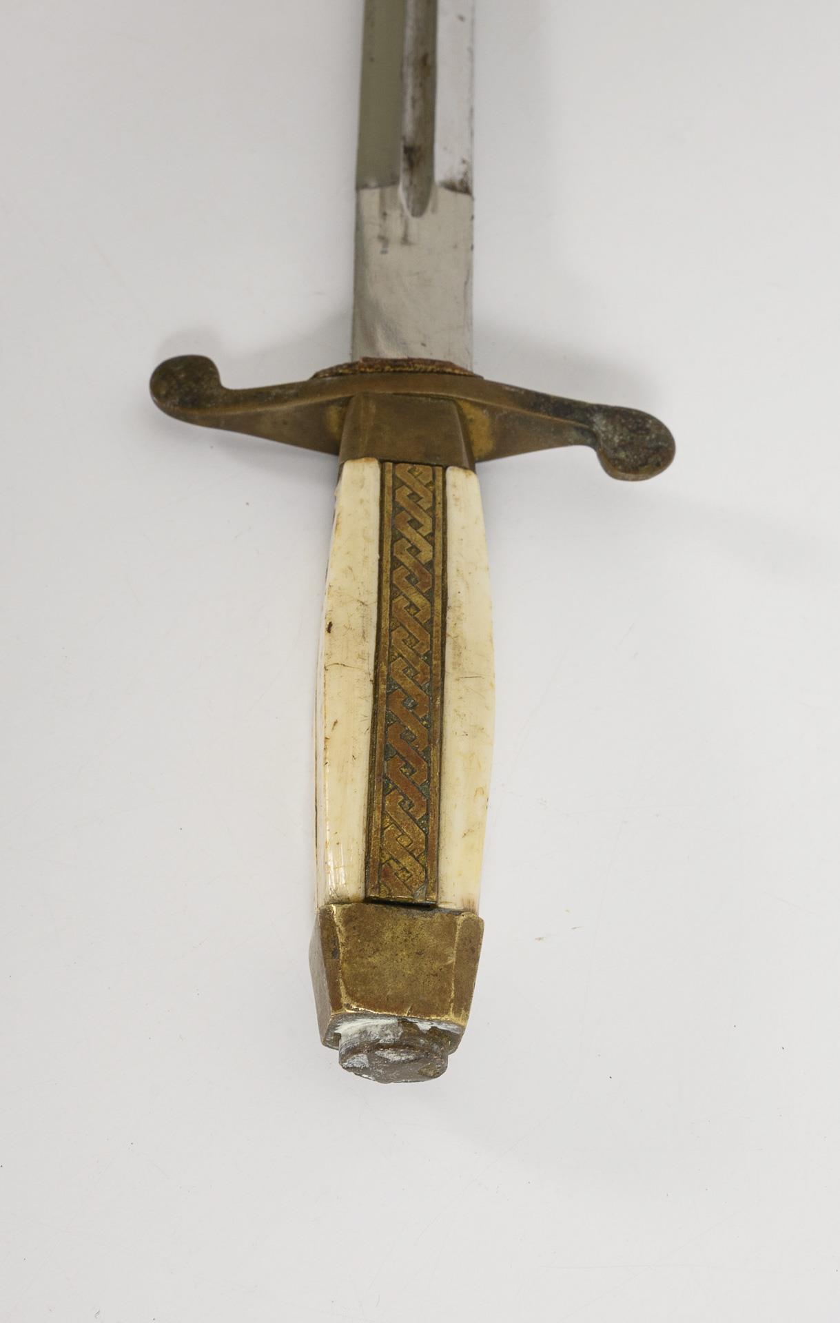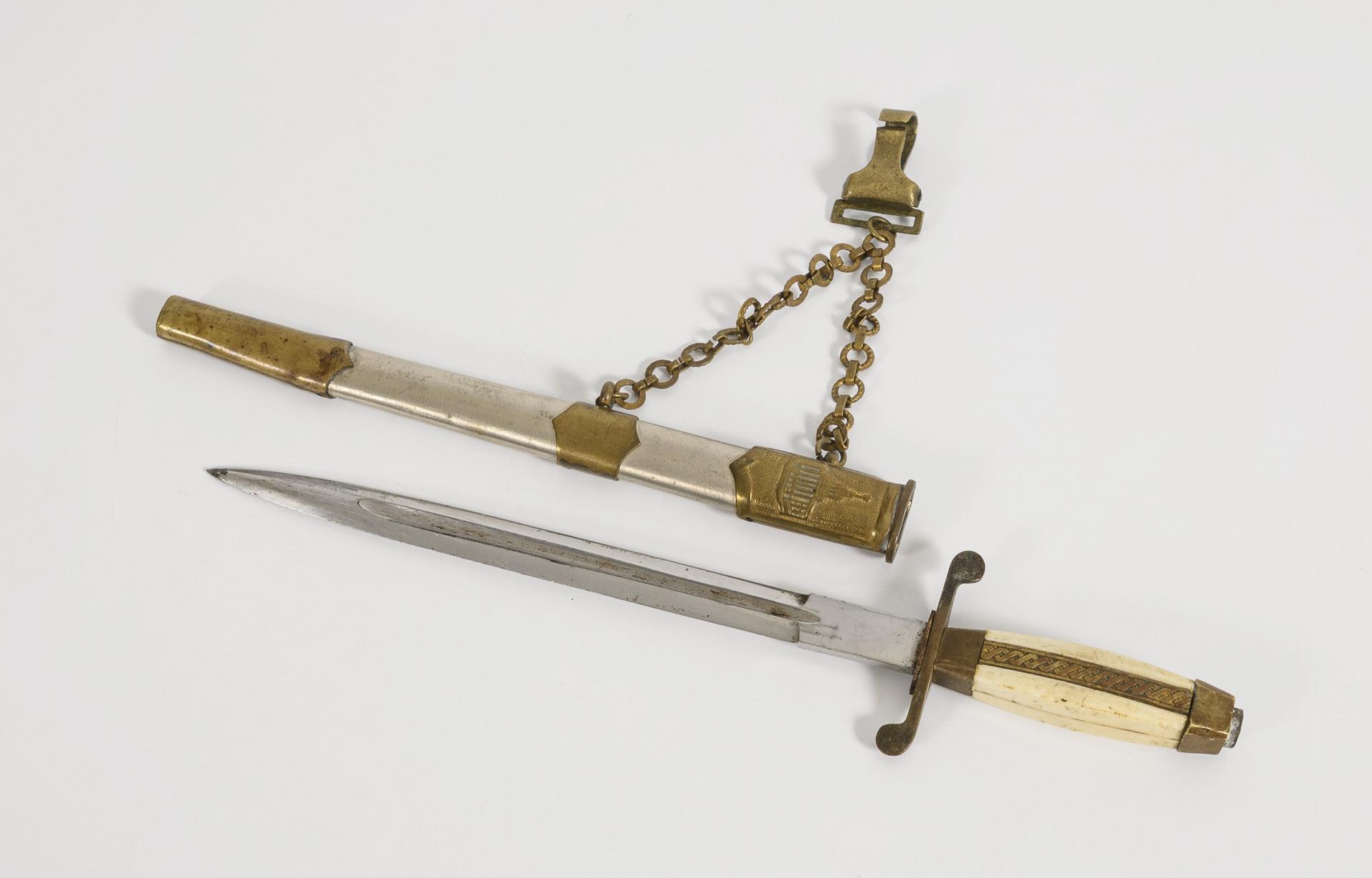 Zweischneidige, dicke Klinge mit Spitze in der Mittellinie und tiefem Hohlschliff in der Mitte. Cremefarbener Kunststoffgriff, Knauf mit Stern. Gehänge mit scheibenartigen Kettengliedern. Griffschalen mit Kratzern.