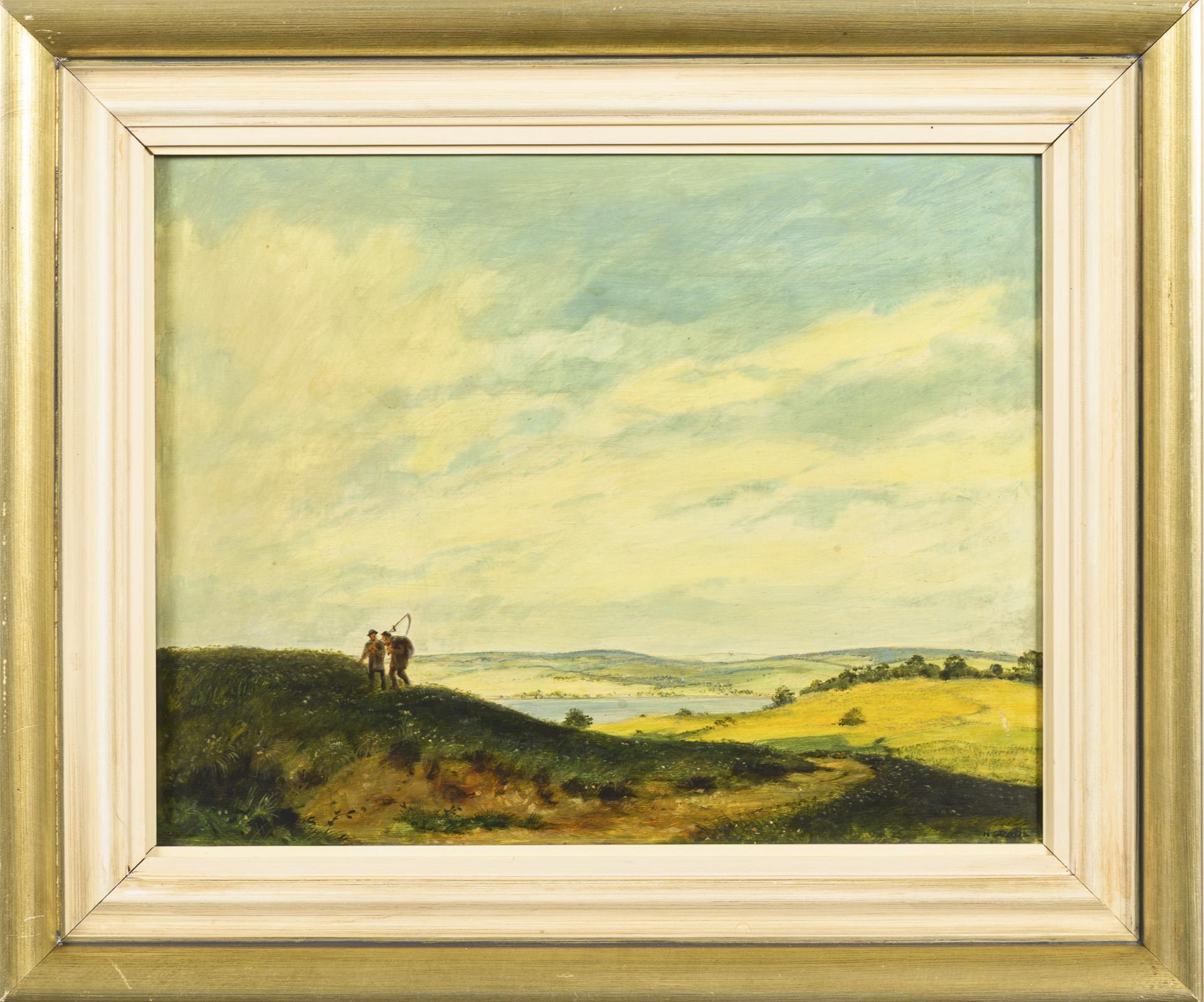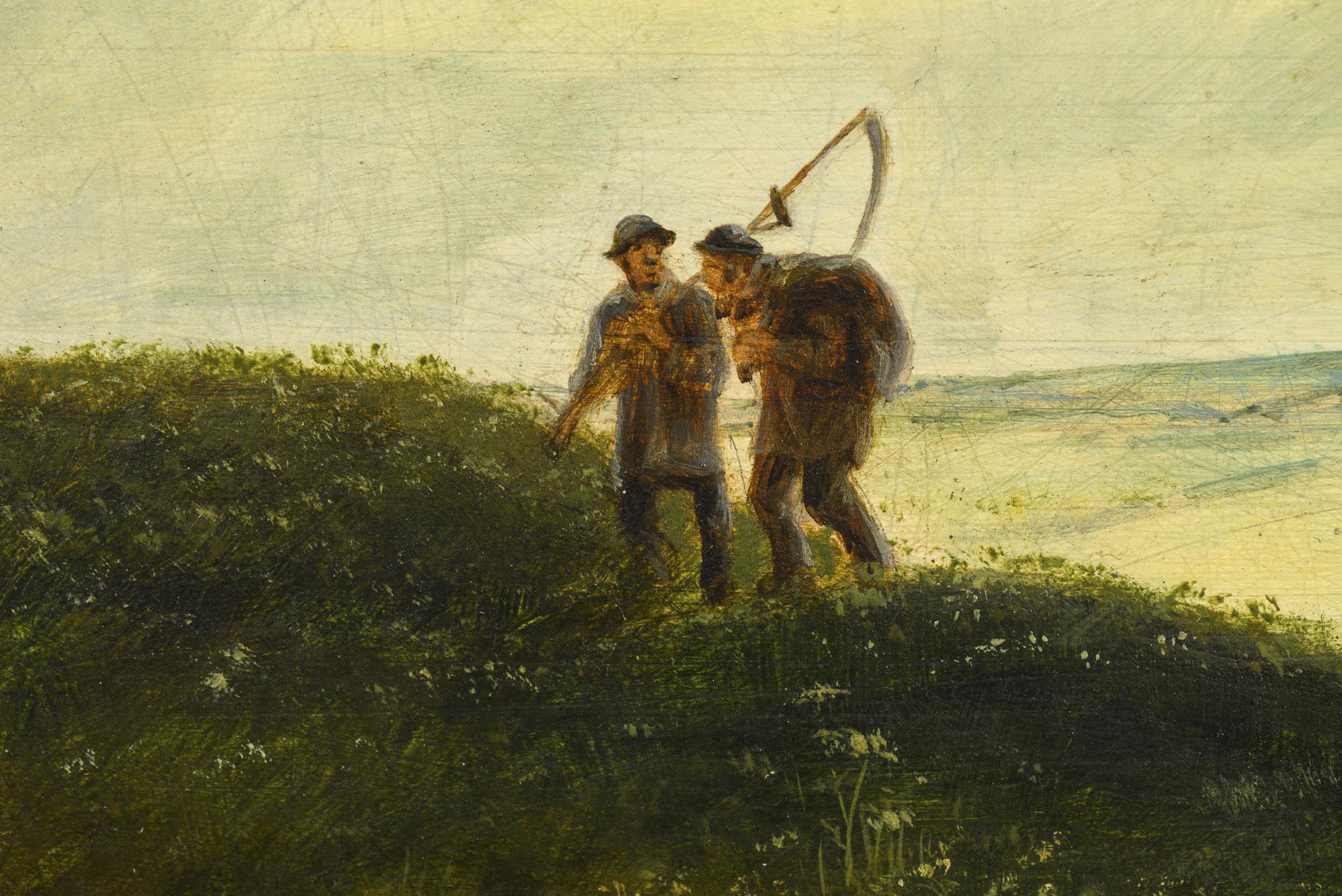 Zwei Bauern mit Sense in weiter hügeliger Landschaft unter wolkigem Himmel.