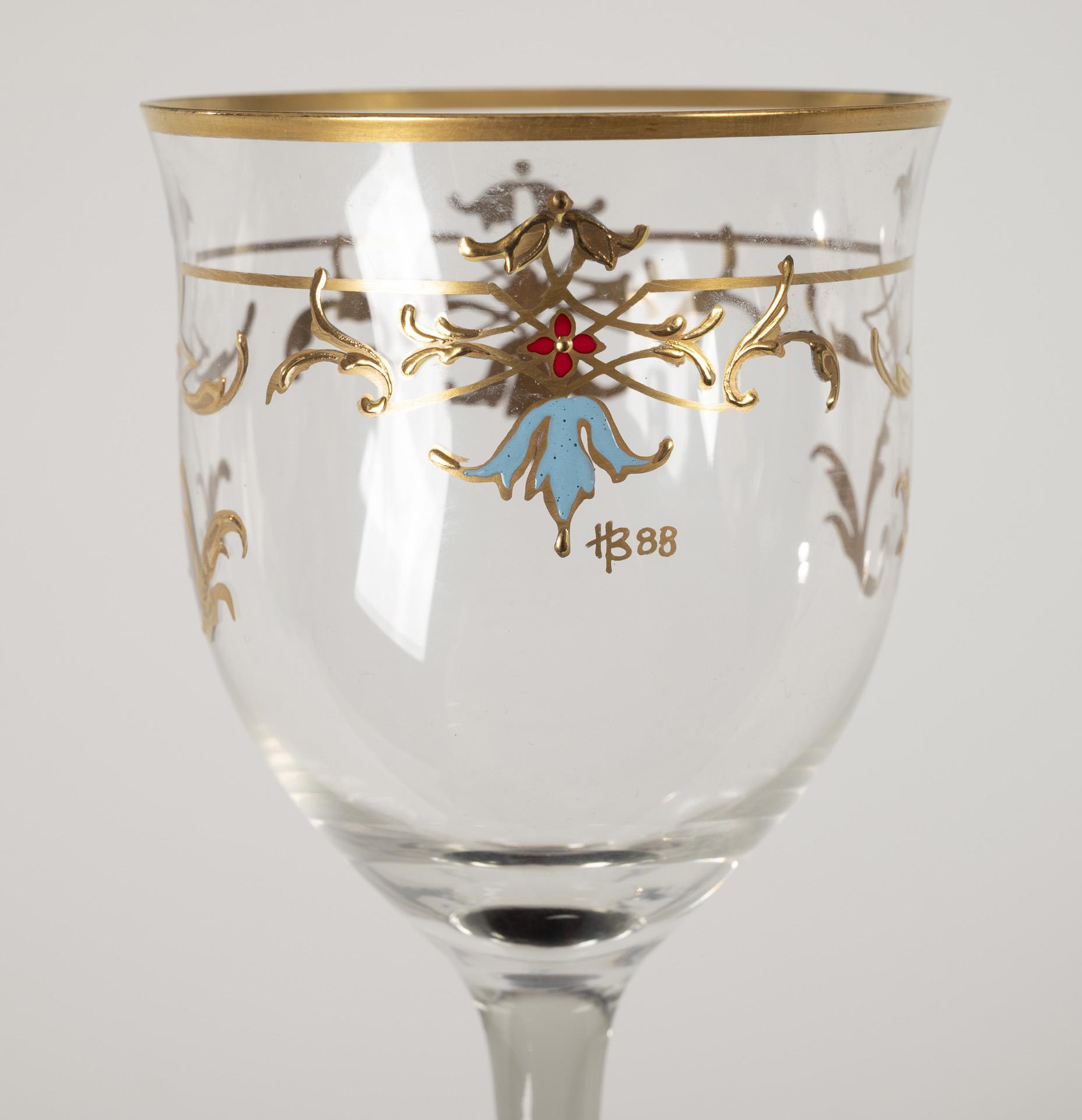 Glockenkuppa aus farblosem Glas, mittig verdickter Stängel und Rundfuß aus rauchigem Glas. Auf der Kuppa zartes Linien- und Floraldekor in Gold, Reliefgold sowie türkiser und roter Emailfarbe.
