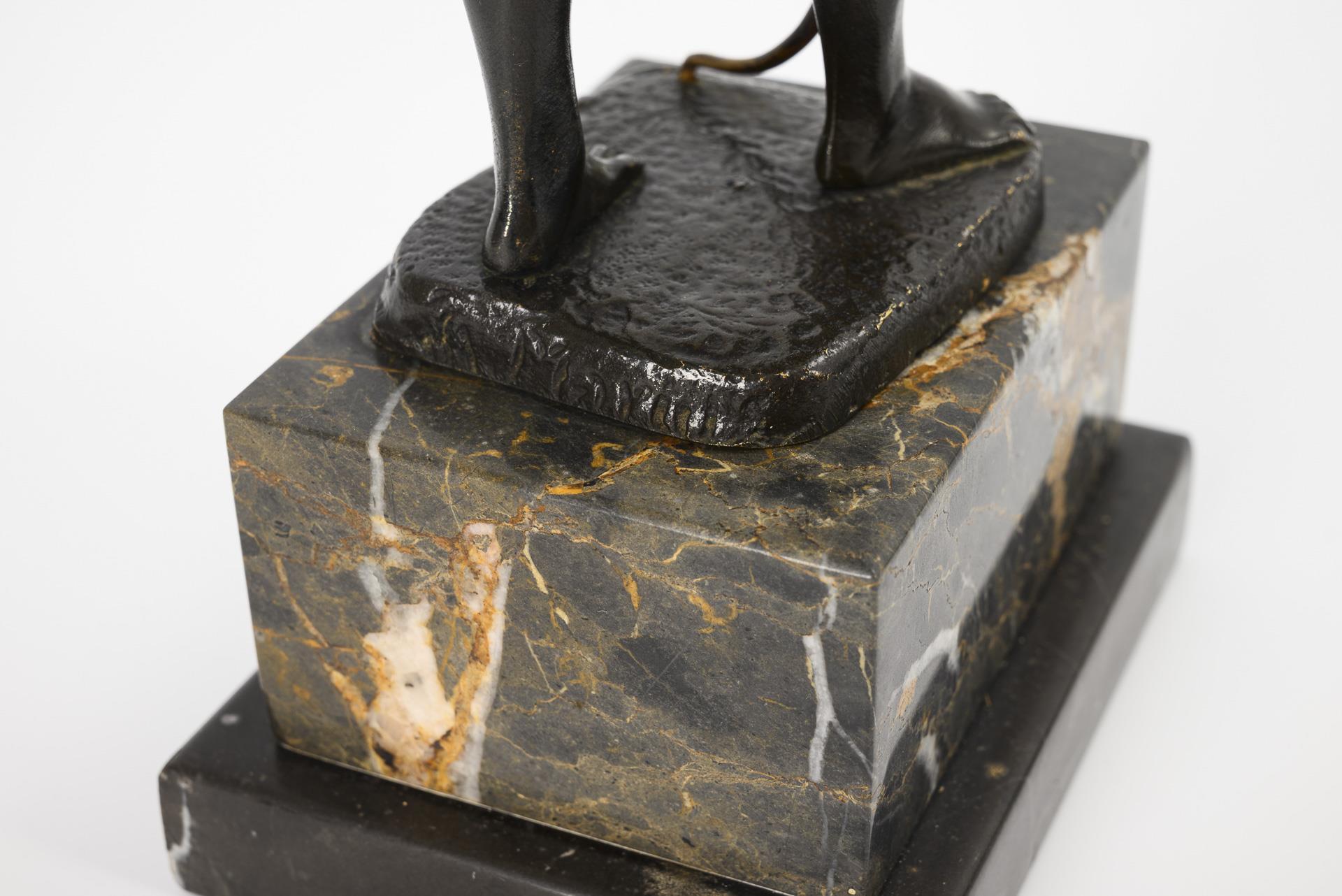 Bronze schwarz patiniert, dunkler Marmor-Sockel. Undeutlich bezeichnet. H 23,5 / 30 cm. 2,7 kg.