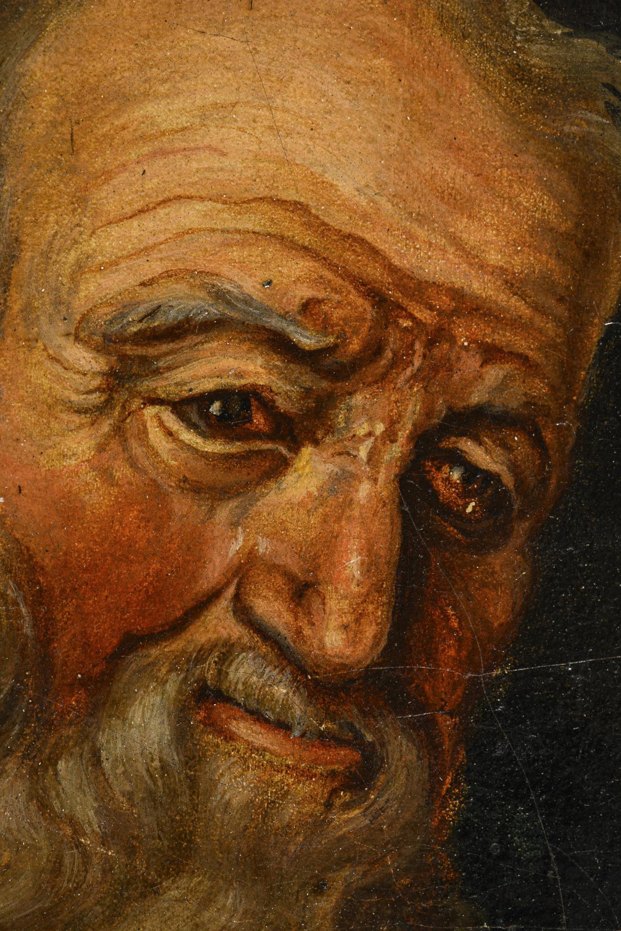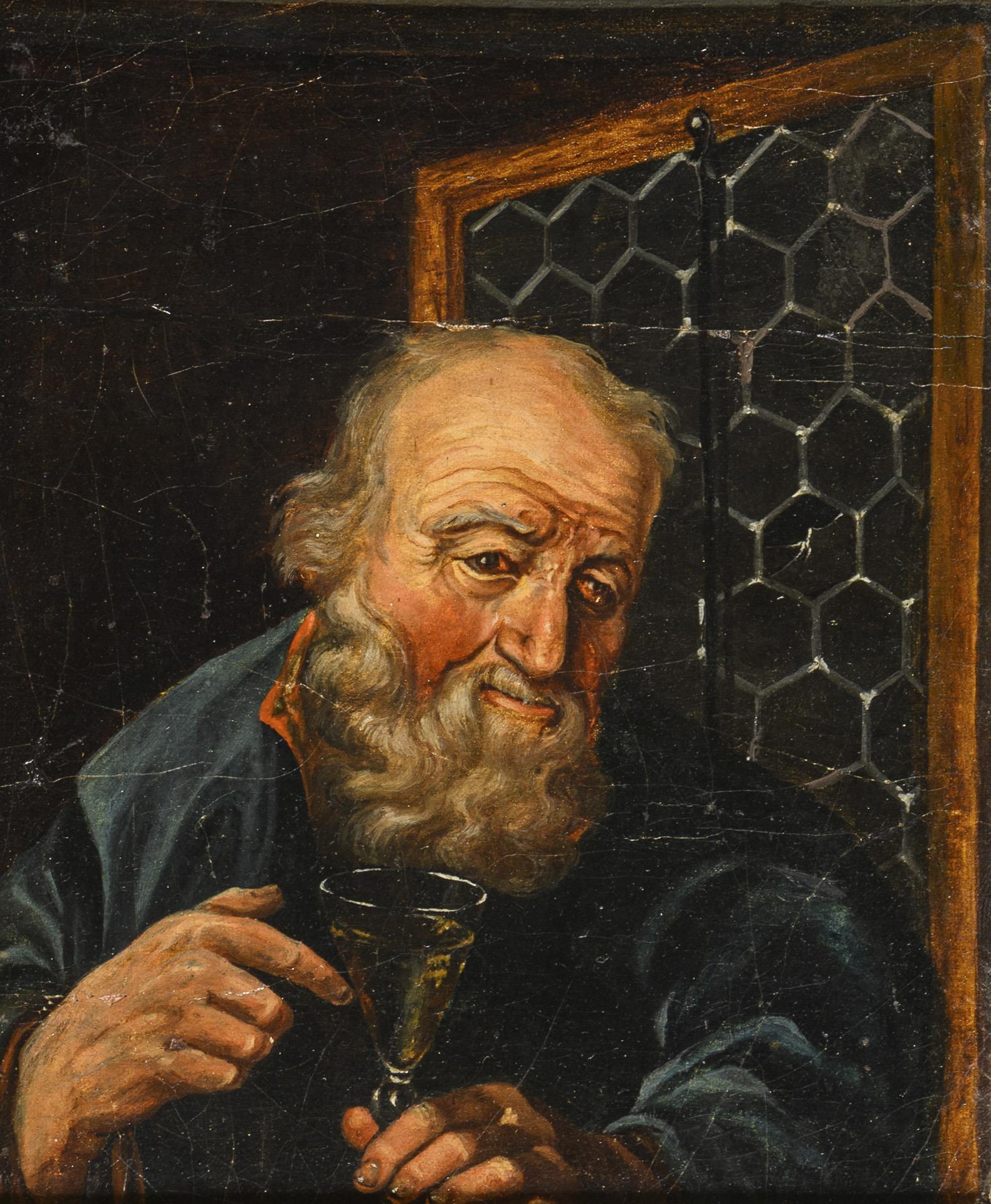 Bildnis eines alten Mannes mit Vollbart und Weinglas. Altersspuren.