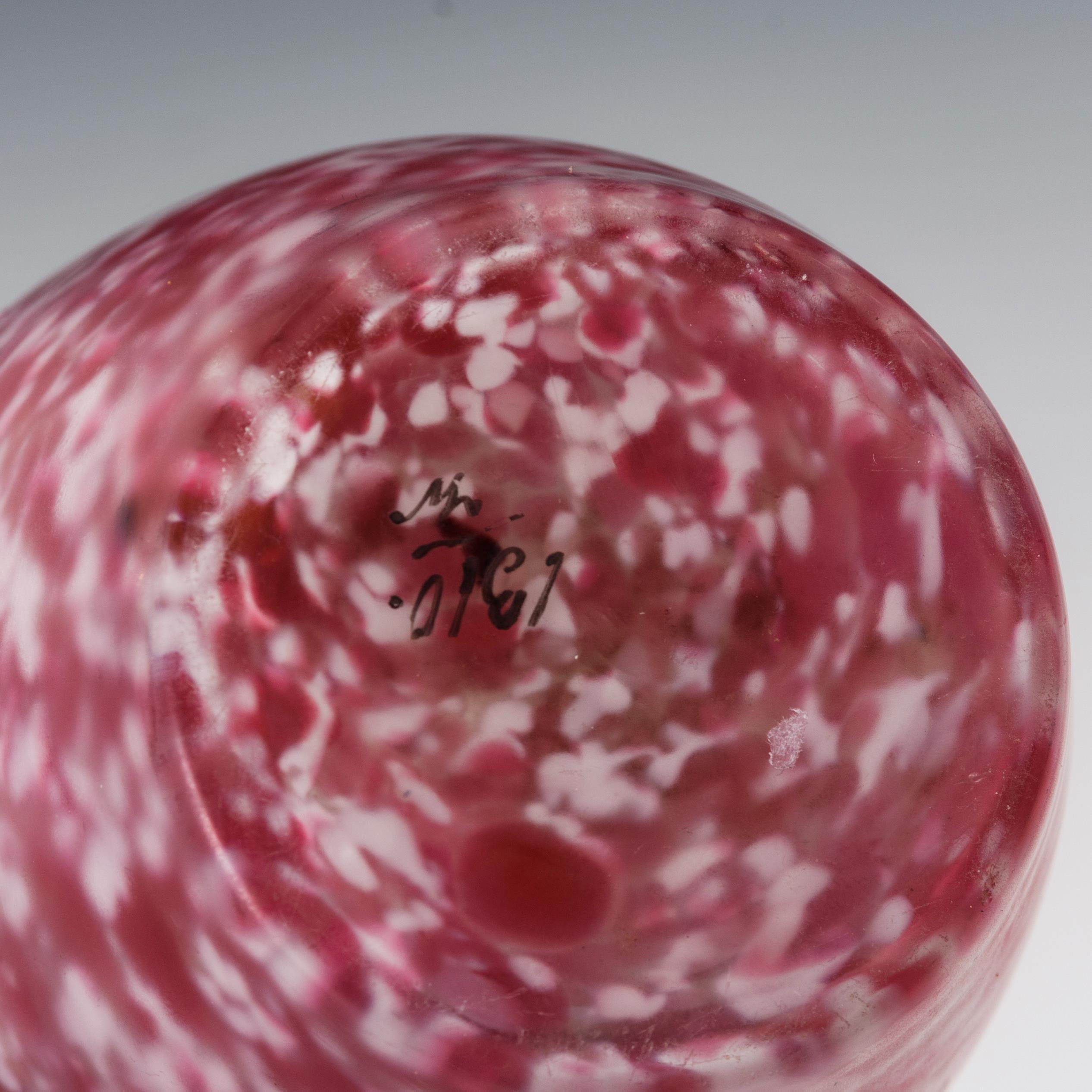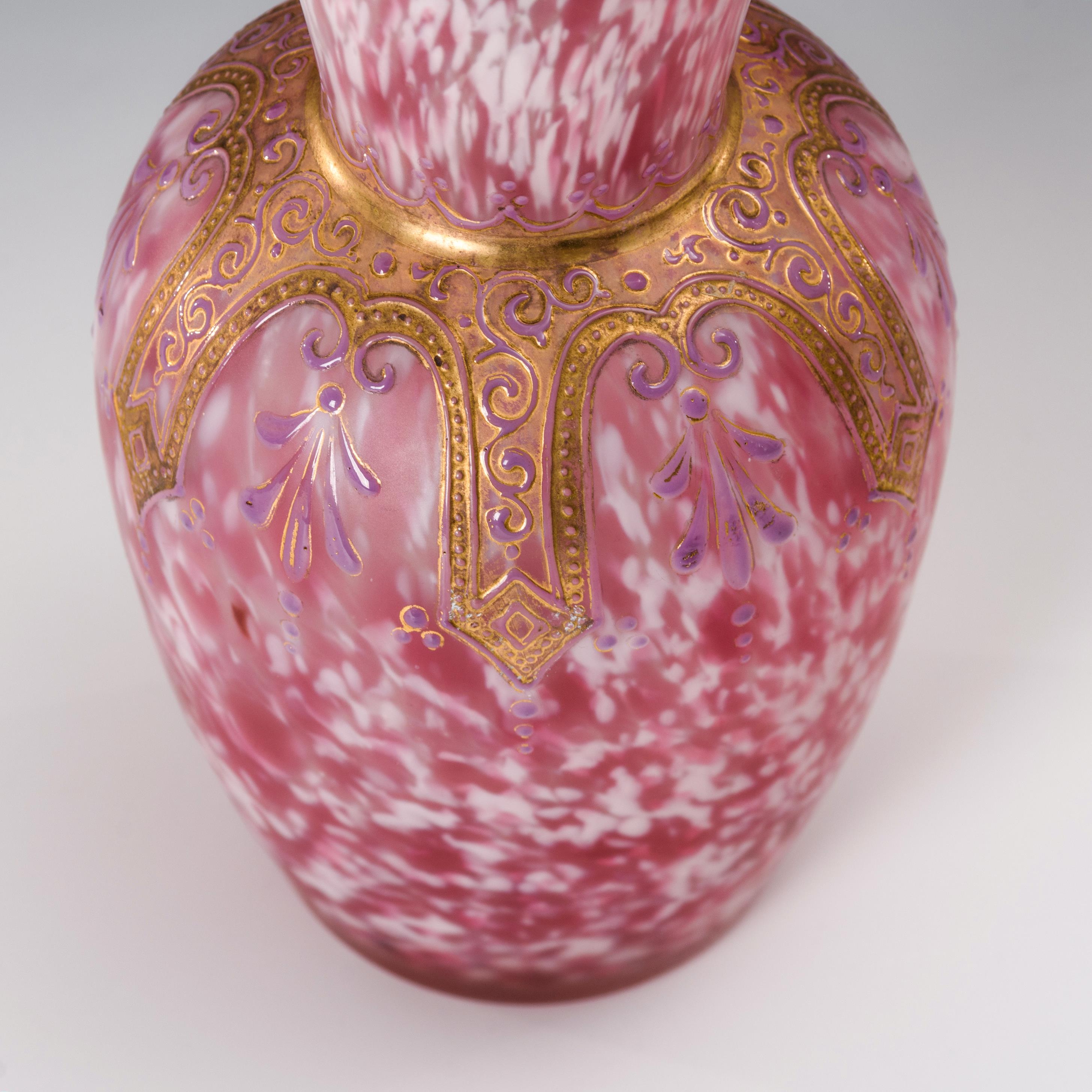 Farbloses, mattiertes Glas mit eingeschmolzenen, weiß- und rotopalen Kröseleinschmelzungen in der Zwischenschicht. Ornamentdekor in violettem Reliefemail und Reliefgold. H 16,5 cm.