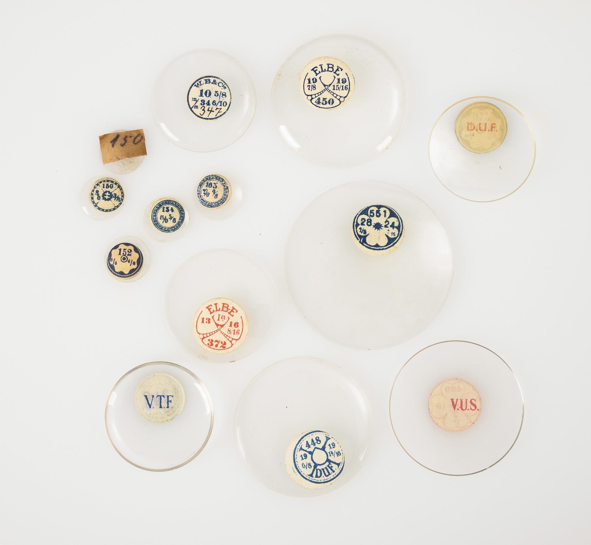 3 Kästen mit verschieden großen, vorzüglich gewölbten Uhrengläsern für Taschenuhren, darunter D.U.F., Walter Berger & Cie., Elbe, V.U.S., V.T.F.. Größe 150 bis 551.