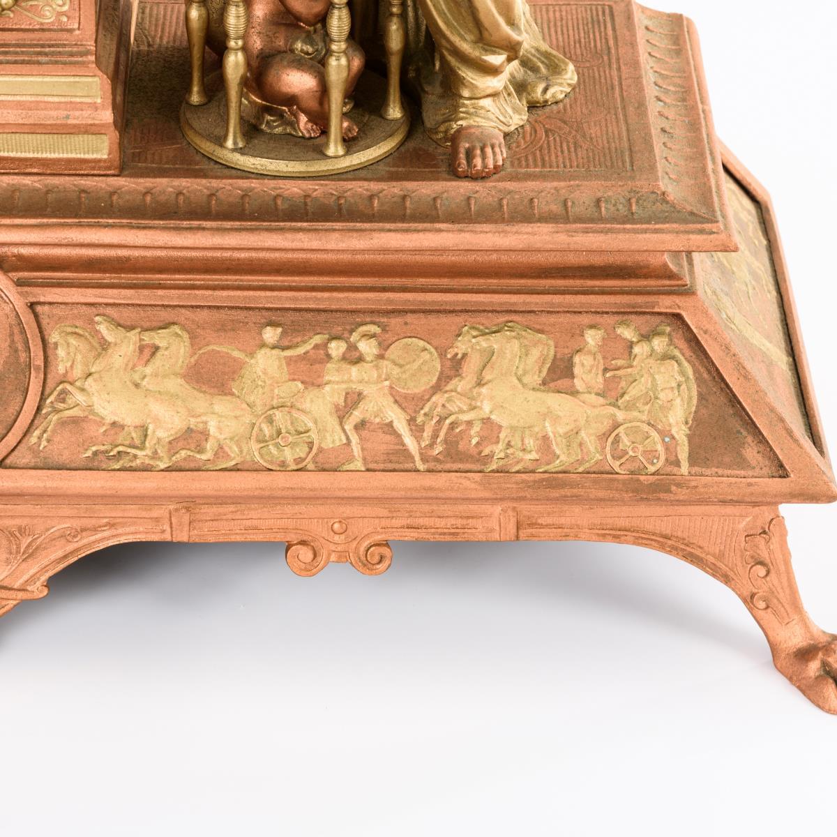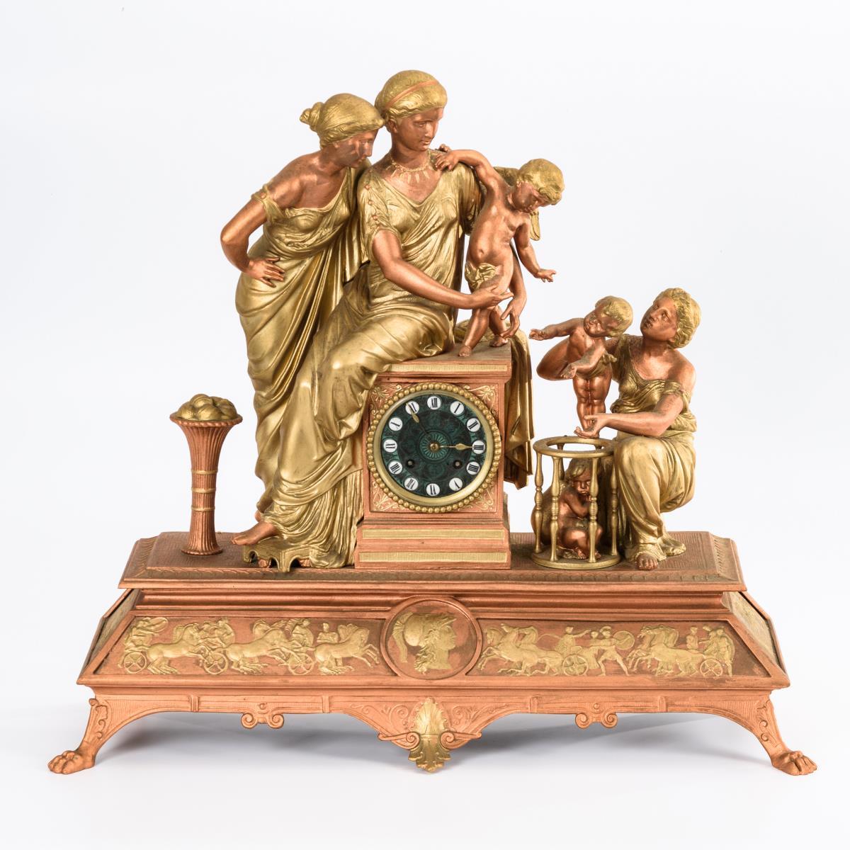 Pendule mit antikisierendem Sockelfries und plastischen weiblichen Antikenfiguren mit geflügelten kindlichen Liebesgöttern. Nach dem Vorbild des antiken pompeianischen Wandgemäldes in der Villa Arianna bei Stabiae, die um 1760 ausgegraben wurde. Bronzierung passend zu Kat.-Nr. 782. Läuft. Leichte Alters- und Gebrauchsspuren, Gehäuse nachbronziert.