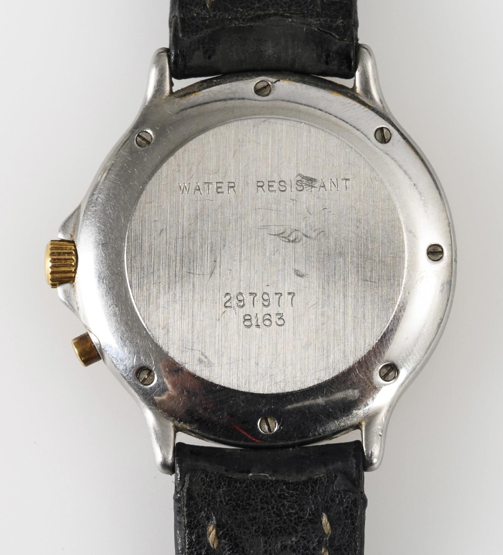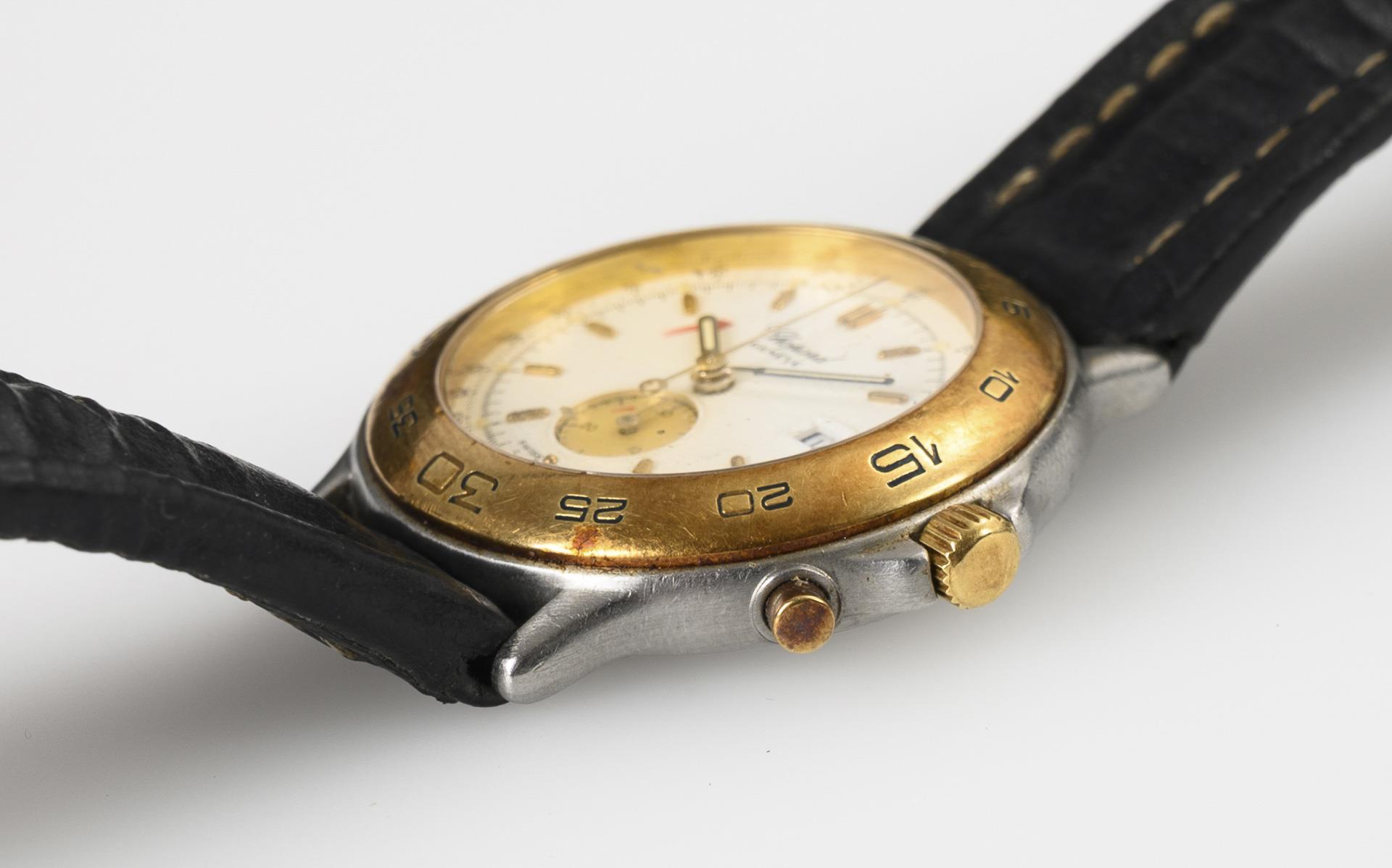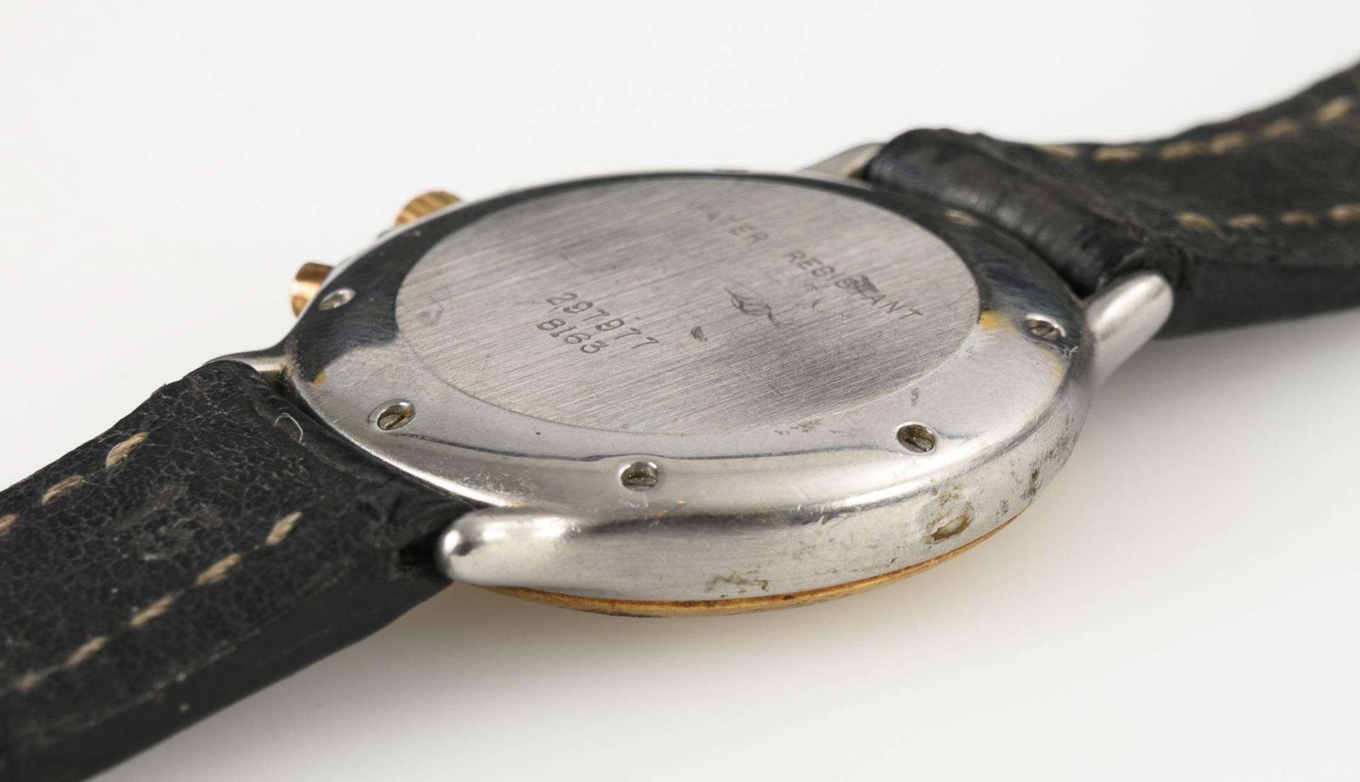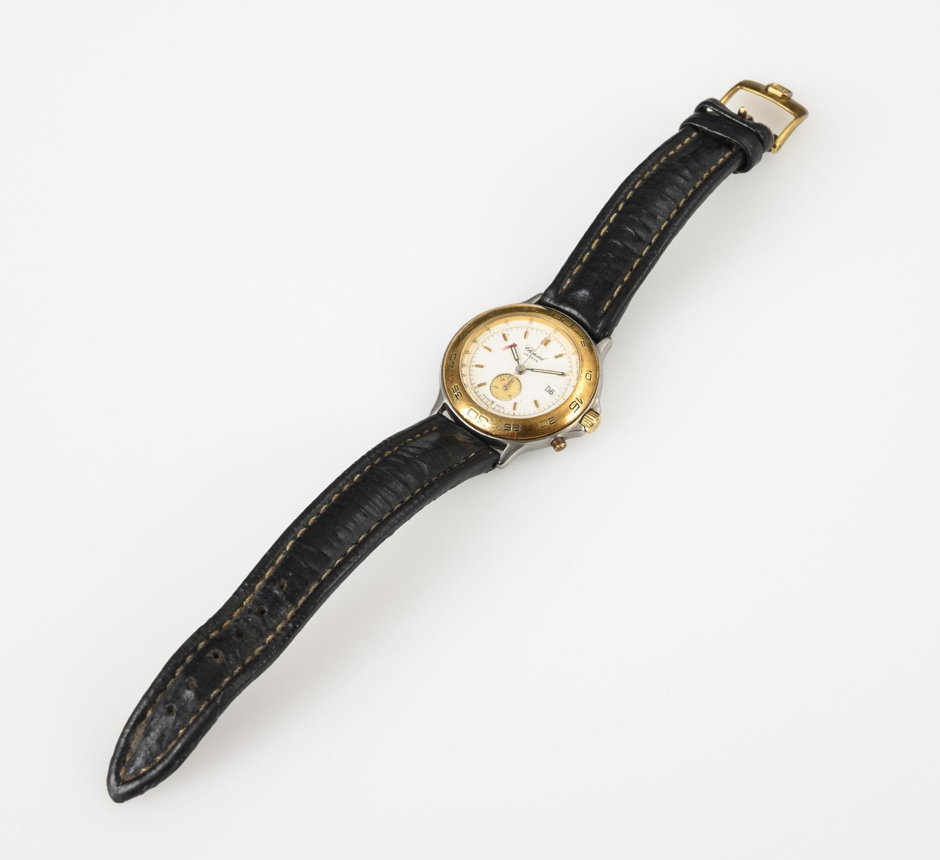 Rundes Bicolor-Gehäuse mit breiter Lünette mit arabischen Zahlen, seitlicher Drücker für Stoppfunktion, verschraubter Gehäuseboden. An schwarzem Lederband mit Dornschließe. Alters- und Gebrauchsspuren, Tragespuren.