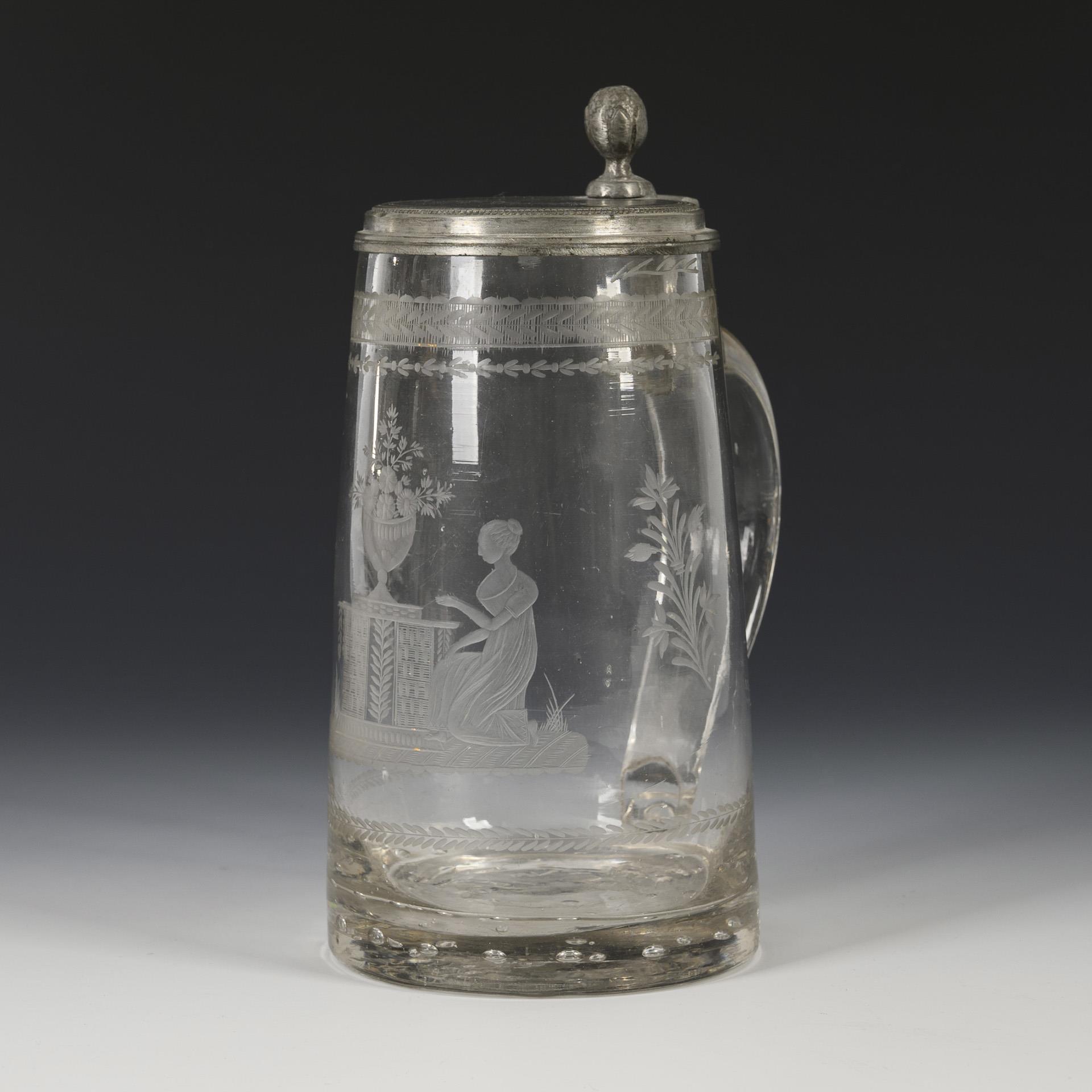 Leicht konischer Korpus mit eingestochenen Luftblasen im massiven Boden, Bandhenkel und zinnmontiertem Scharnierdeckel; Abriss. Schauseitig die gravierte Darstellung einer jungen, vor einem Tisch mit Blumenschale knienden Dame. Auf dem Deckel das Monogramm "M. B.".