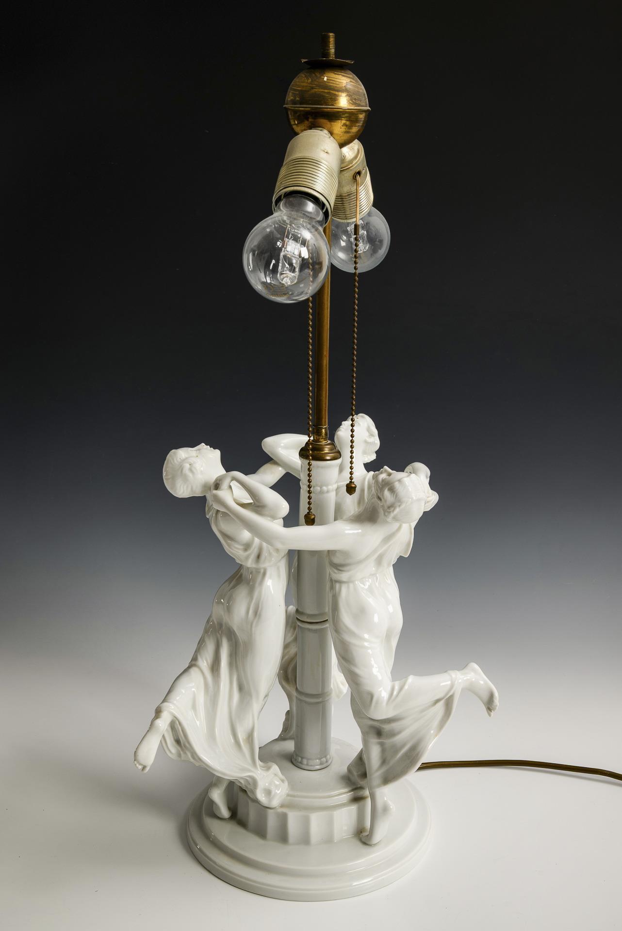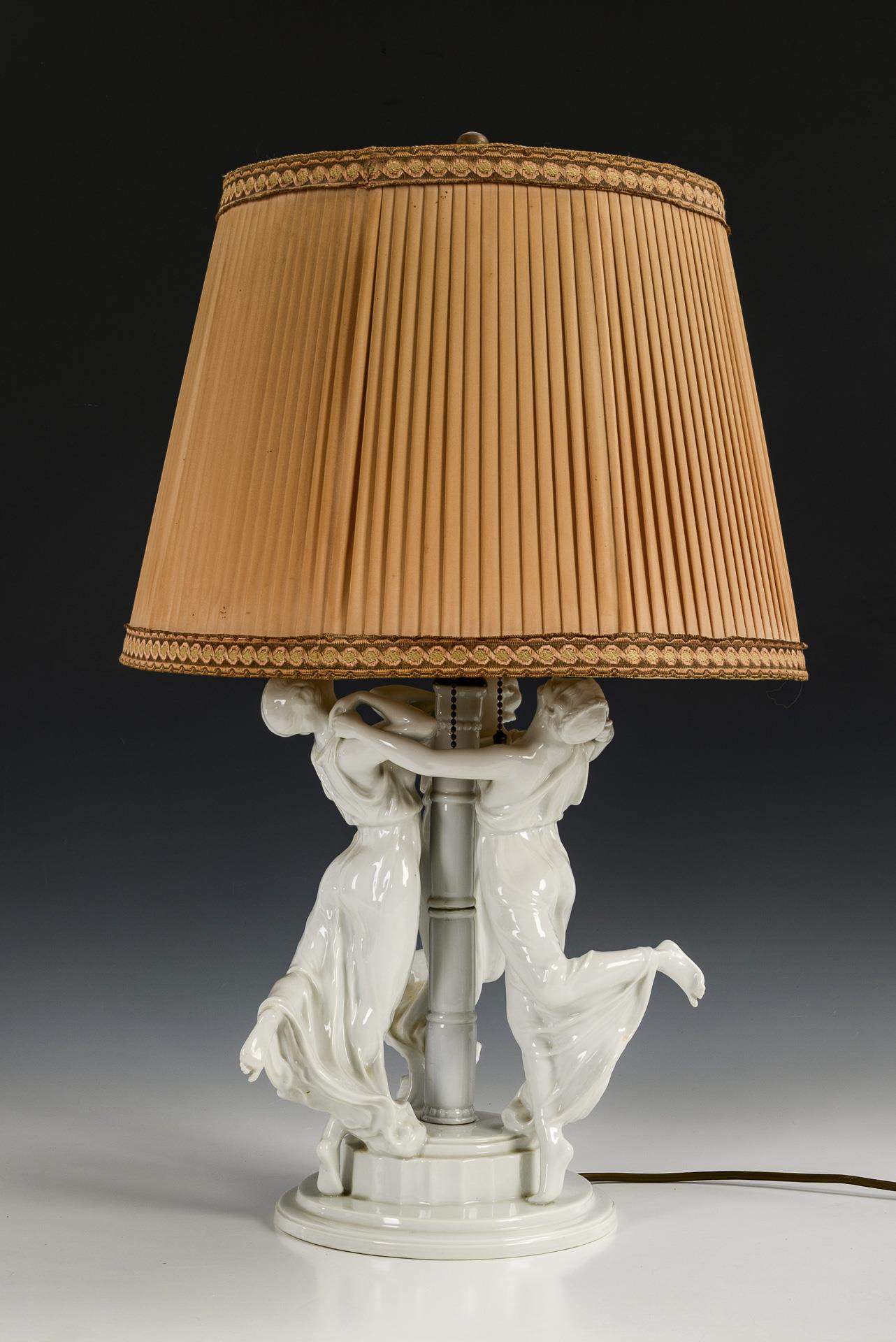 Als Lampenfuß die Plastik von drei um den Lampenschaft einen Reigen tanzenden jungen Frauen, konischer Stofflampenschirm. Elektrifiziert (Funktion nicht geprüft). 1 Fuß geklebt.