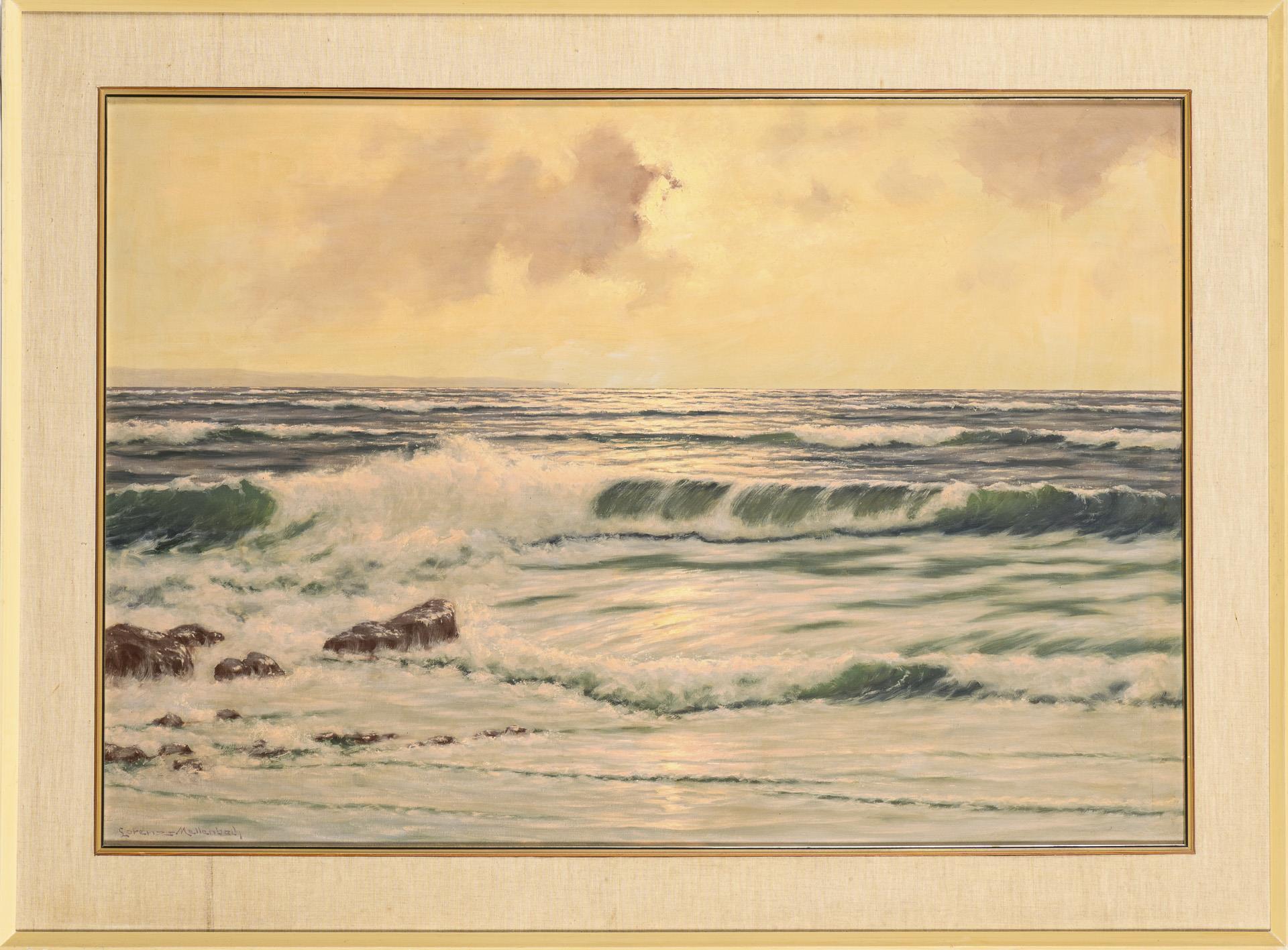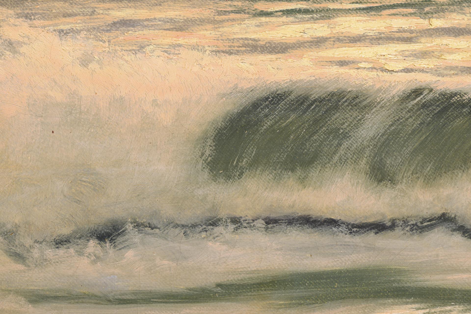 Stimmungsvolle Strandansicht mit brechenden Wellen bei tief stehender Sonne.