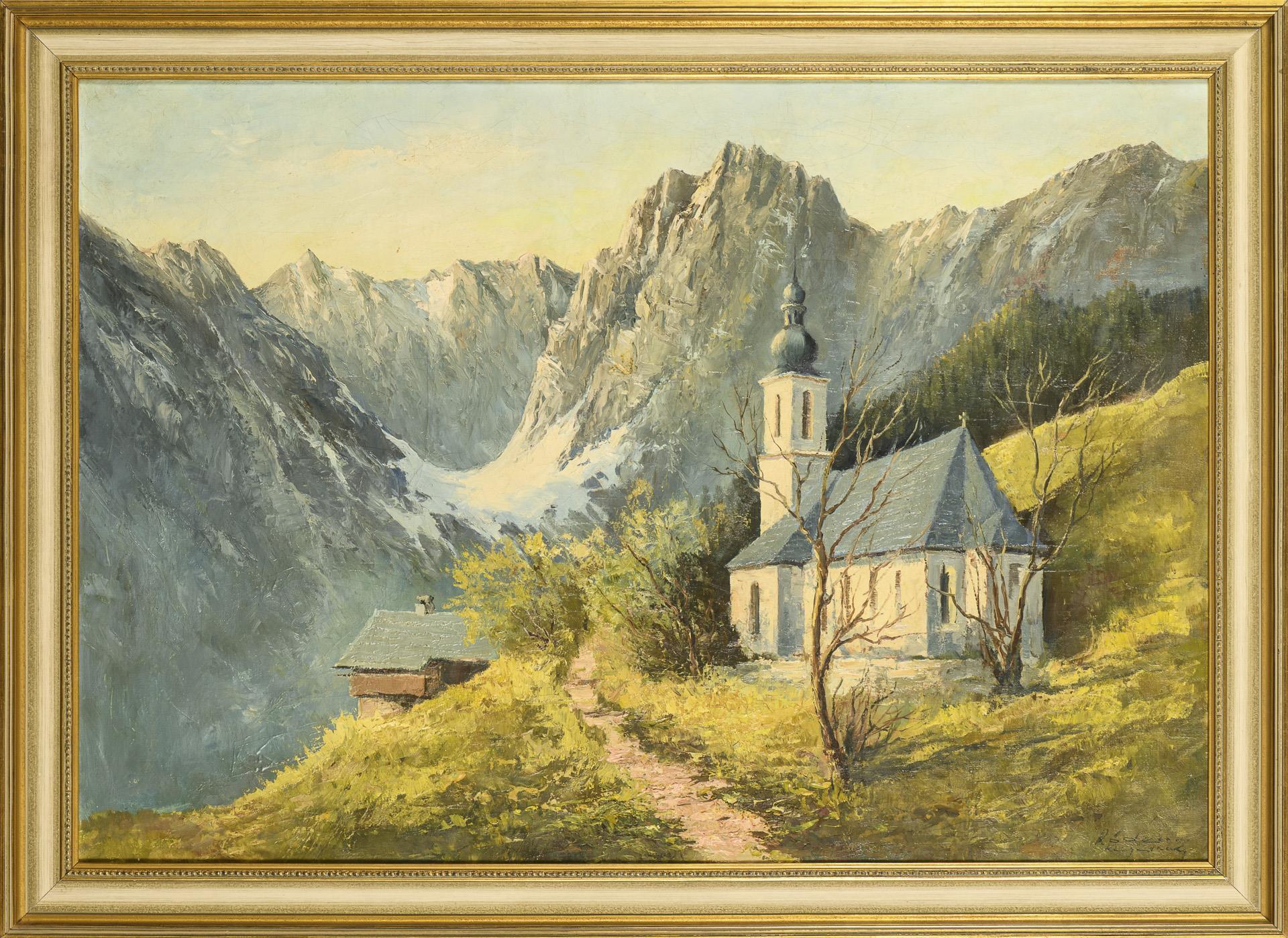 Alpenlandschaft mit der Kirche im Sonnenschein am Hang.
