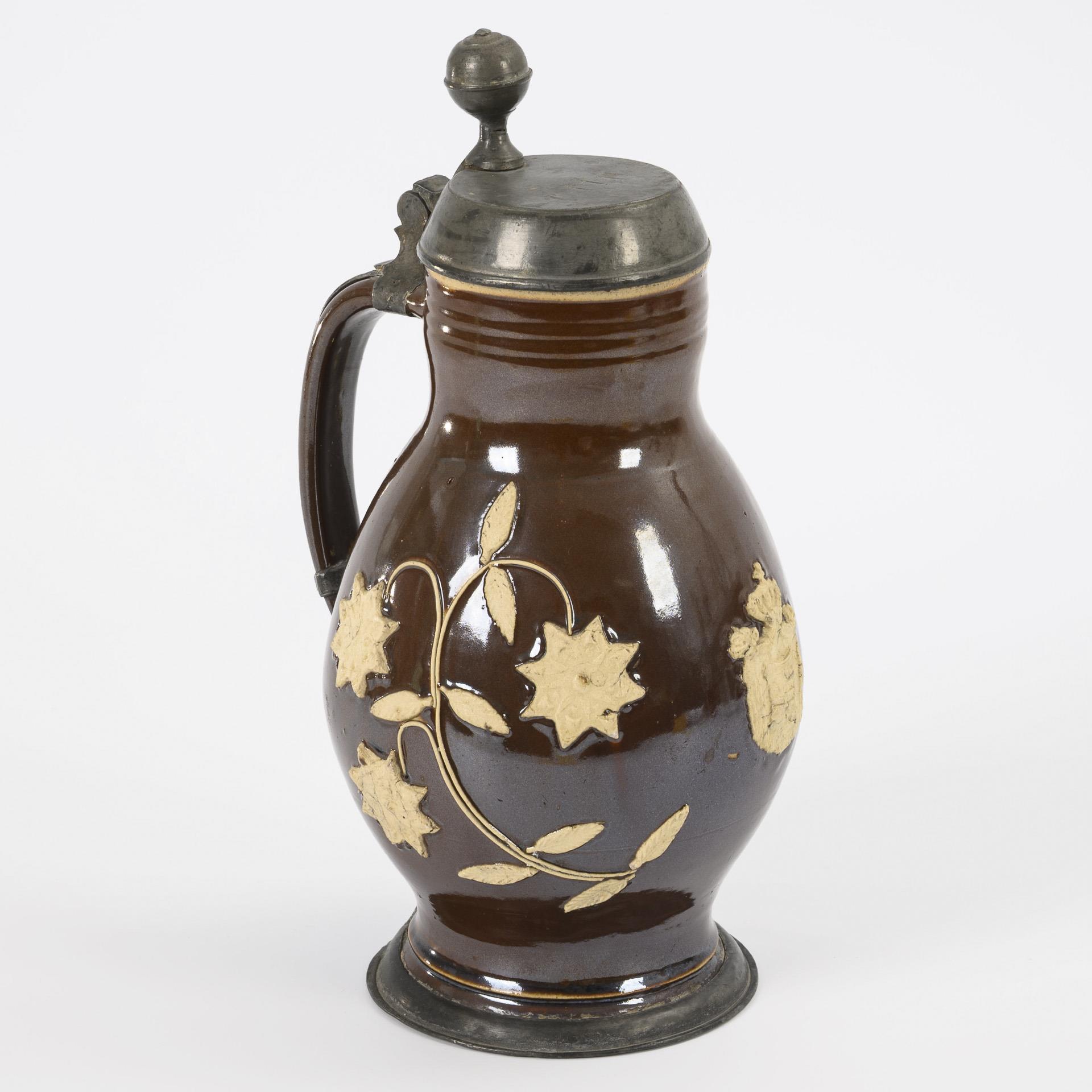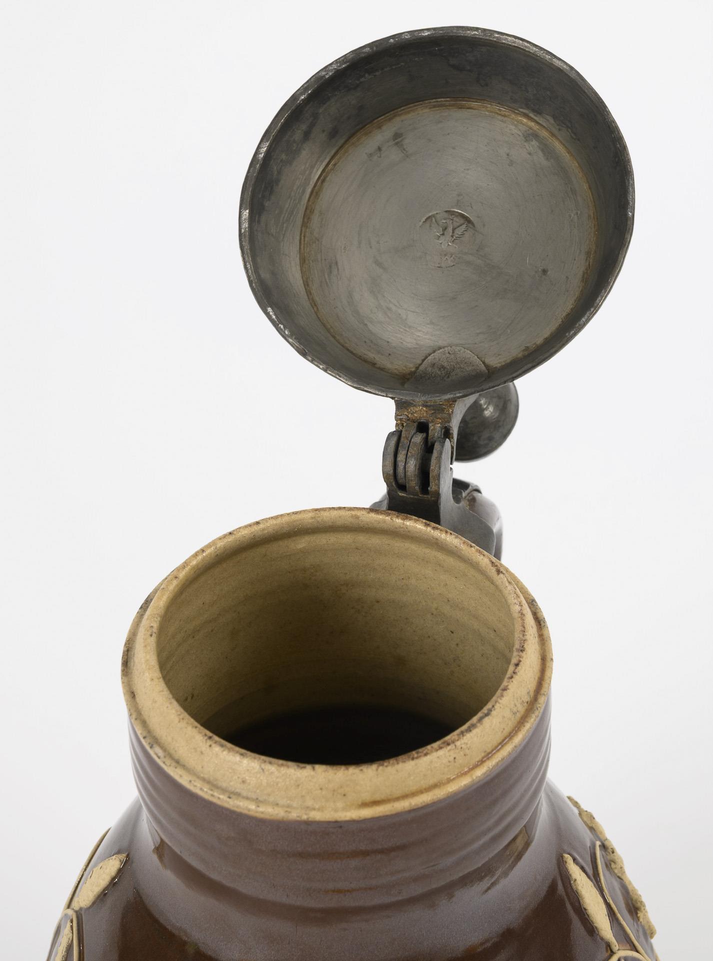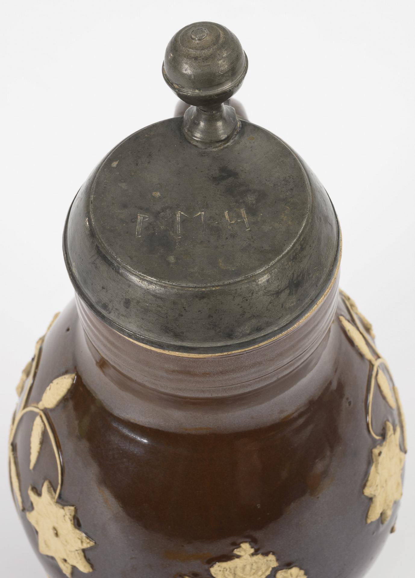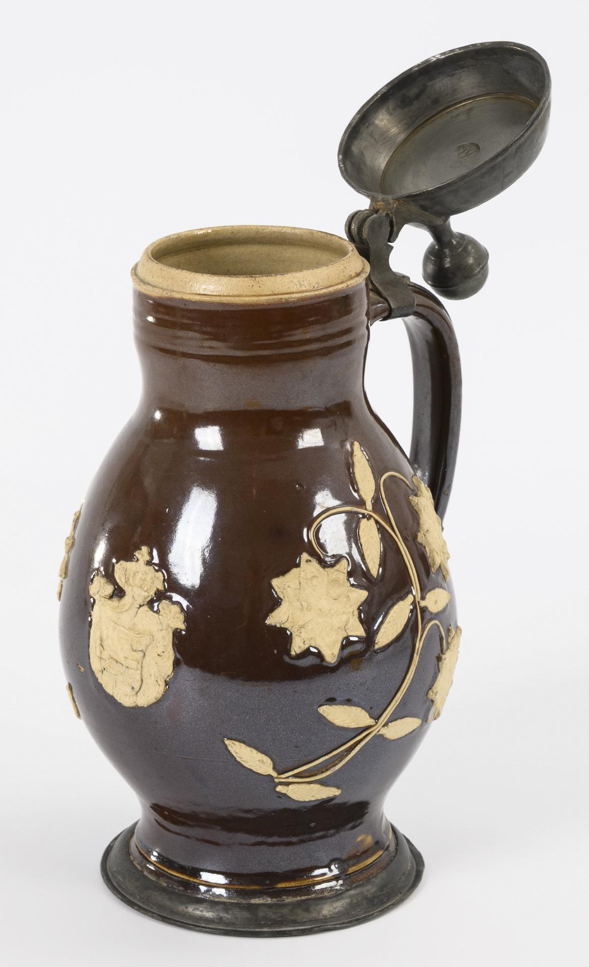 Ovoider Korpus mit vierfach gerilltem Zylinderhals und abgesetzter Lippe, Bandhenkel und eingezogenem Stand. Schauseitig ein bekröntes Wappen, flankiert von Blumenstängeln mit Blättern. Zinndeckel mit Kugeldrücker, monogrammiert PMH, Henkelband und Zinnstandring. Herstellungsbedingte Brandrisse, Zinn mit leichten Defekten.