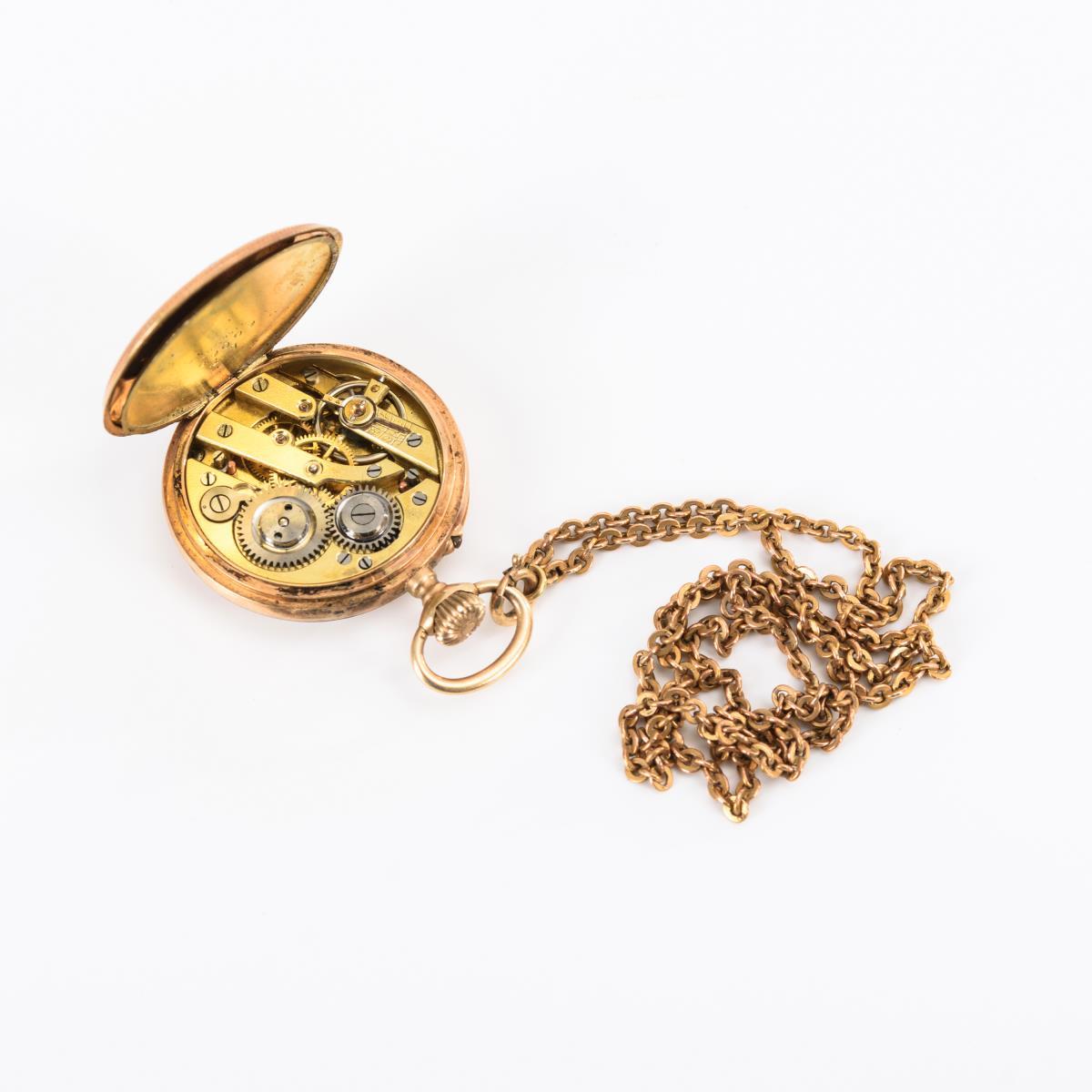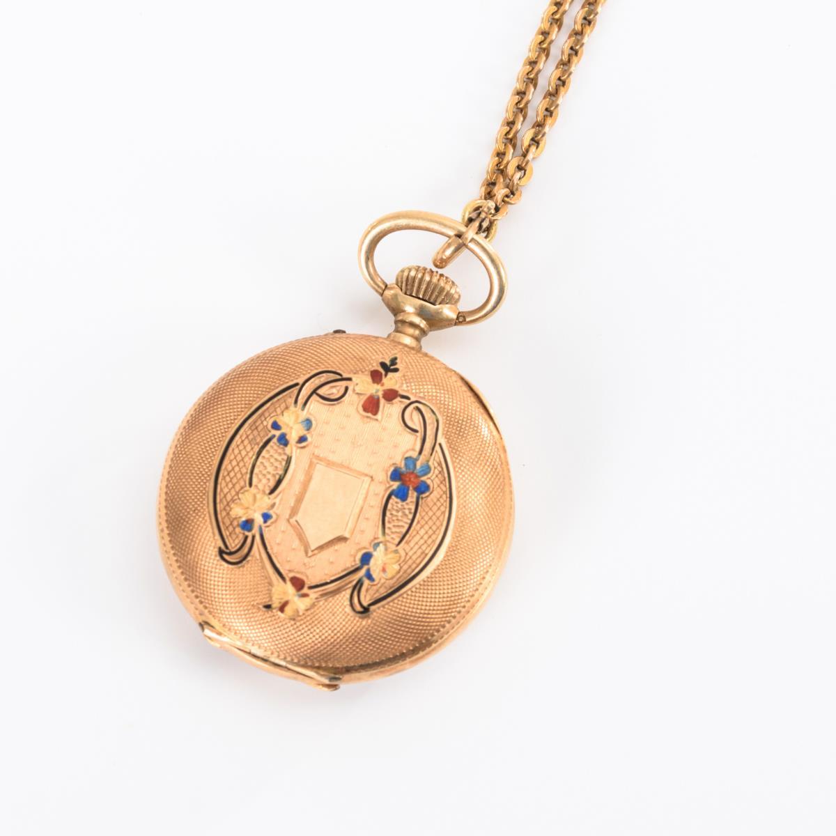 14 k, Schweizer Beschauzeichen, Feingehaltsstempel, Firmenmarke "Rhein" gepunzt, Handgravur, Staubdeckel aus Metall. Uhr Ø 2,9 cm, Kette L 41 cm. Uhr 20 g, Kette 4 g.