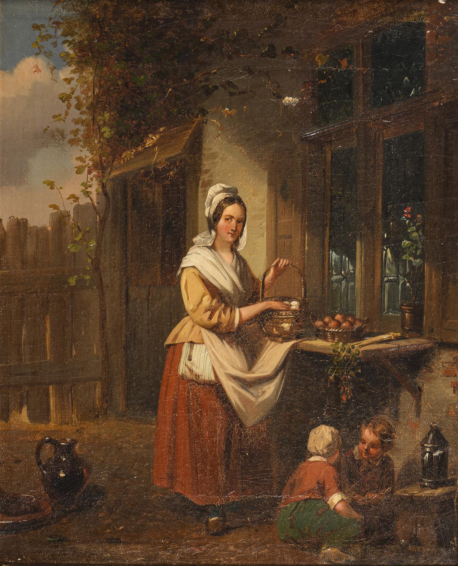 Mutter dem dem Korb voll Eier am Haus mit den spielenden Kindern. Ein Defekt.