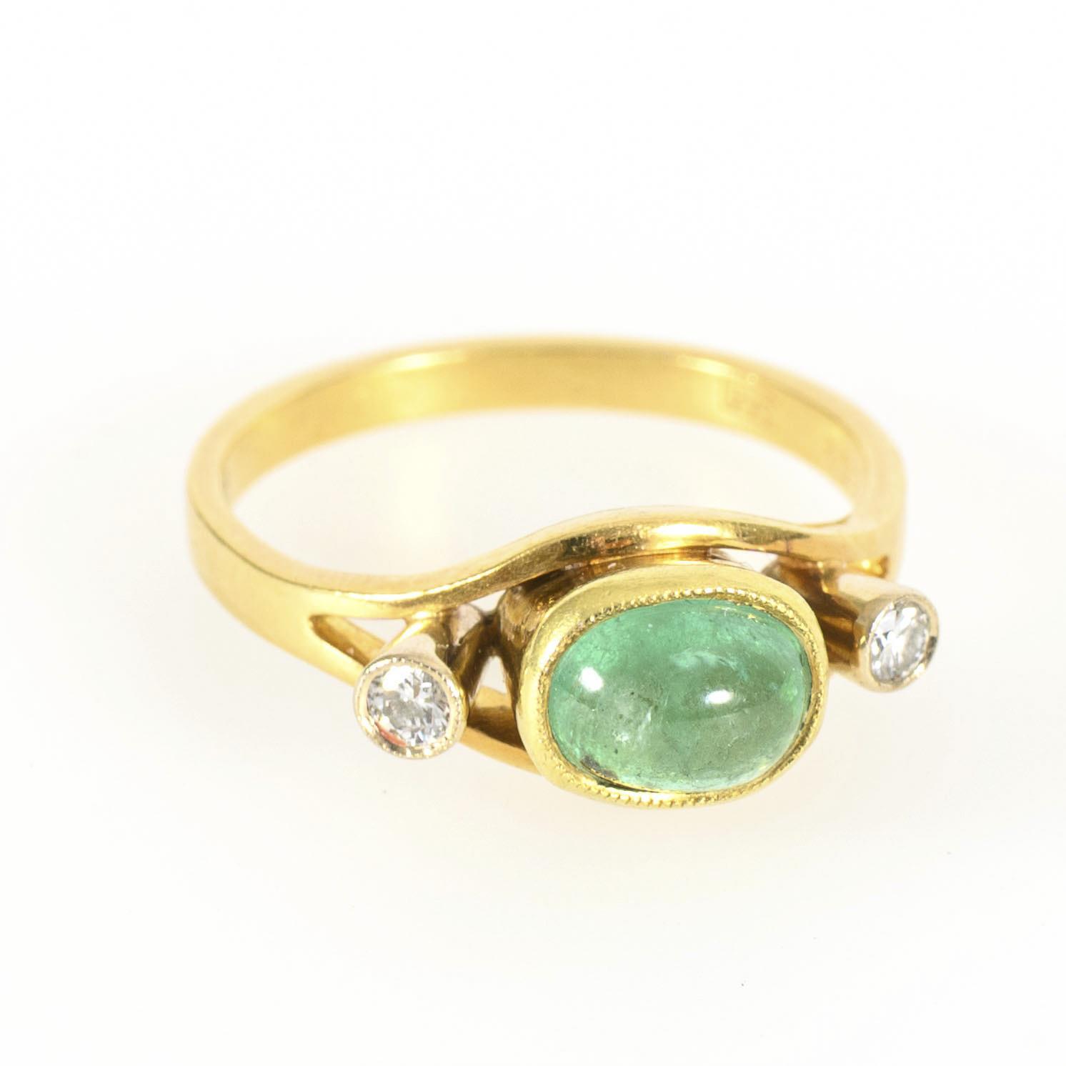 Ein grünes Farbstein-Cabochon, wohl Smaragd, flankiert von zwei Brillanten, zwischen einer sich teilenden Schiene.