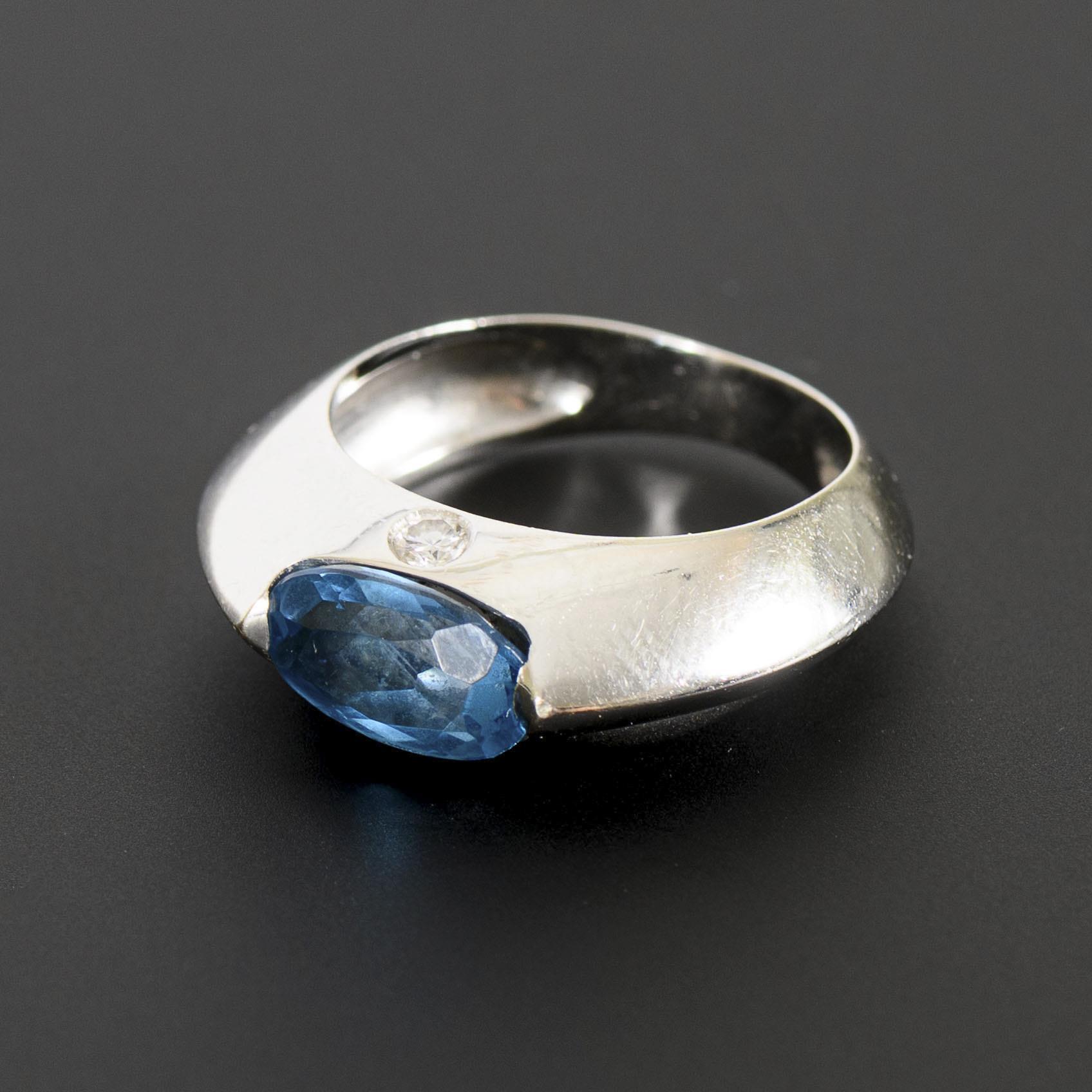 Ungewöhnlicher, moderner Design-Ring in firstartiger Ausformung mit einem leuchtend blauen Farbstein und zwei seitlich eingelassenen Brillanten. Leichte Tragespuren.