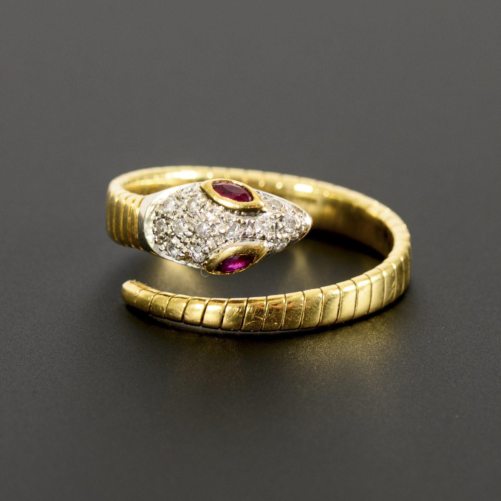 Ring in Form einer sich um den Finger windenden Schlange mit Augen aus roten Farbstein-Navetten, wohl Rubinen. Der Schlangenkörper in Gelbgold, der Kopf in Weißgold gearbeitet und mit pavégefassten kleinen Diamanten besetzt.